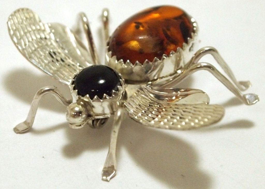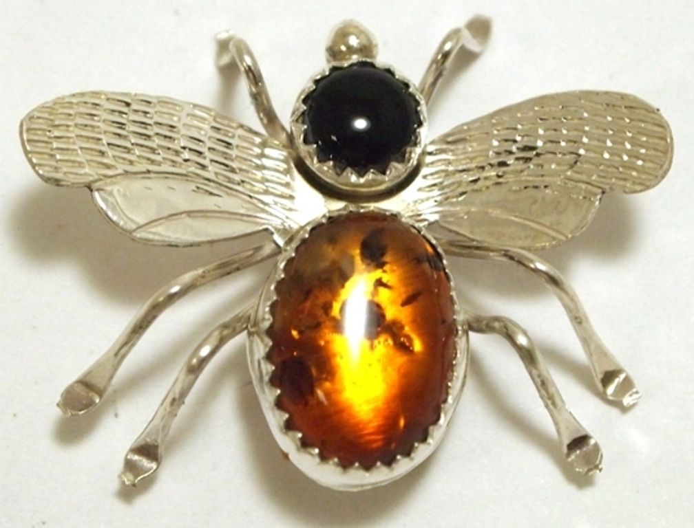 Navajo Onyx & Amber Sterling Silver Bug Pin - Juan Begay, Jr.