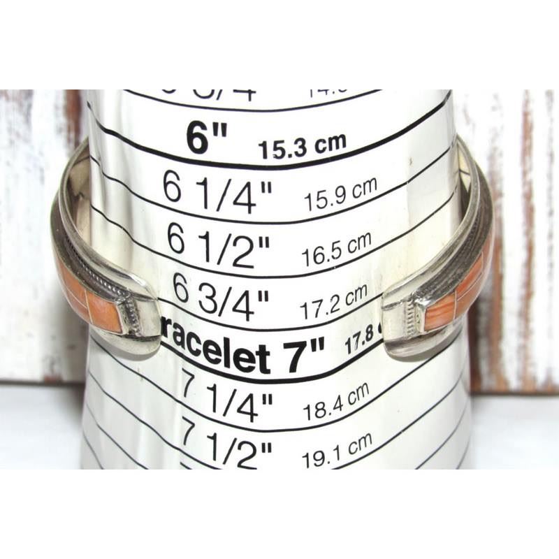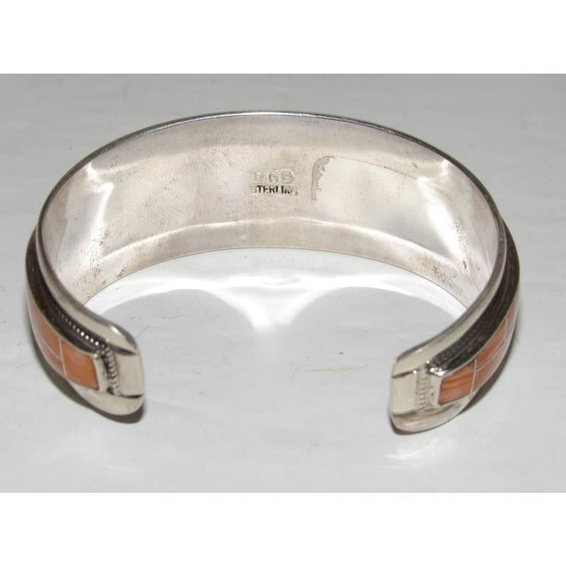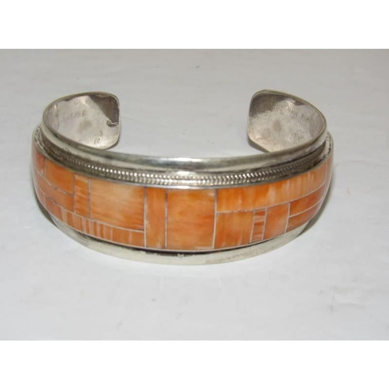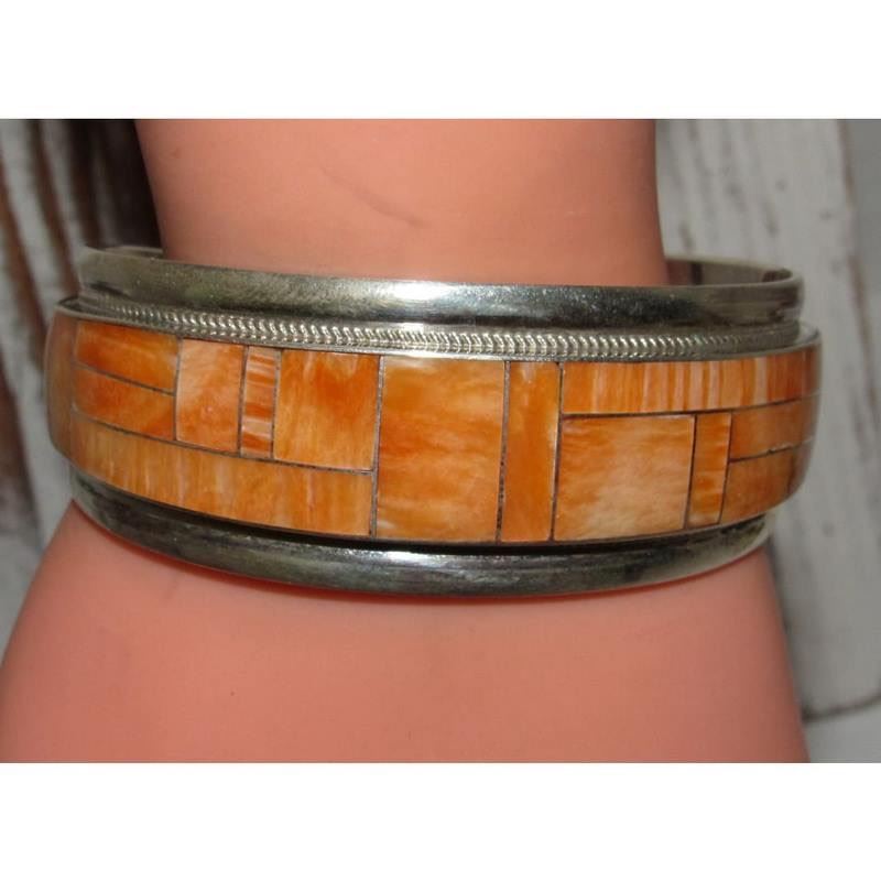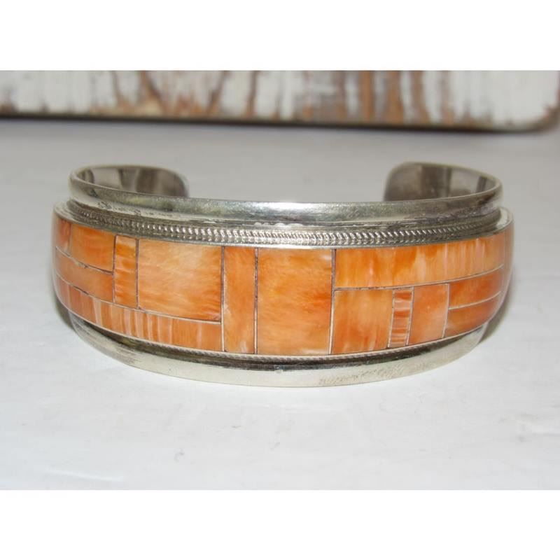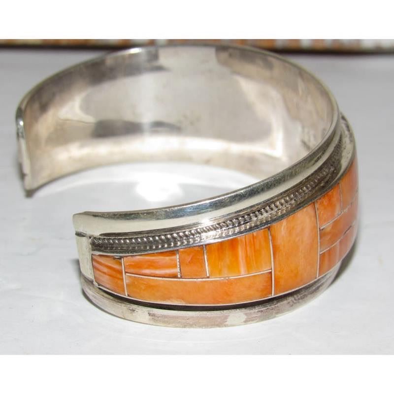 Navajo Orange Spiny Inlay Stacker Cuff Bracelet Sterling R. Begay. Fab Native American Navajo sterling silver and orange spiny oyster inlay cuff bracelet by the Navajo artist Robert Begay.. Traditional inlay design of gorgeous spiny oyster in sterling silver. Great as a stacker cuff to add to your collection. Hallmarked on the back. The inside circumference is about 7 " including gap and will fit a 7" wrist approximately.. Great to stack with other bracelets for a pop of color or wear by itself. Gorgeous stone color. FREE SHIPPING ON ALL JEWELRY ORDERS WITHIN THE US! WE SHIP ALL ITEMS IN-HOUSE!