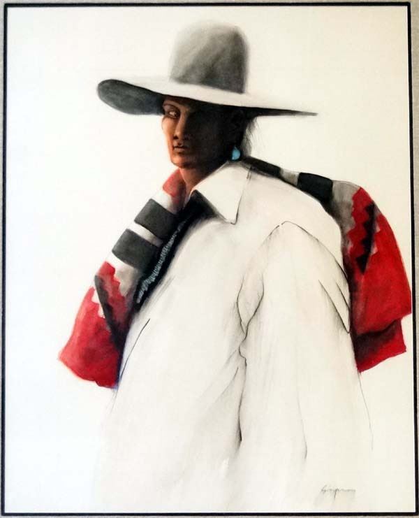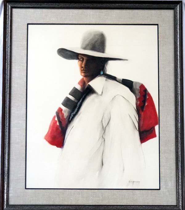 Native American Navajo Original Painting by Ed Singer, signed by artist, visual measures 28''L x 22''W, FYI: ''1951 Ed Singer is a Navajo Artist born and raised on the Navajo Reservation in Arizona. His superb draftsmanship and realistic view of Navajo life, a view often laced with subtle humor derived from the contrast of traditional Navajo ways with modern life, place him at the forefront of contemporary art. Singer is the first Navajo artist to show his people as they really are, living their day-to-day lives under trying conditions a White Man's world. Singer, unlike his much older contemporary, R. C. Gorman, chooses to live on the reservation with his people, the inspiration for his art.''