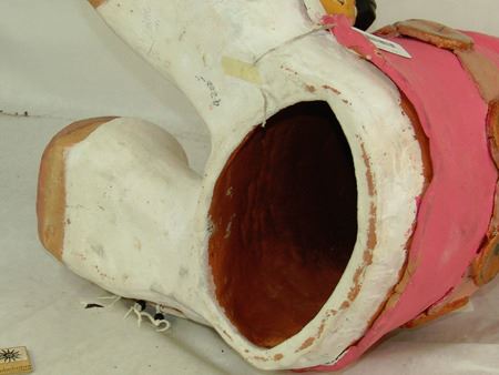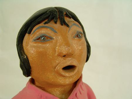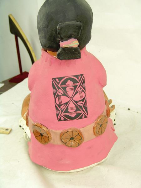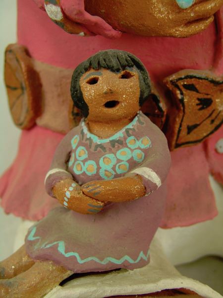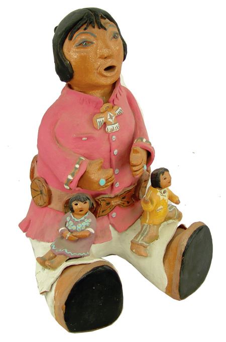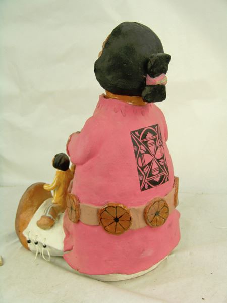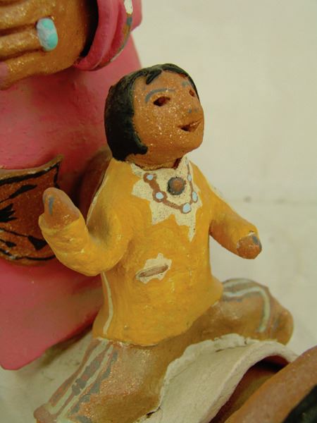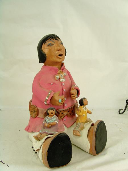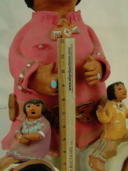 Mid/Late 1900s, Large and impressive mica clay pottery sculpture, a version of the famous Pueblo "storyteller" but in a more artistic original style. Very good condition, minor repair. Gallery retail $4200! 19" x 12" x 13"