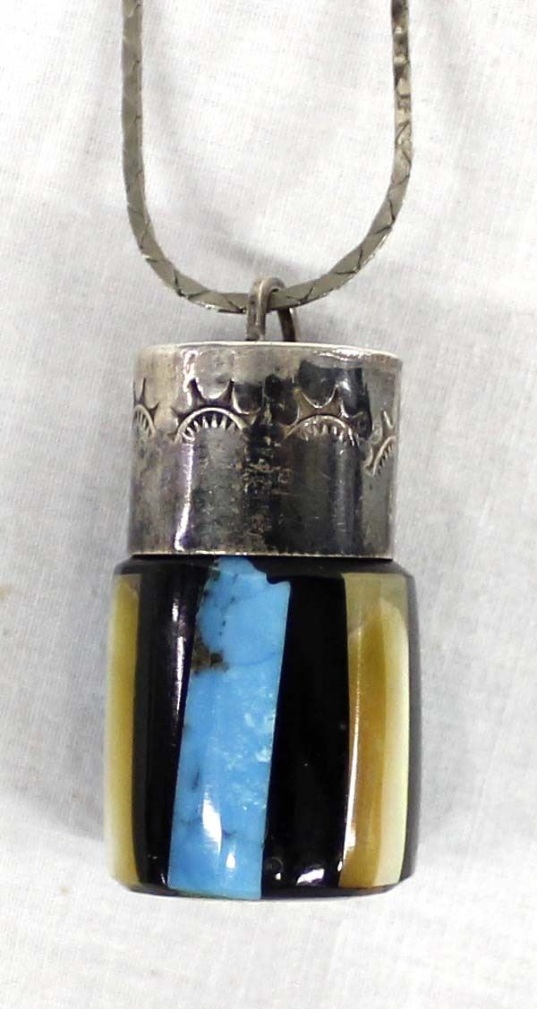 Native American Navajo Overlay on Glass Bottle Pendant Necklace, sterling silver hand stamped lid, overlay of jet, turquoise, and mother of pearl, sterling silver chain measures 17''L end to end, bottle measures 1.5''L, could be used as a pill bottle or perfume bottle