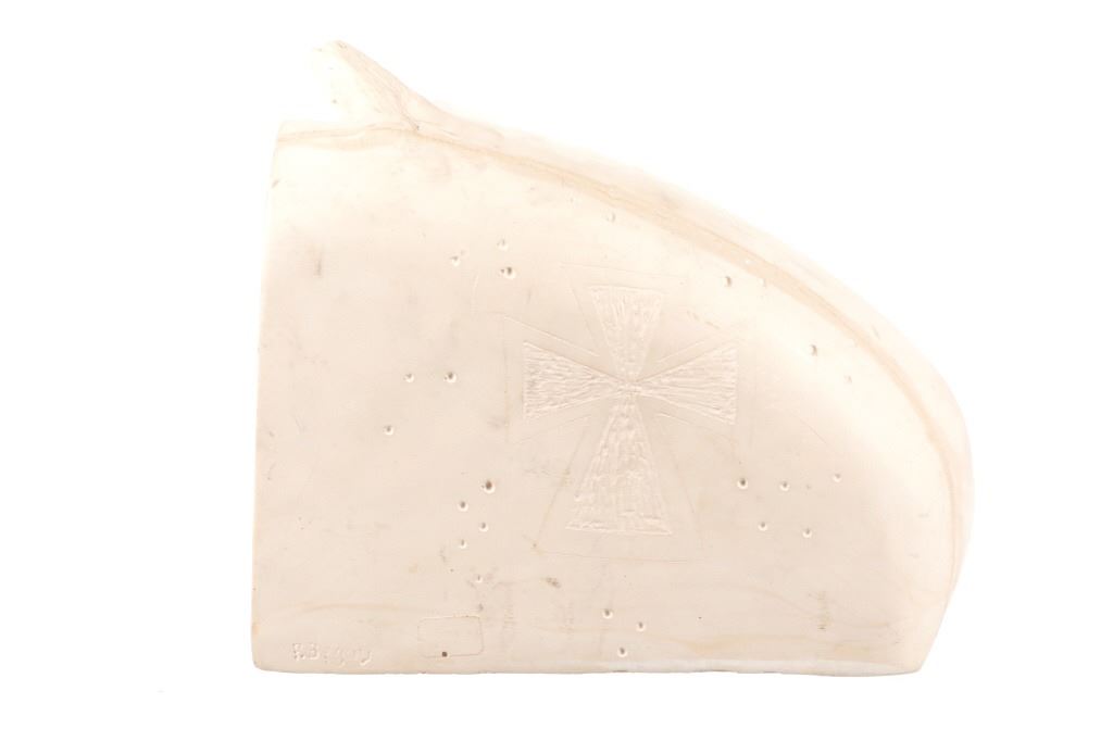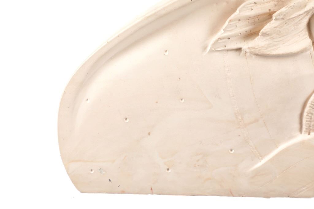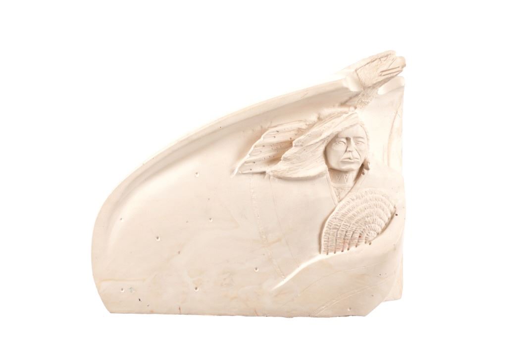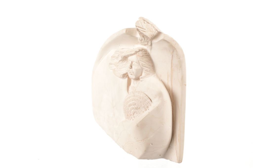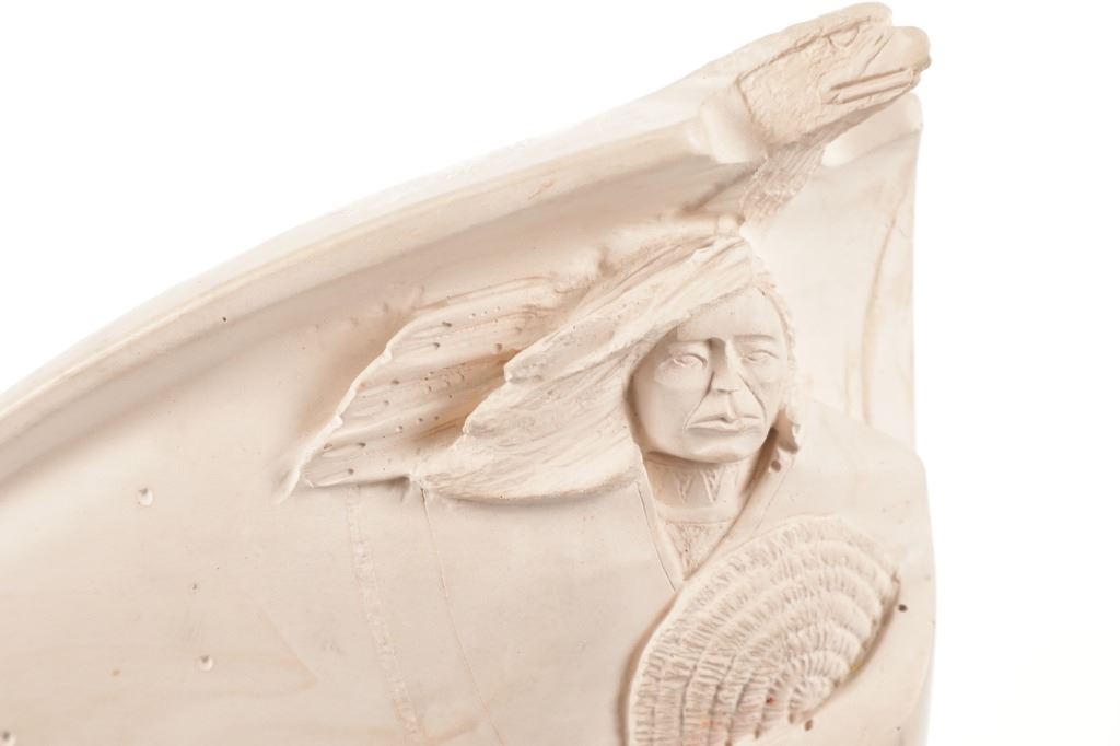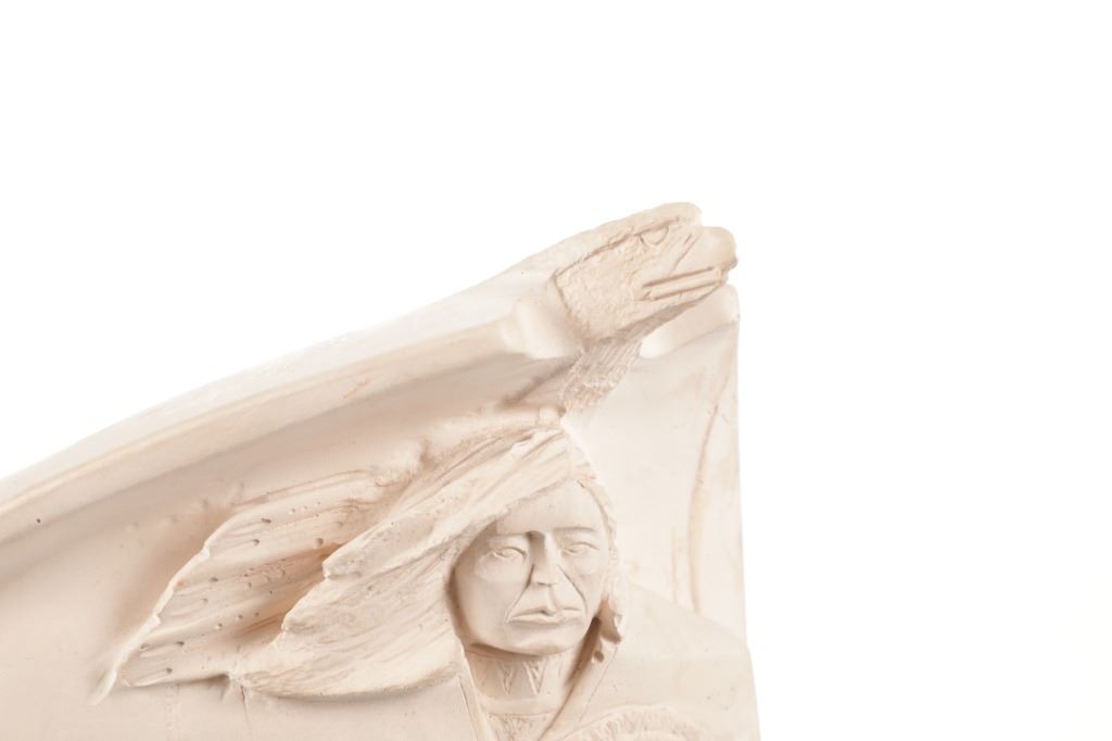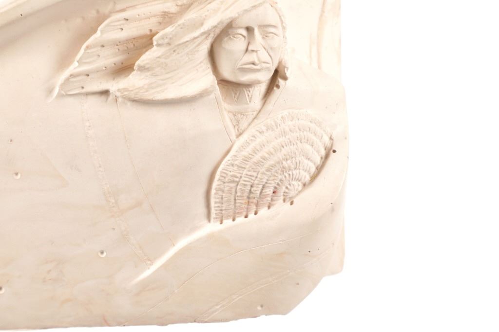 Featured in this lot is this soapstone sculpture of "Spirit Guide" by Navajo artist P. Begay. The sculpture features a wonderfully and professionally craved soapstone construction that shows a Native man holding a basket with his hair in the wind and his eagle "Spirit Guide" above him. The sculpture features a cross carved into the back and is marked on the back as follows: P. Begay - #282.5 - 275. The condition of this Navajo soapstone sculpture is well preserved with no obvious signs of damage and shows a well preserved overall condition. The measurements of this sculpture is 7 3/8" x 8 3/4" x 2 1/2". The collective weight of this sculpture is 4lb 4oz.