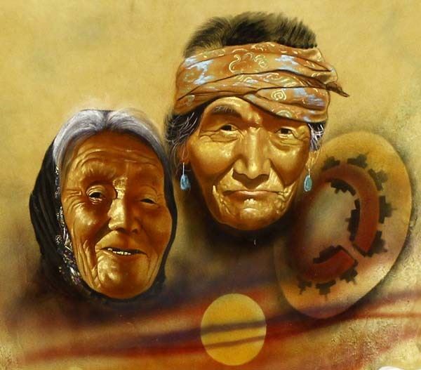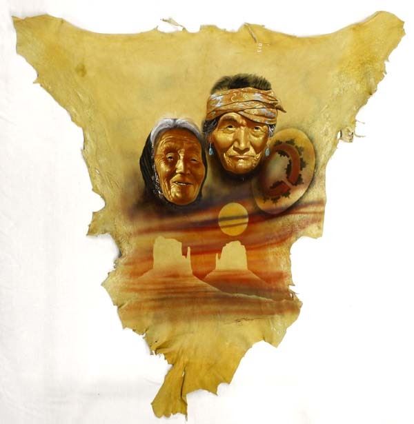 Native American Navajo Painting on Leather by Harry Warren, measures 45''L x 43''W and is signed by the artist, well executed and features Elder Navajo Man and Woman, FYI: ''Harry Warren is from the Red Mesa area of the Navajo Nation and has taught art on the Navajo Nation. His work has been exhibited in the Smithsonian Museum and he also crafts excellent sand cast jewelry.''
