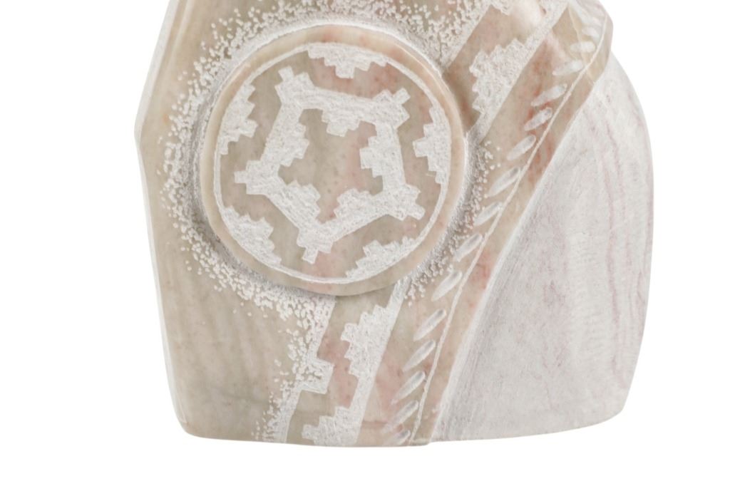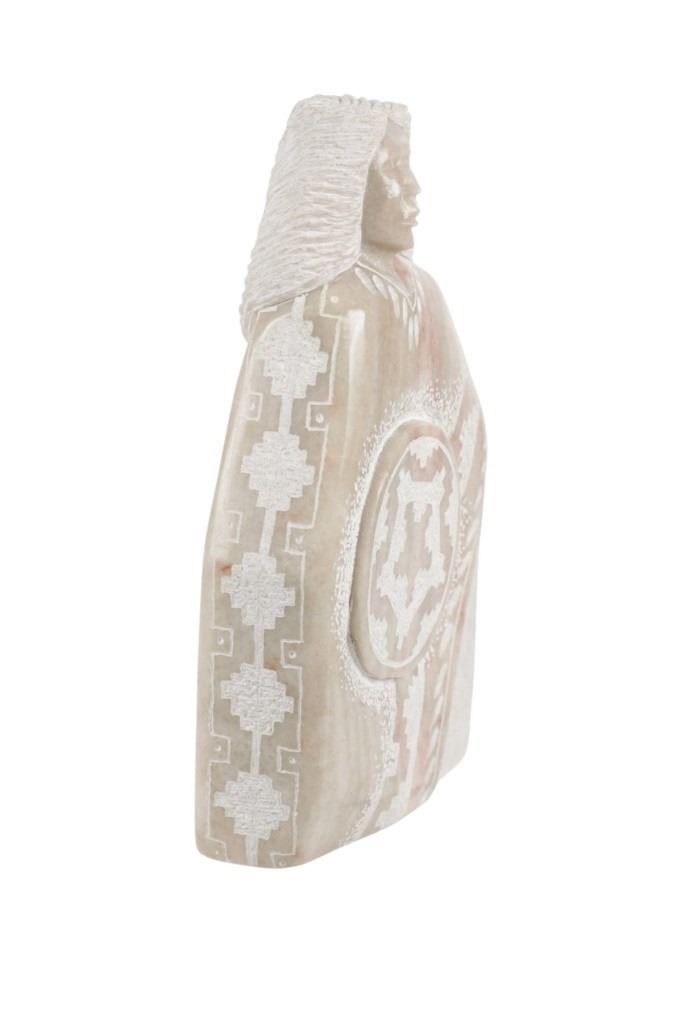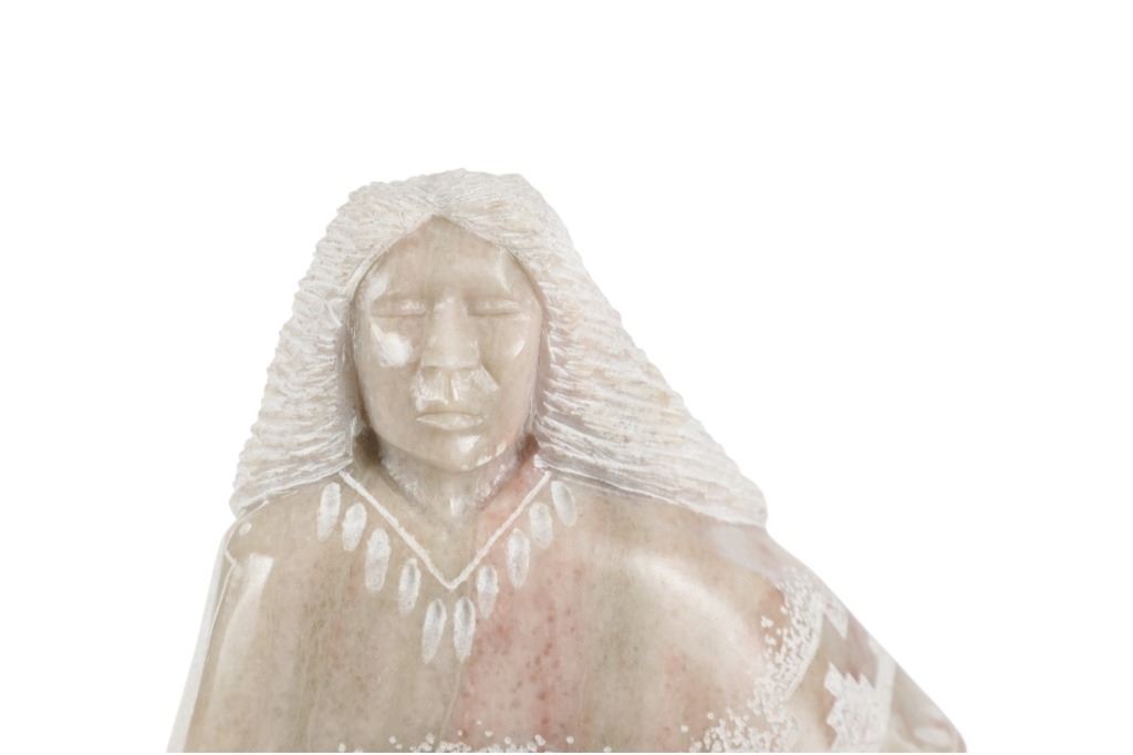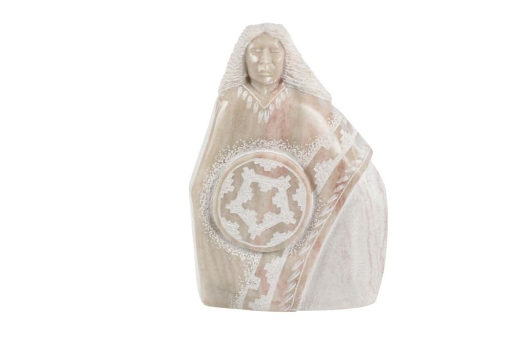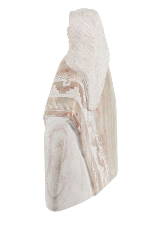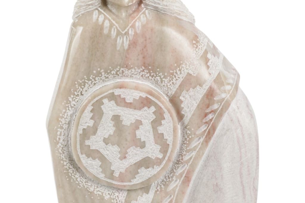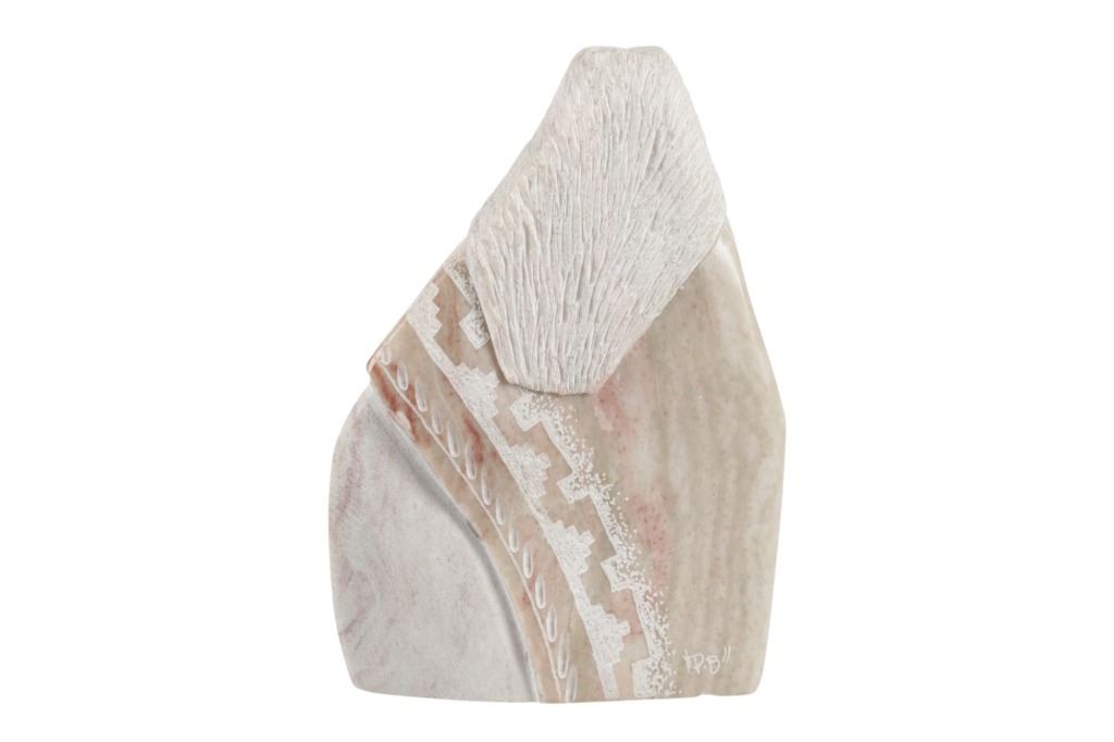 Featured in this lot is a Navajo Pam Begay Alabaster Sculpture, circa 1990s to early 2000s. Alabaster is a soft stone found in the American Southwest "four corners" region of New Mexico, Utah, Arizona, and Colorado, the sacred home of the Navajo people, where it’s been used for carving sculptures, statues, and other decorative artworks. Among Native Americans in the Southwest, Alabaster symbolizes purity and is said to represent the colour of a person’s soul. It is believed to be a protective stone, and it’s used to safeguard the most innocent people like children and infants. It’s also used to help people cope with significant changes in their lives and to show that these changes aren’t necessarily bad. Alabaster sculptures are primarily artistic in nature and are carved in both traditional and contemporary poses by artisans among the Apache, Navajo and Zuni peoples, and they are all hand-carved. This sculpture displays unique alabaster colouring of white, red/rose, and green hues. The freestanding piece is in beautiful condition, signed on reverse lower right corner, "P.B". Measures 8.25"H x 6"W x 2"D, weight is 4lb, 12oz.