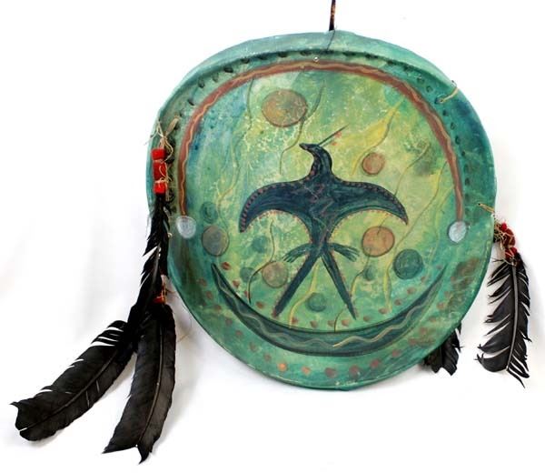 Native American Navajo Parfleche Hide Shield by Lance Curley, measures 17'' x 18'', embellished with feathers, bells, and felt, beautifully hand painted, comes with original New Mexico State Fair Exhibitor Tag