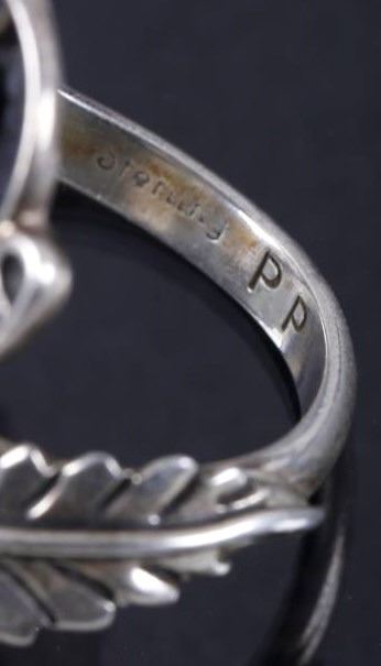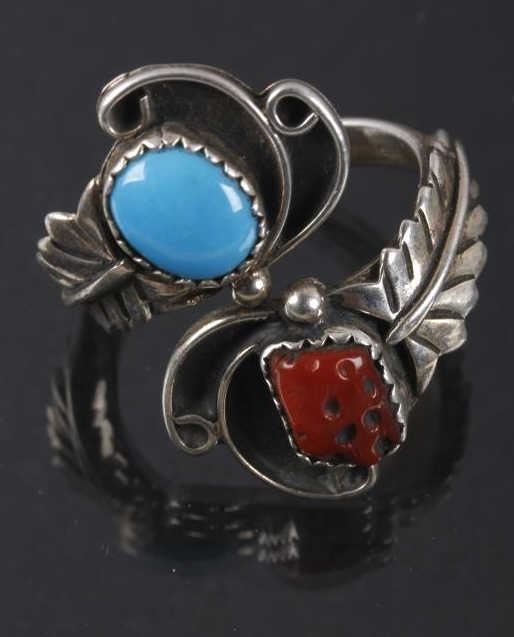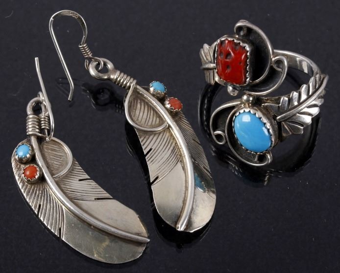 Available for your consideration is a set of multi-stone Navajo Native American Indian, sterling silver jewelry, including; an expertly crafted Pat Platero leaf motif, and multi-stone ring, and a pair of sterling silver feather motif earrings. All three pieces are crafted of sterling silver, and include a single nugget of blue gem turquoise, and a nugget of Oxblood coral. The ring is marked with Plateros "PP" hallmark, while the earrings are absent a hallmark. The lot shows good condition overall, the pieces show a nice warm silver patina. The ring measures to a US size 7.