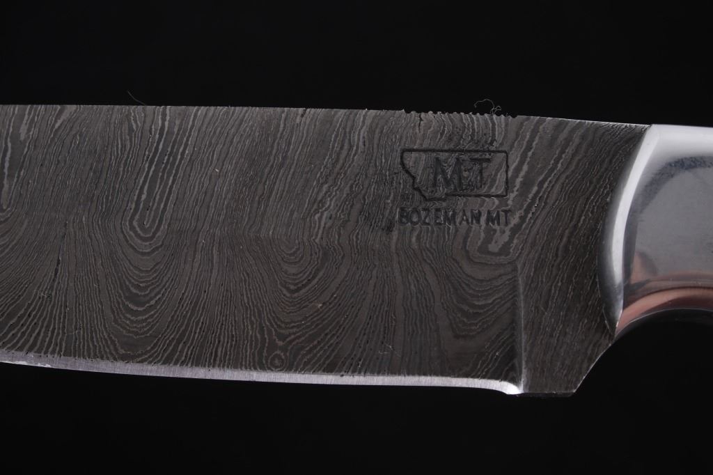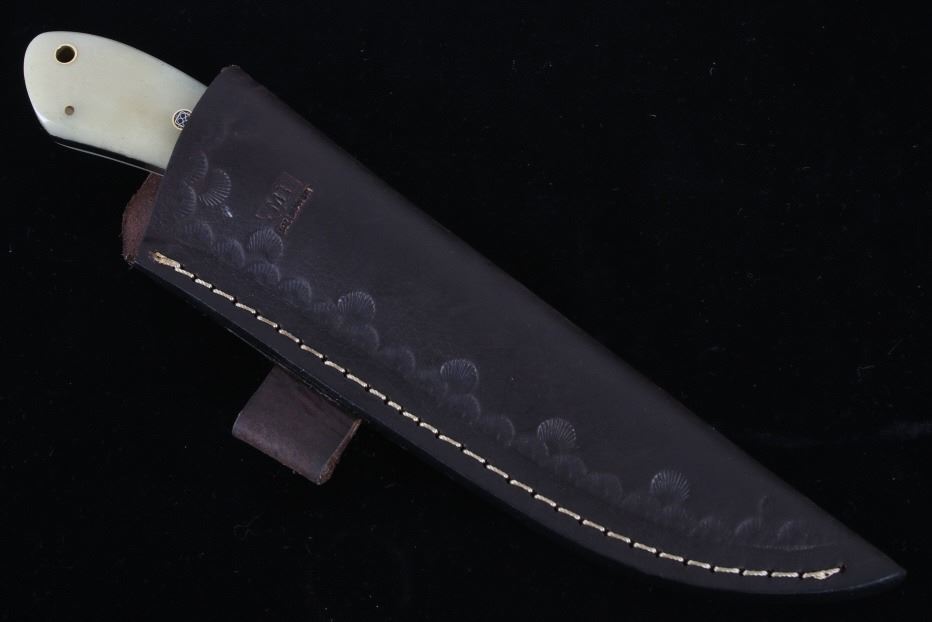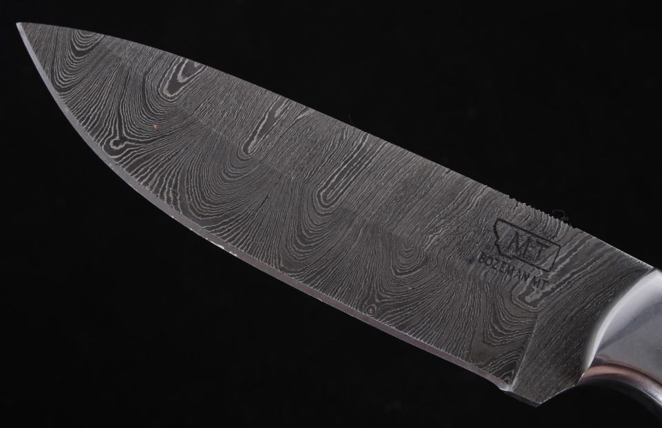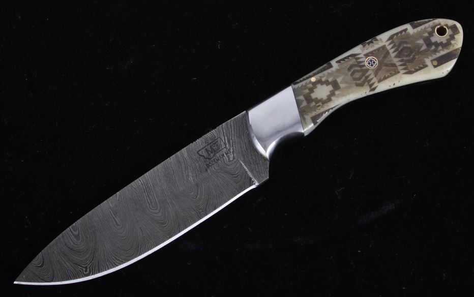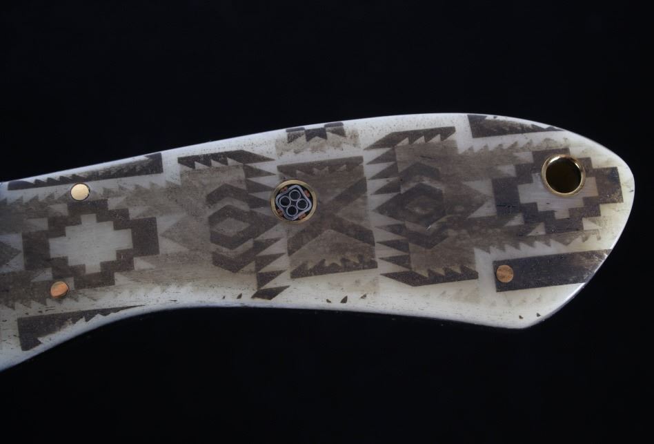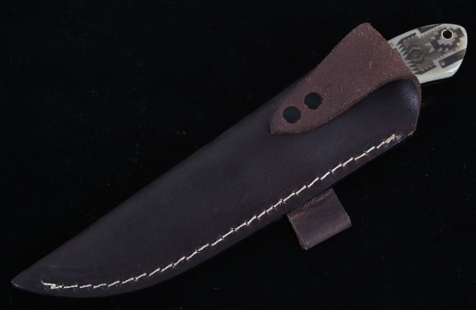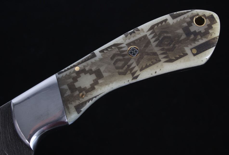 This is an original Montana Territory Knives of Bozeman, Montana knife showing an excellent, original scrimshaw artwork of a Navajo Trading Post Rug Pattern. The blade has been forged from 1095HC (High Carbon) steel and 15N20 Nickel Carbon, which is then heated and folded into 396 layers, creating the astounding “Damascus” steel. The knife shows a wonderful ladder Damascus pattern. The hollow grind full tang blade has been paired with a set of nice, white, wild Buffalo bone grips scales. The grips are set with three brass pins, a mosaic pin, and a lanyard loop. The knife is also finished with stainless steel bolsters and finger holds. The tang and knife spine have been artfully hand vine filled. The knife shows a scrimshaw artwork of a geometric, Navajo Native American Indian Trading Post Rug pattern. The blade is marked with the “MONTANA TERRITORY KNIVES BOZEMAN MONTANA” stamping, which shows the outline of Montana. The knife has been paired with a Great American Bison Buffalo leather, hand crafted sheath. Overall, the knife measures 10" long, with the blade being 5 1/4" long. The knife and sheath together measure 10 3/4" long.