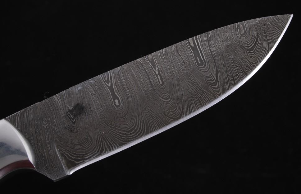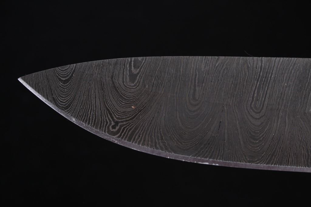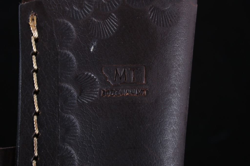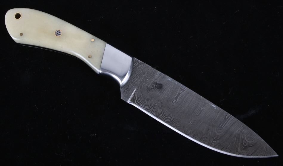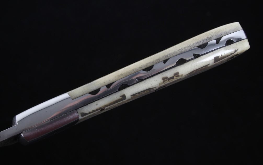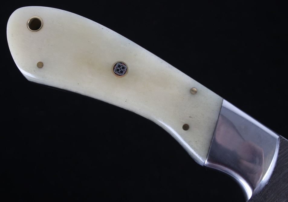 This is an original Montana Territory Knives of Bozeman, Montana knife showing an excellent, original scrimshaw artwork of a Navajo Trading Post Rug Pattern. The blade has been forged from 1095HC (High Carbon) steel and 15N20 Nickel Carbon, which is then heated and folded into 396 layers, creating the astounding “Damascus” steel. The knife shows a wonderful ladder Damascus pattern. The hollow grind full tang blade has been paired with a set of nice, white, wild Buffalo bone grips scales. The grips are set with three brass pins, a mosaic pin, and a lanyard loop. The knife is also finished with stainless steel bolsters and finger holds. The tang and knife spine have been artfully hand vine filled. The knife shows a scrimshaw artwork of a geometric, Navajo Native American Indian Trading Post Rug pattern. The blade is marked with the “MONTANA TERRITORY KNIVES BOZEMAN MONTANA” stamping, which shows the outline of Montana. The knife has been paired with a Great American Bison Buffalo leather, hand crafted sheath. Overall, the knife measures 10" long, with the blade being 5 1/4" long. The knife and sheath together measure 10 3/4" long.