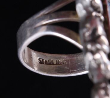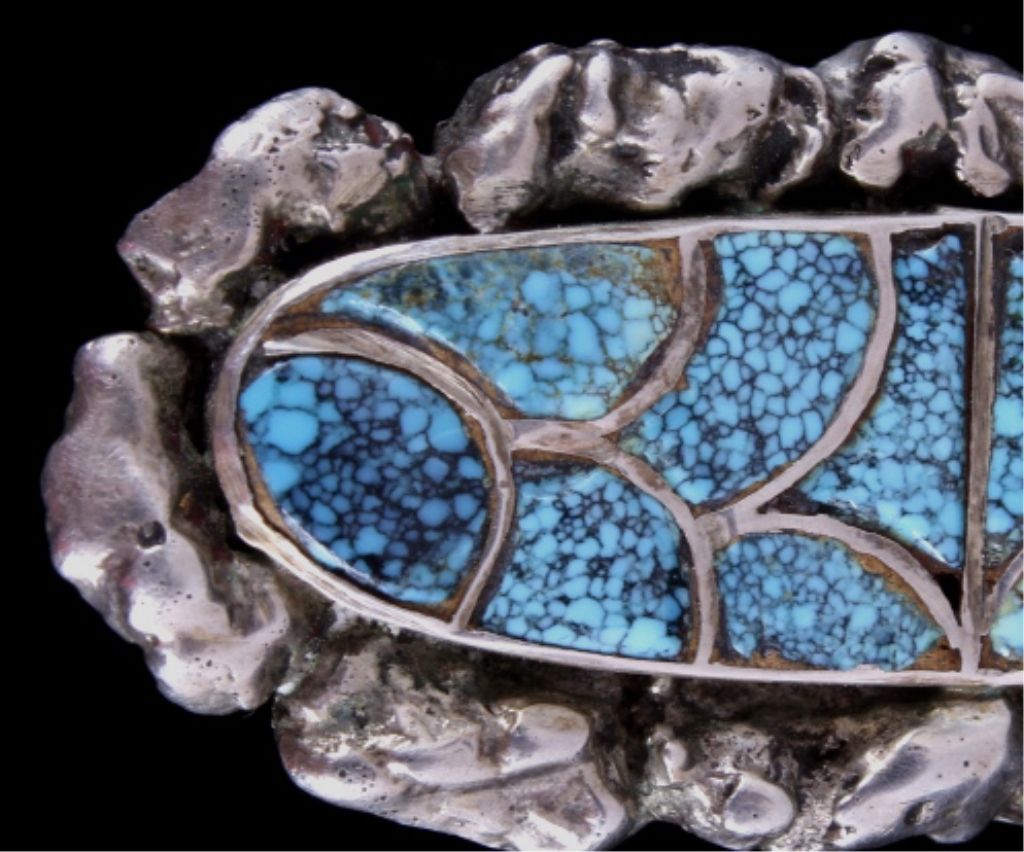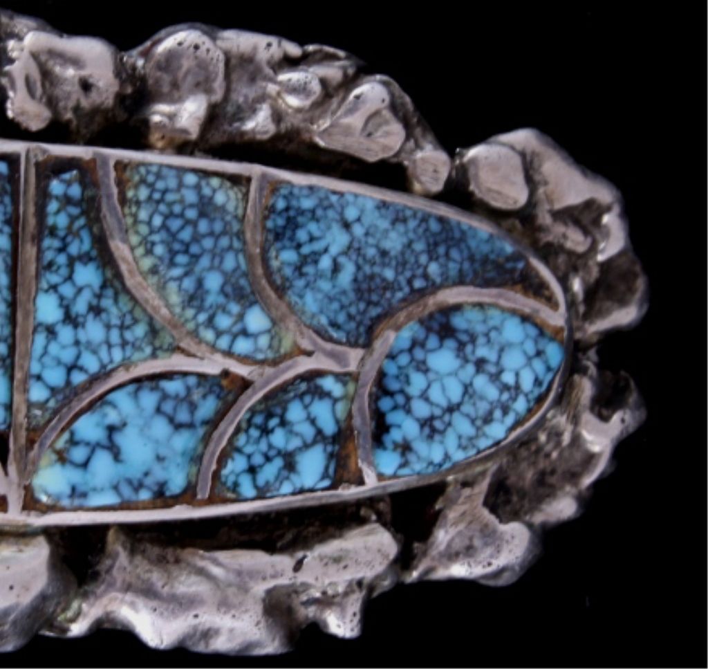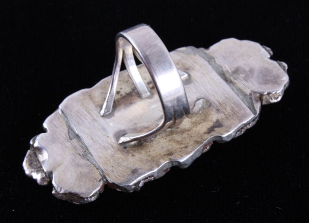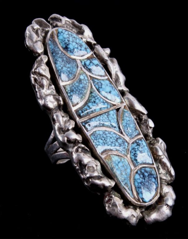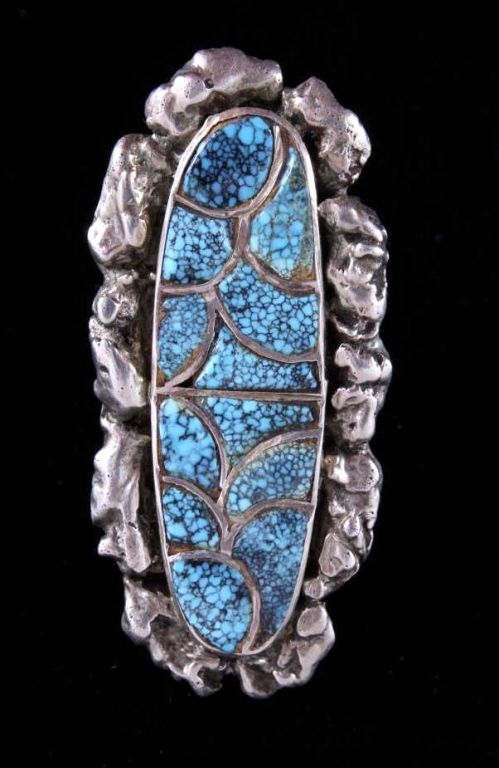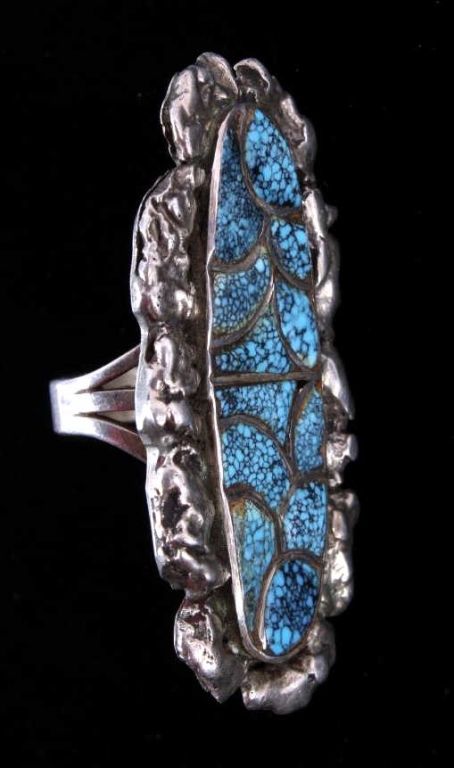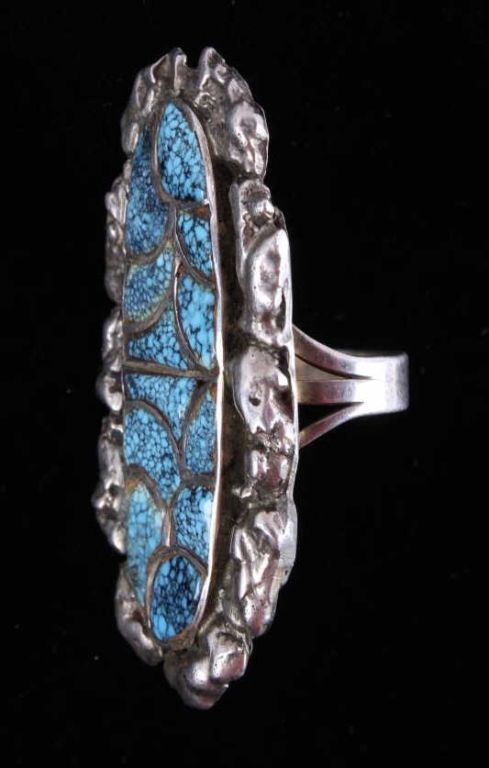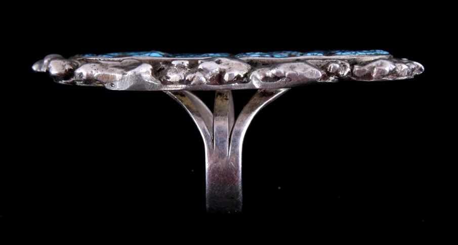 This is an original Navajo Native American Indian pawn silver turquoise large ring. The ring shows impressive rare spider web turquoise stones with a mosiac design. The ring is markes sterling and shows a framed nugget edge. This is a pawn silver piece believed to be from the 1930's. This piece has been slightly cleaned, but overall is an impressive collectible. Measures 1"x2.25" size 6.5-7.
