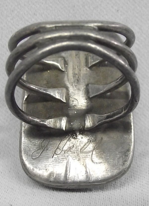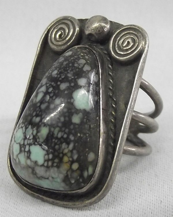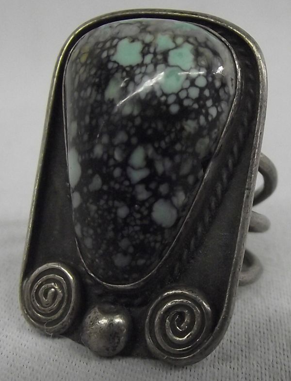 Navajo Pawn Sterling Spider Web Turquoise Ring. This exquisite ring is by J. Hall is a size 8 1/2. The stone and band are unique in appearance with the stone measuring approx. 1'' x 1/2''.