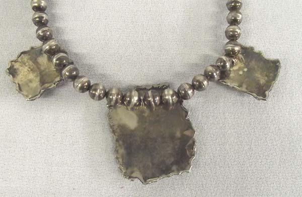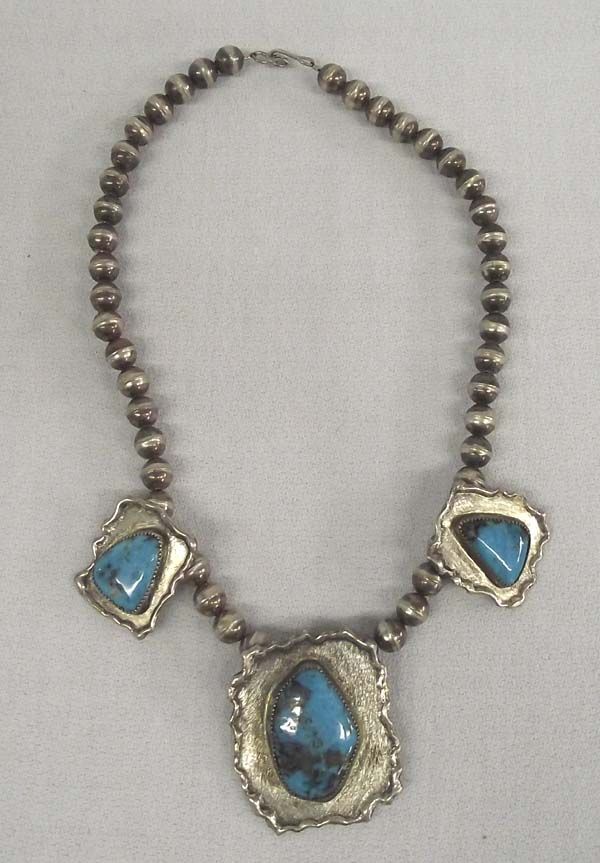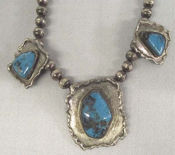 Native American Navajo Pawn Sterling Turquoise Choker. This choker has hollow ball sterling silver beads and 3 turquoise nuggets in sterling silver settings. The choker is 14'' end to end and the center pendant is 2''x1.5''.
