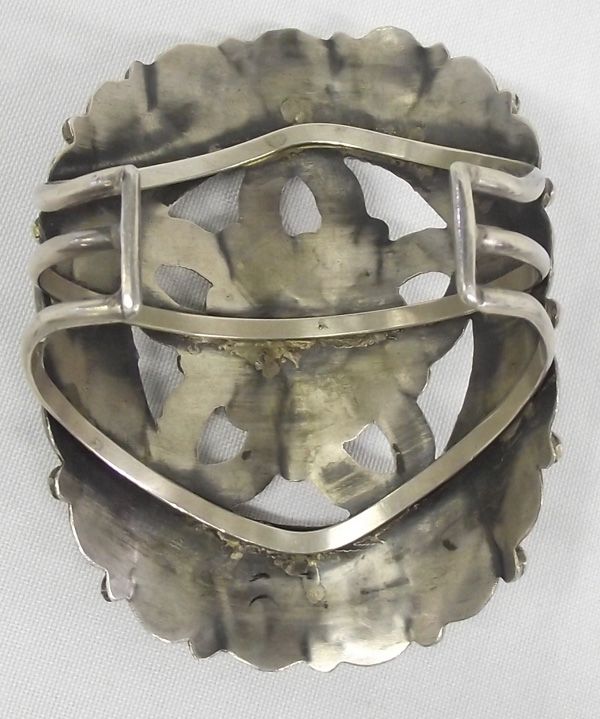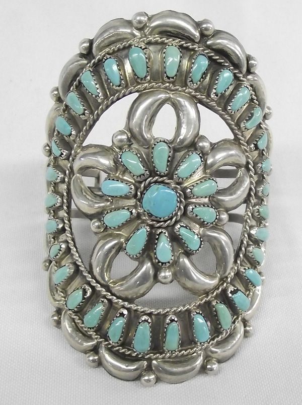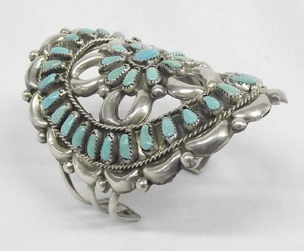 Navajo Pawn Sterling Turquoise Cluster Bracelet, 40 gorgeous teardrop shaped turquoise cabs with golden matrix, center is a round turquoise cab measuring .25''D, silver crescent moon accents throughout piece, silver bead accents as well making this piece a stunning prize, triple band bracelet, measures 7/8''L x 6'' inside measurement which includes opening, Dynamic!