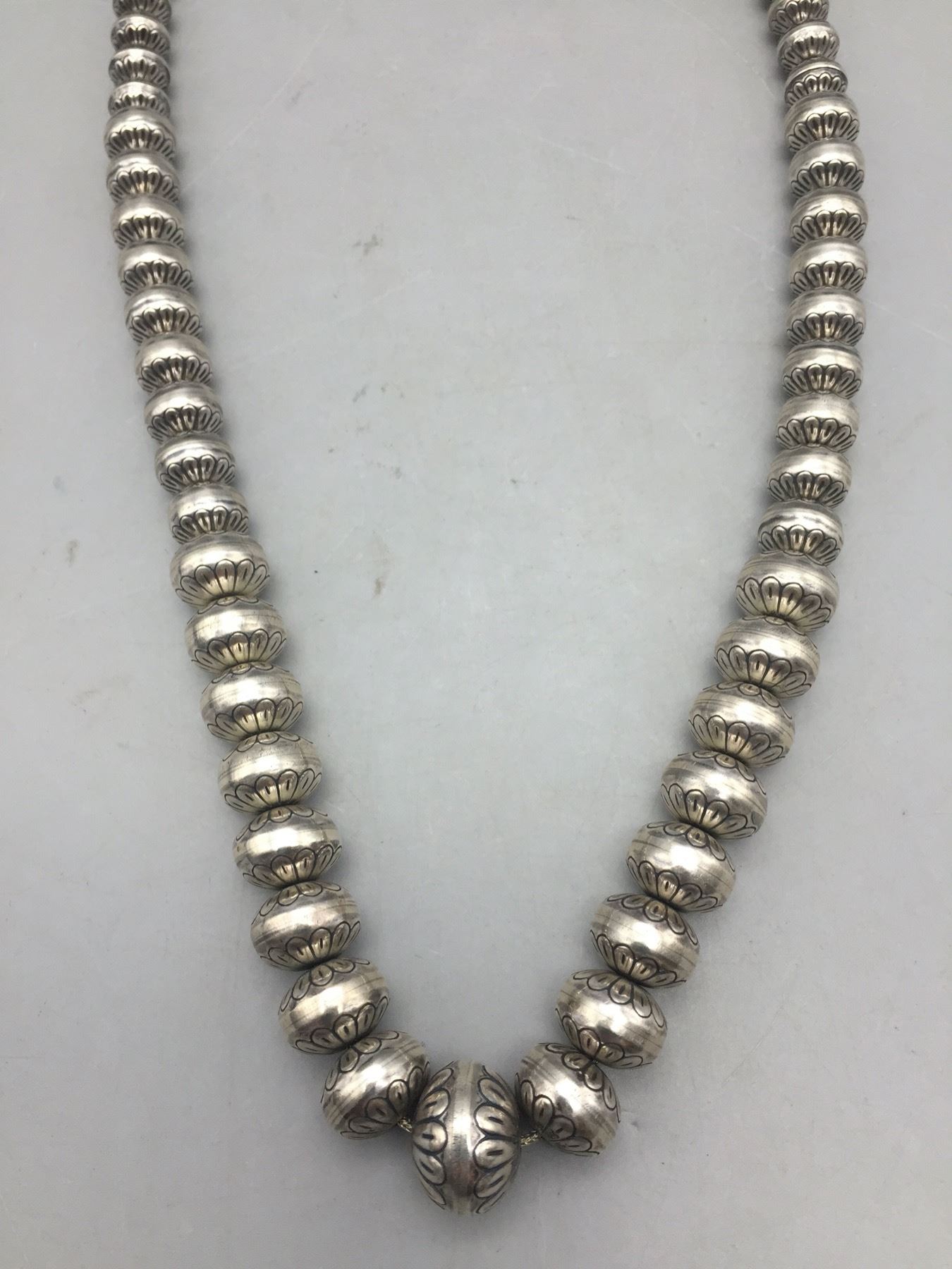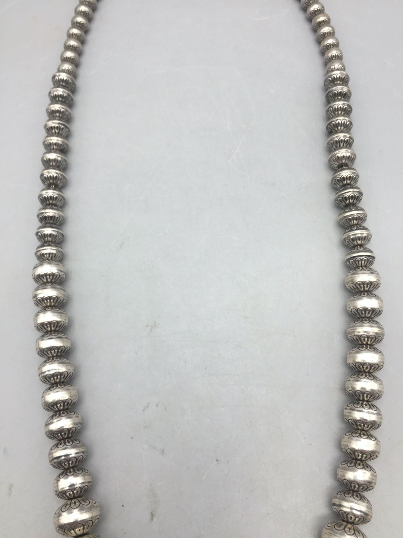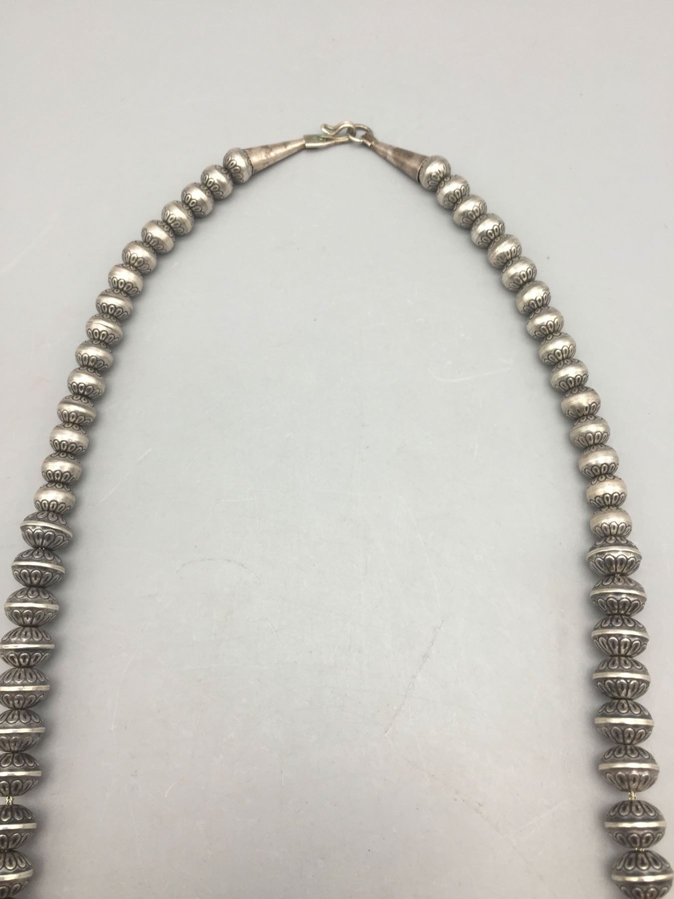 Description: For sale in this lot we have a beautiful set of “Navajo pearls” or stamped sterling silver beads. This necklace has a beautiful design on the beads. Maker: Unknown. Approx. Age: Vintage to modern. Size: Fits a 29 inch neck. Weighs 96.3 grams. Condition: Good for its age, normal wear expected. Please look closely at the pictures - they are an important part of our description. Shipping: There will be a $5 handling, packaging fee for shipping this lot. The actual cost of postage will be added on top of that.