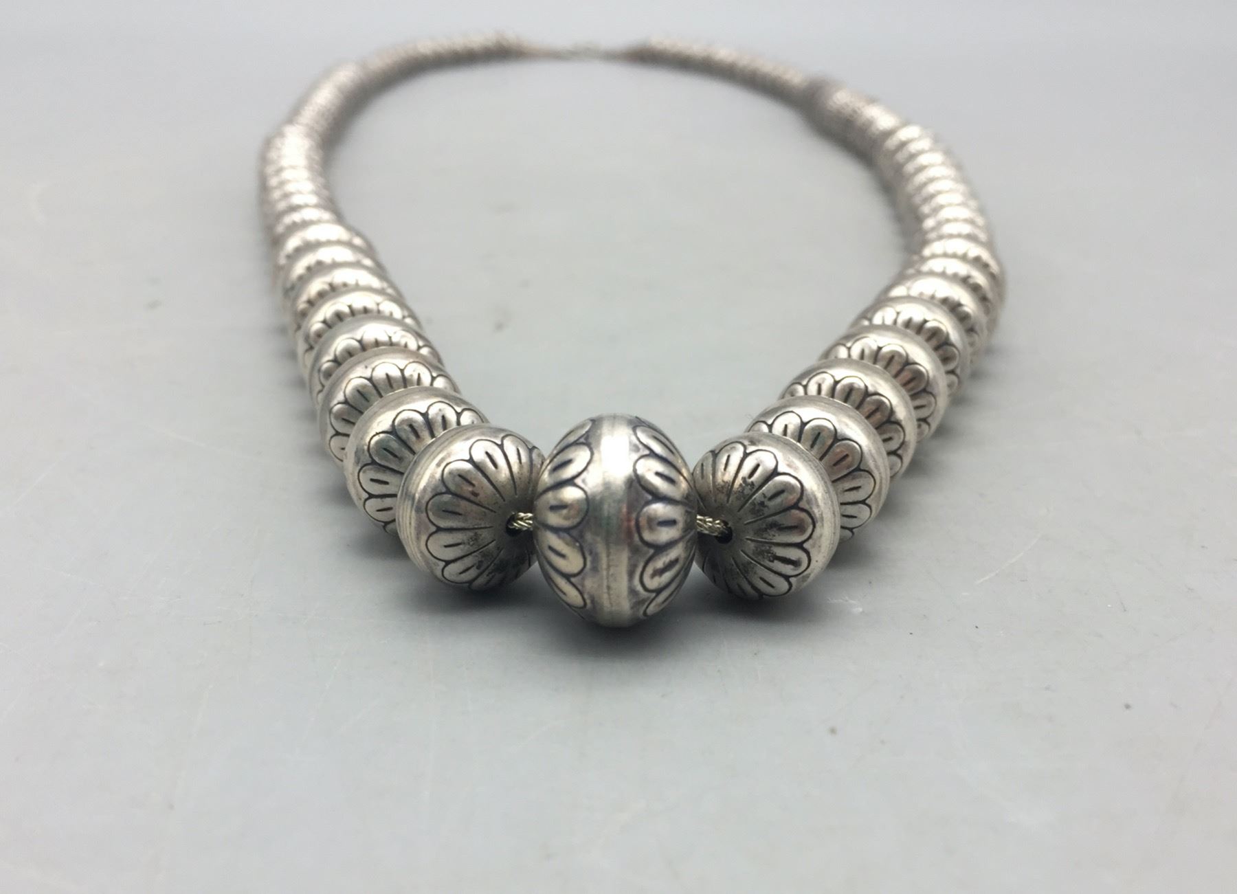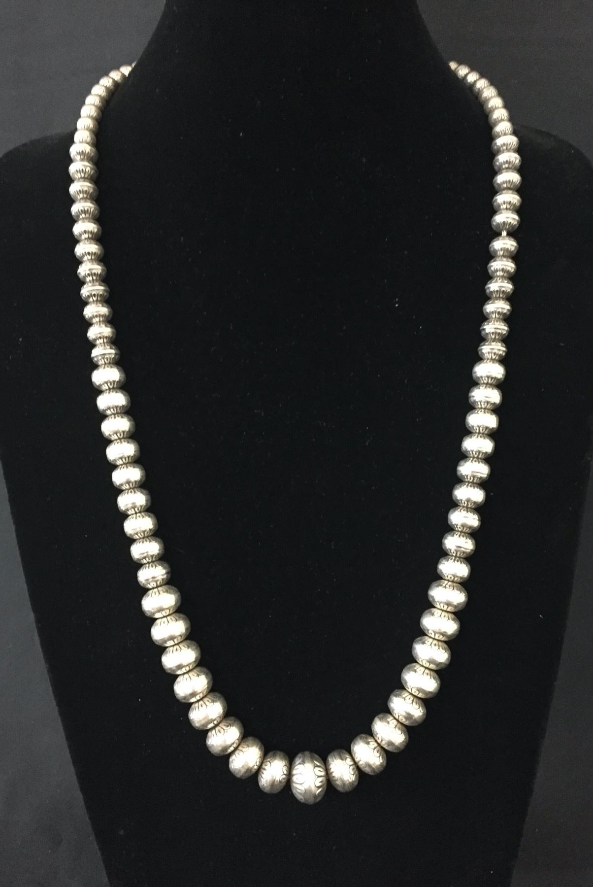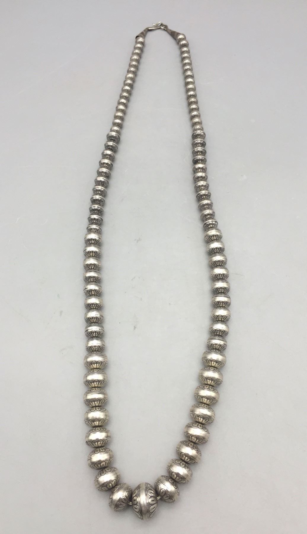Description: For sale in this lot we have a beautiful set of “Navajo pearls” or stamped sterling silver beads. This necklace has a beautiful design on the beads. Maker: Unknown. Approx. Age: Vintage to modern. Size: Fits a 29 inch neck. Weighs 96.3 grams. Condition: Good for its age, normal wear expected. Please look closely at the pictures - they are an important part of our description. Shipping: There will be a $5 handling, packaging fee for shipping this lot. The actual cost of postage will be added on top of that.