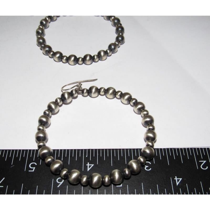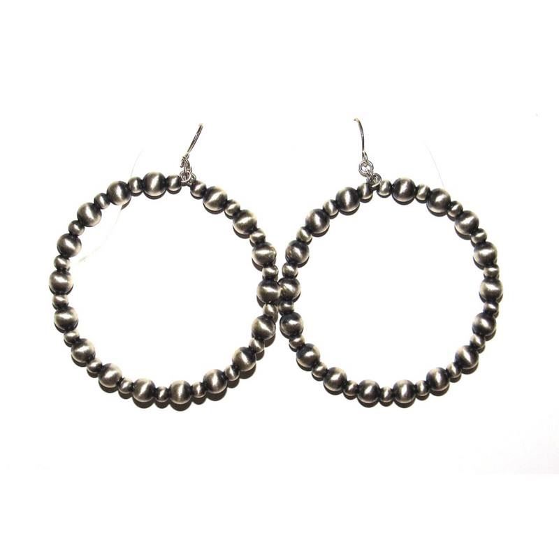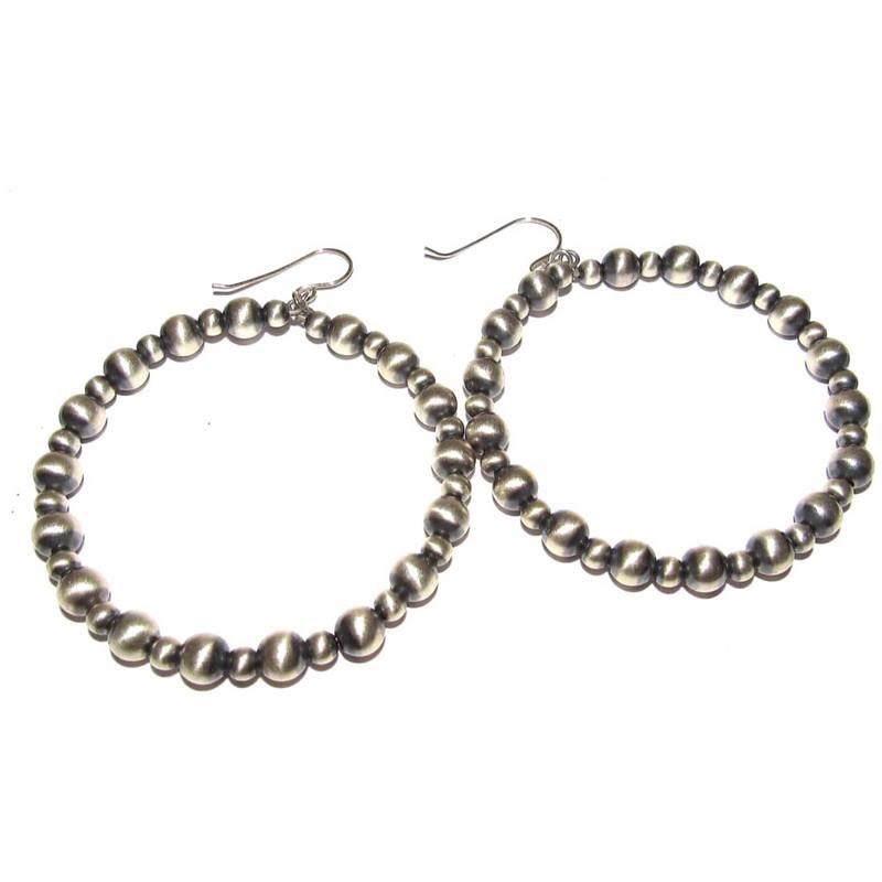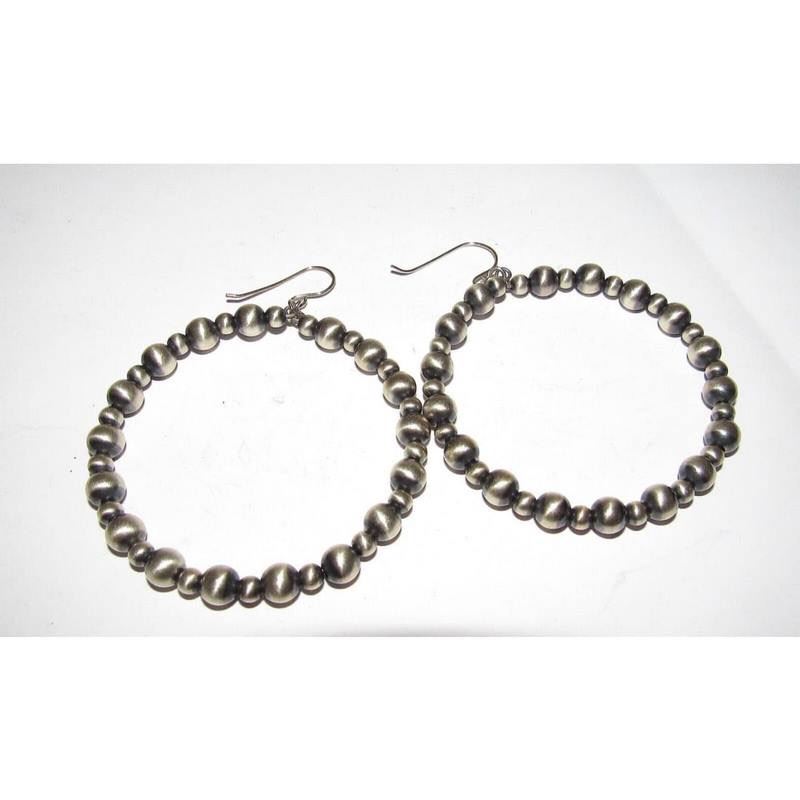 Stunning classic Navajo pearls hoops dangle statement earrings. Sterling silver, alternating beads design with a French hook. Measure about 2" wide including hooks. Navajo handcrafted. The earrings wear comfortably, are rather lightweight and weigh 11g total weight. Stunning Navajo pearl!