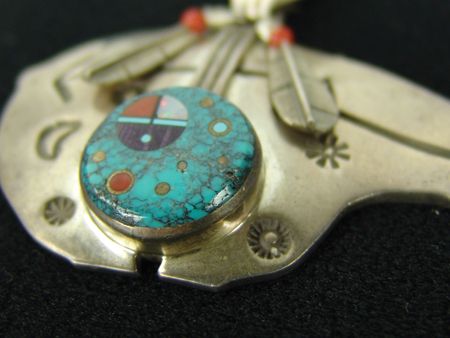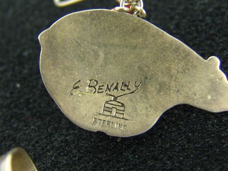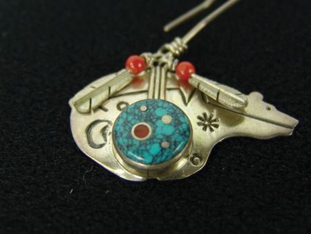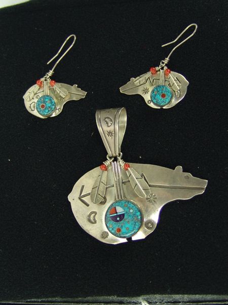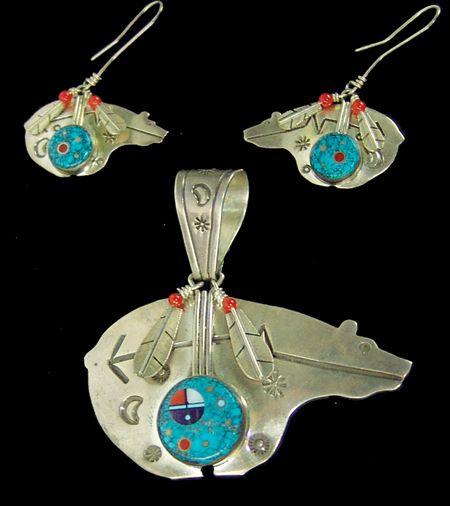 Ca. 1980s, Fine all-silver heartline bear pin/pendant set with a fine turquoise inlay disc. Includes a pair of matching earrings. Very good condition. Pendant 2-1/2" x 2-1/2", earrings 1-3/4"
