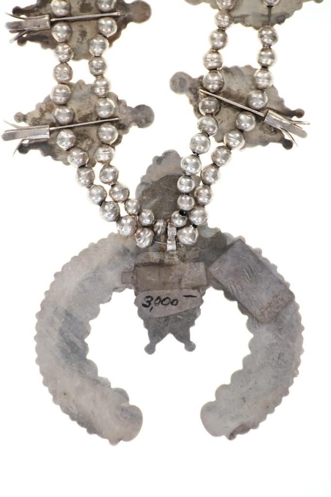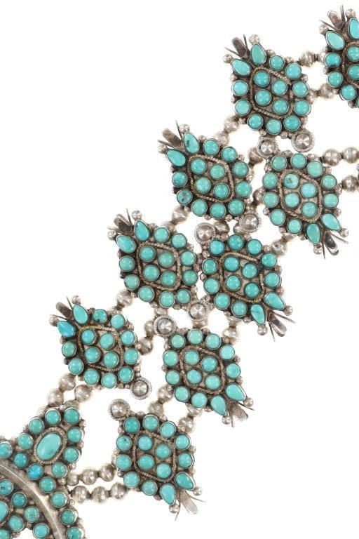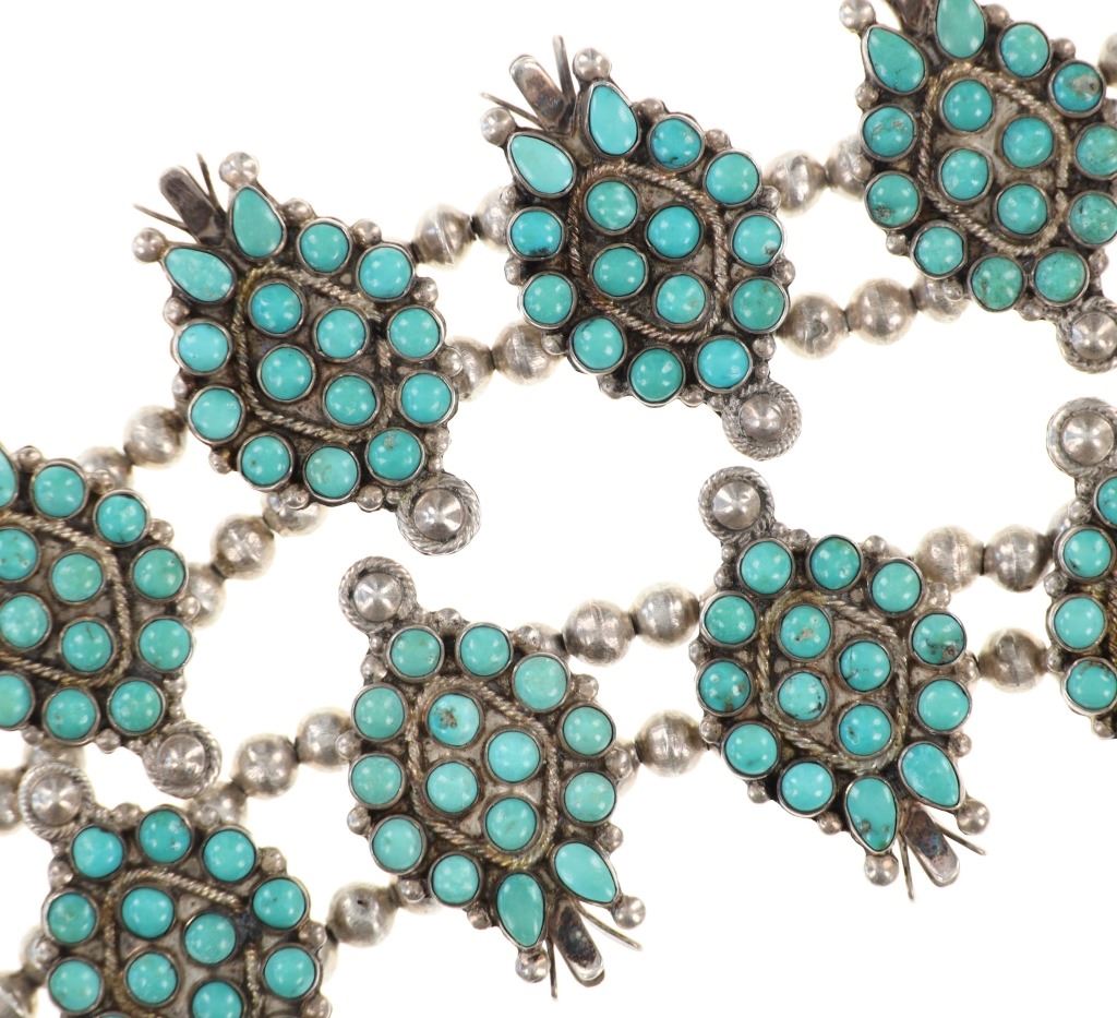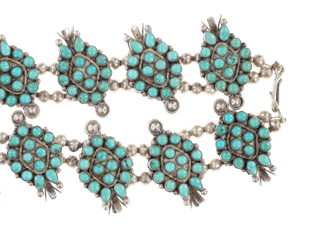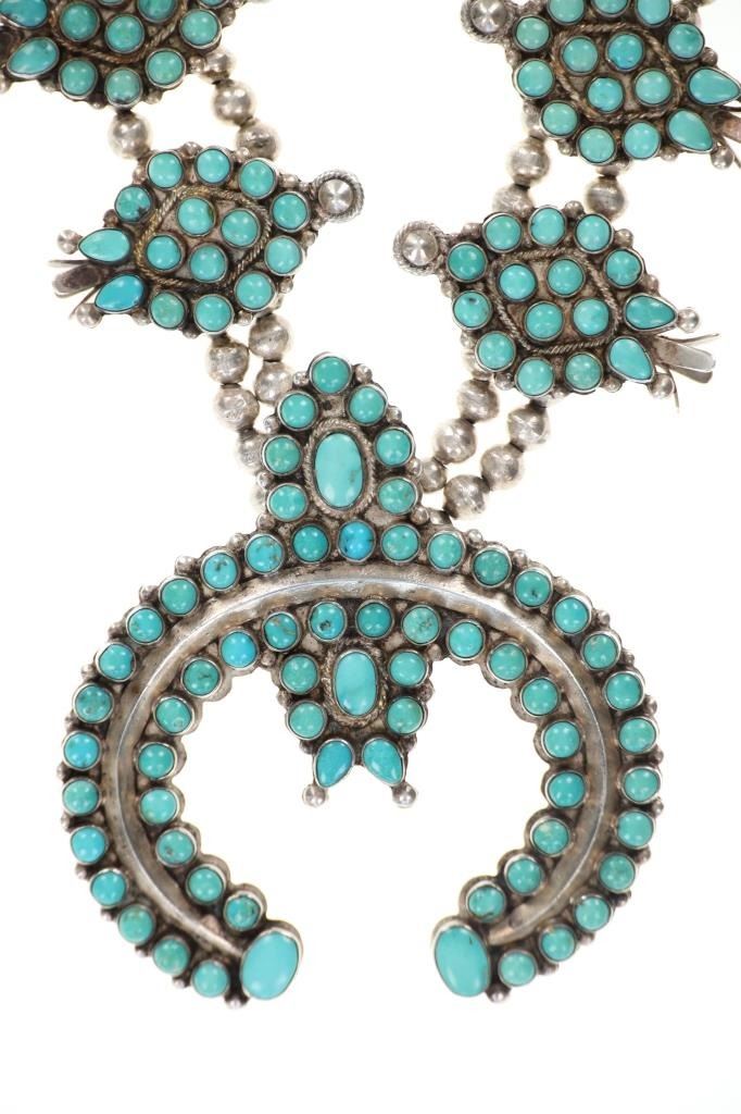 Featured in this lot is this Navajo petite point turquoise squash necklace circa 1960's. The necklace features a wonderfully and professionally crafted sterling silver and petite point turquoise construction that shows a total of 16 blossoms spun on a double strand of small Navajo pearls and shows a central naga pendant. This is an older squash blossom necklace showing vintage signs of the 1960's. and is bursting with color and pop to the turquoise cabochons it adorns. The Navajo Squash Blossom necklace is one of the most iconic and recognizable forms of Native American jewelry, particularly within Navajo culture. These necklaces have a rich history that blends Navajo craftsmanship with influences from other cultures, creating a unique and enduring symbol of Navajo artistry. Today, Squash Blossom necklaces are highly prized by collectors of Native American jewelry and are considered one of the most important symbols of Navajo craftsmanship. They are often passed down as heirlooms and continue to be made by contemporary Navajo artists. The condition of this Navajo squash blossom necklace is good with a slight patina to the sterling silver but otherwise shows a good overall condition. The measurements of this necklace from clasp to clasp is 22" and the central naga pendant measures 2 1/8" x 2 7/8". The collective weight of this necklace is 209.3g.