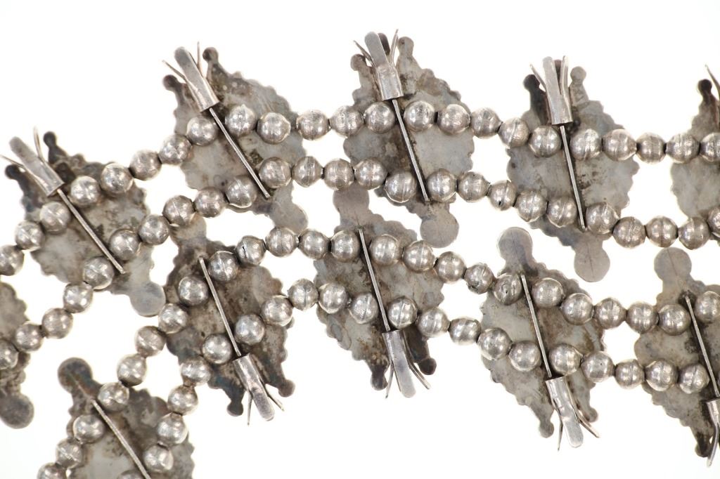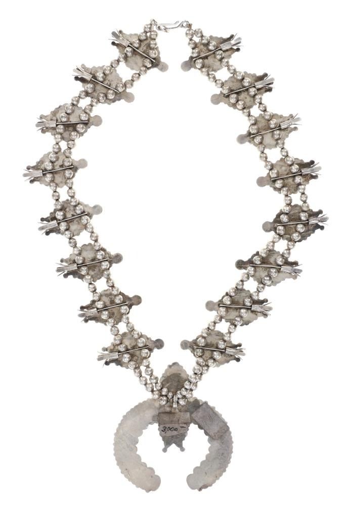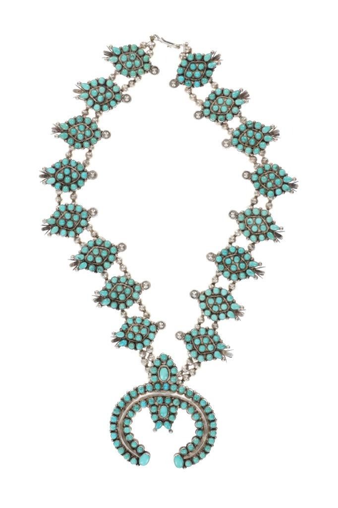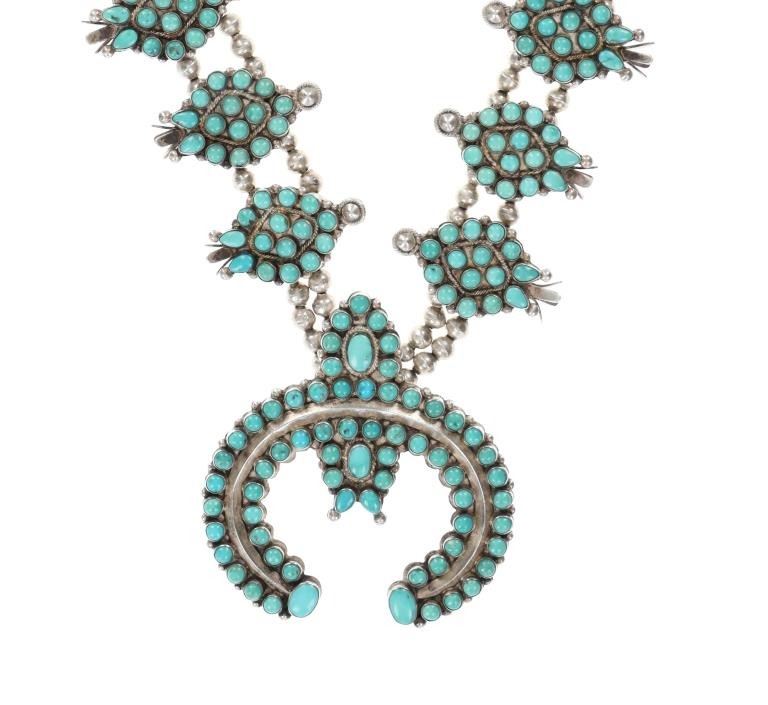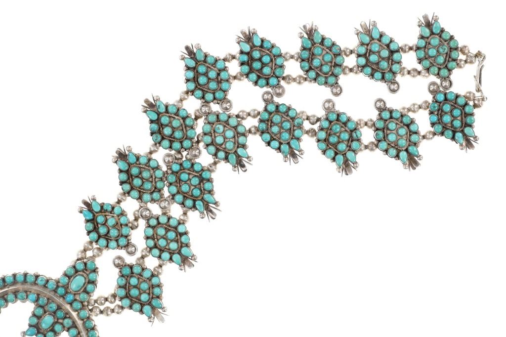 Featured in this lot is this Navajo petite point turquoise squash necklace circa 1960's. The necklace features a wonderfully and professionally crafted sterling silver and petite point turquoise construction that shows a total of 16 blossoms spun on a double strand of small Navajo pearls and shows a central naga pendant. This is an older squash blossom necklace showing vintage signs of the 1960's. and is bursting with color and pop to the turquoise cabochons it adorns. The Navajo Squash Blossom necklace is one of the most iconic and recognizable forms of Native American jewelry, particularly within Navajo culture. These necklaces have a rich history that blends Navajo craftsmanship with influences from other cultures, creating a unique and enduring symbol of Navajo artistry. Today, Squash Blossom necklaces are highly prized by collectors of Native American jewelry and are considered one of the most important symbols of Navajo craftsmanship. They are often passed down as heirlooms and continue to be made by contemporary Navajo artists. The condition of this Navajo squash blossom necklace is good with a slight patina to the sterling silver but otherwise shows a good overall condition. The measurements of this necklace from clasp to clasp is 22" and the central naga pendant measures 2 1/8" x 2 7/8". The collective weight of this necklace is 209.3g.