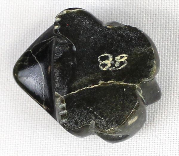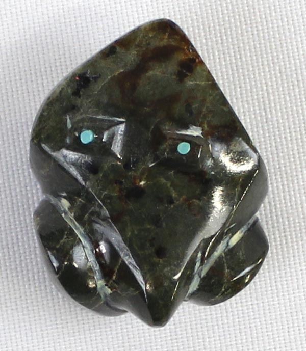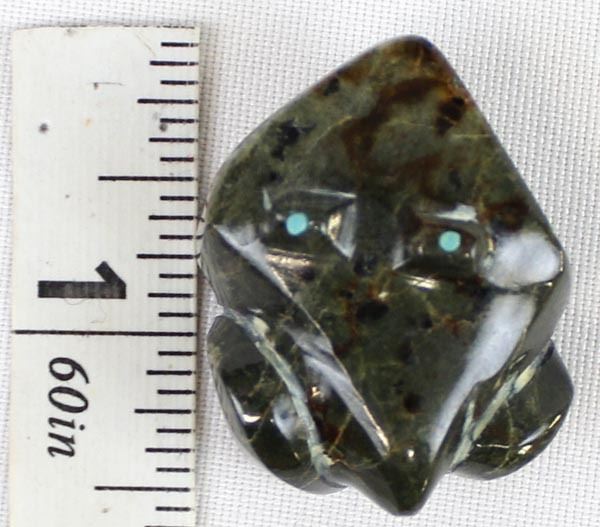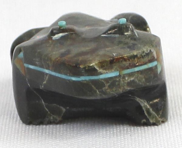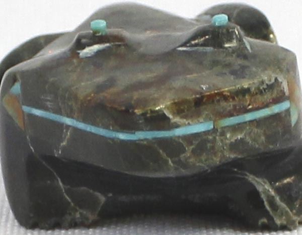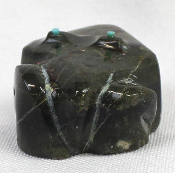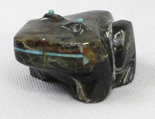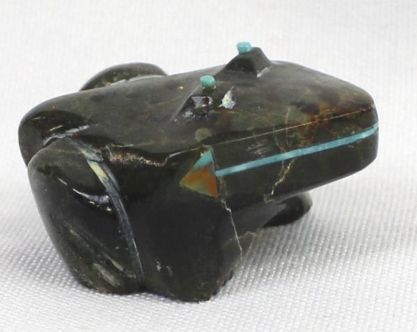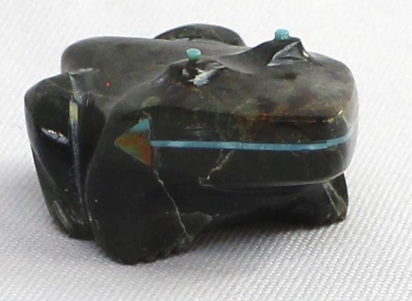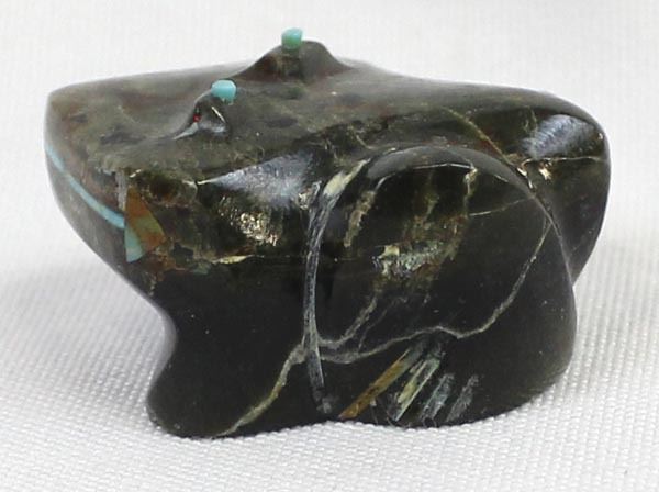 Native American Navajo Picasso Marble Frog Fetish by Begay, measures 1" x 1.5" and has artist's initials on the bottom, turquoise eyes