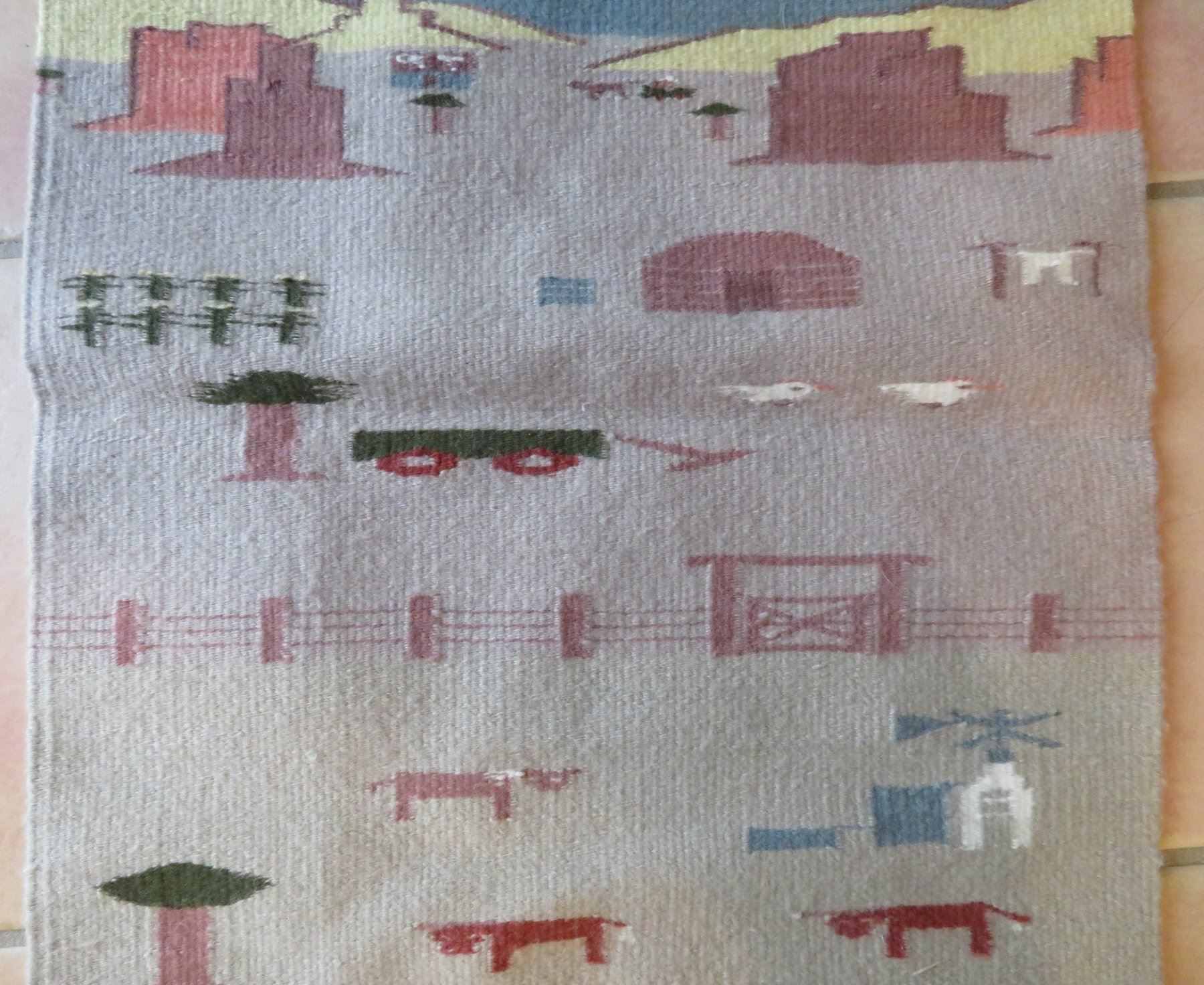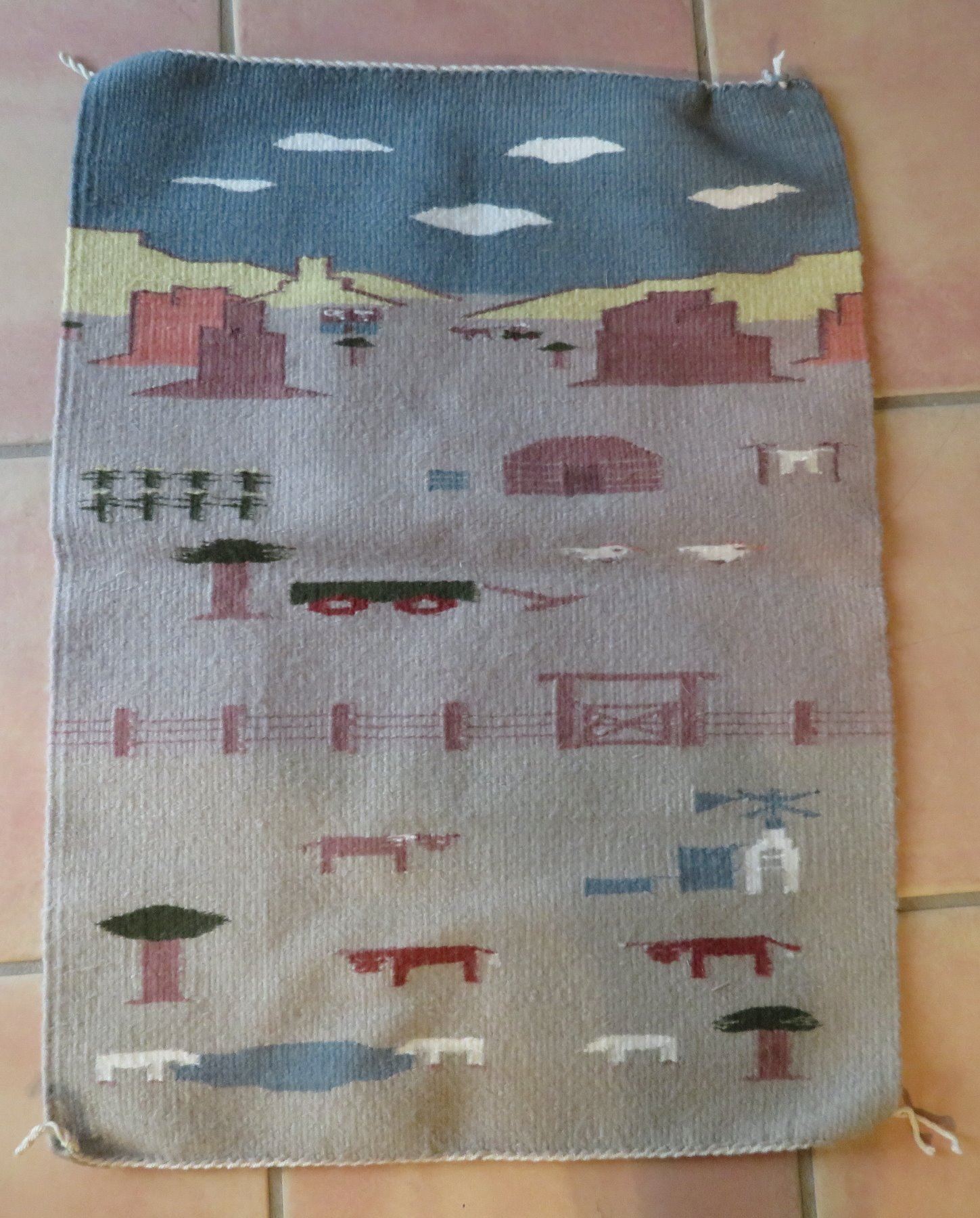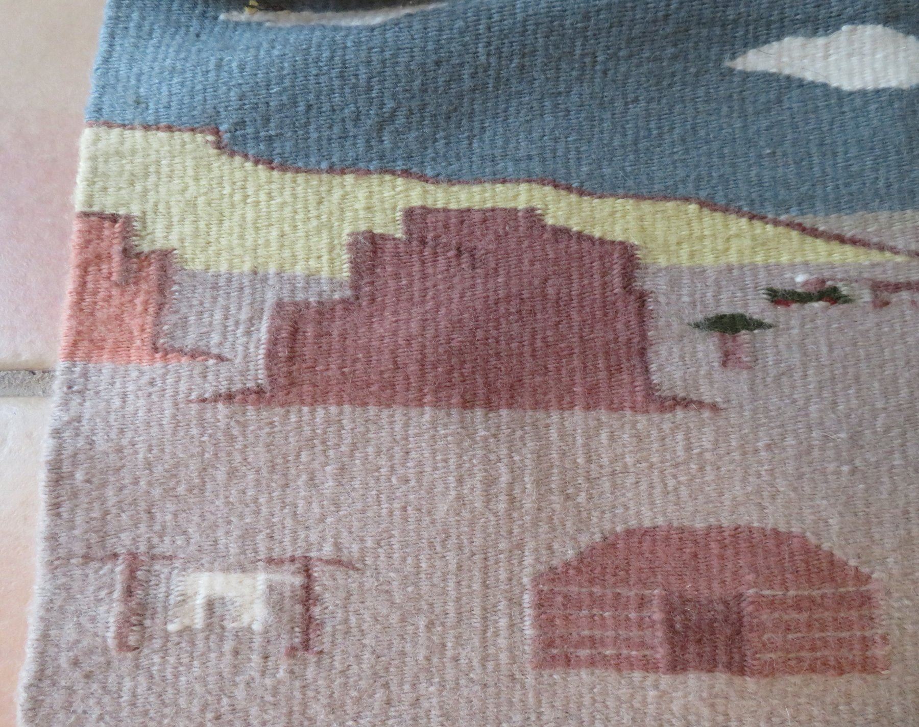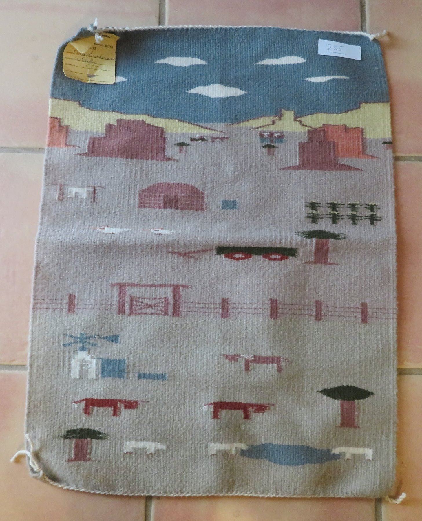 Navajo Pictoral Tapestry, c. 1980s. Made of wool and dye, the item measures 20" x 26 1/4". Navajo, New Mexico. Old tag data; Lena Buchanan, "WRock." Birds, trees, sheep, dogs, corn, fences, mountains, house, etc. depicted on this finely-weaved tapestry. Condition: Good, see images. Shipping: $20.00 w/insurance and signature, due to value.