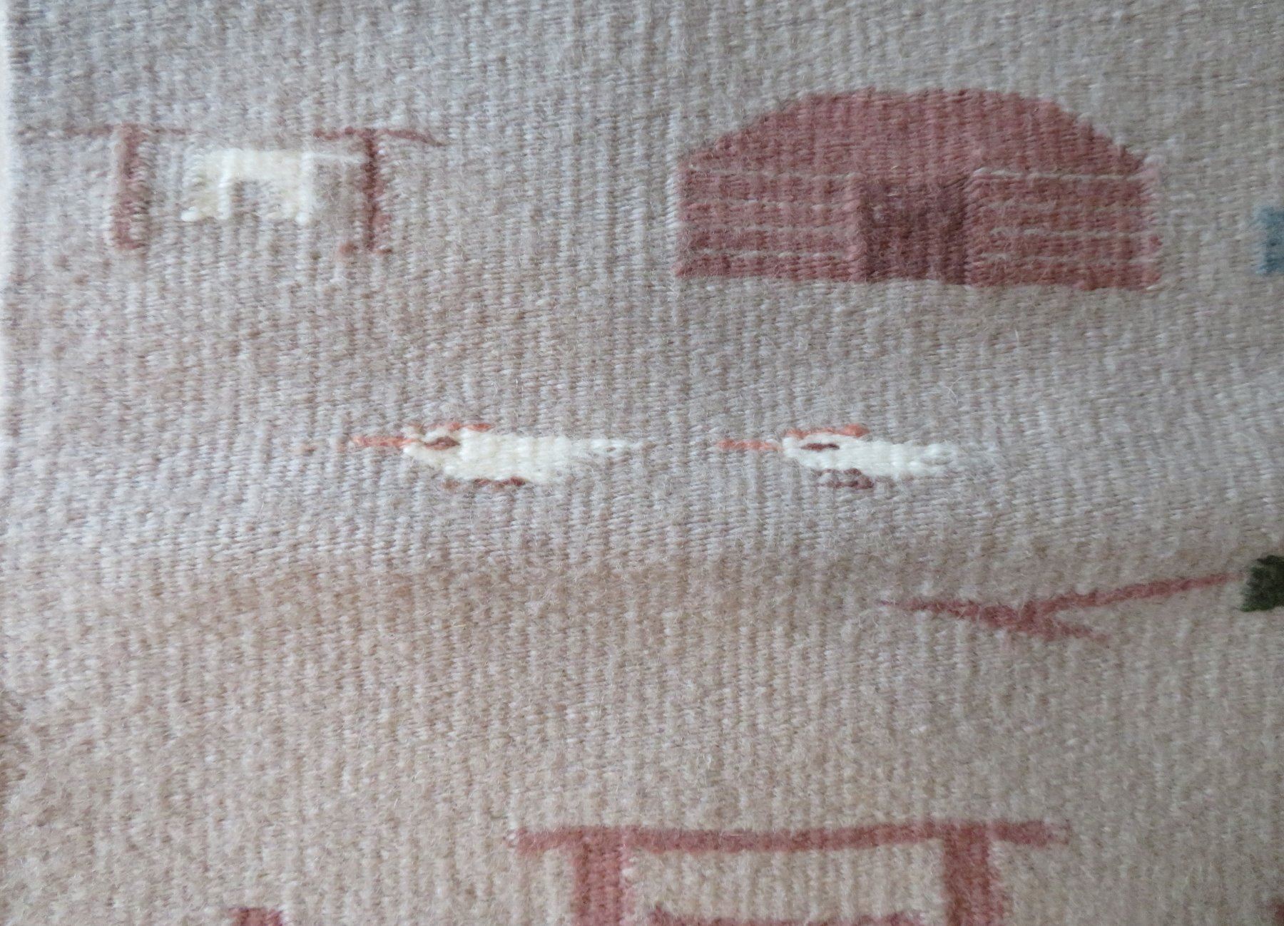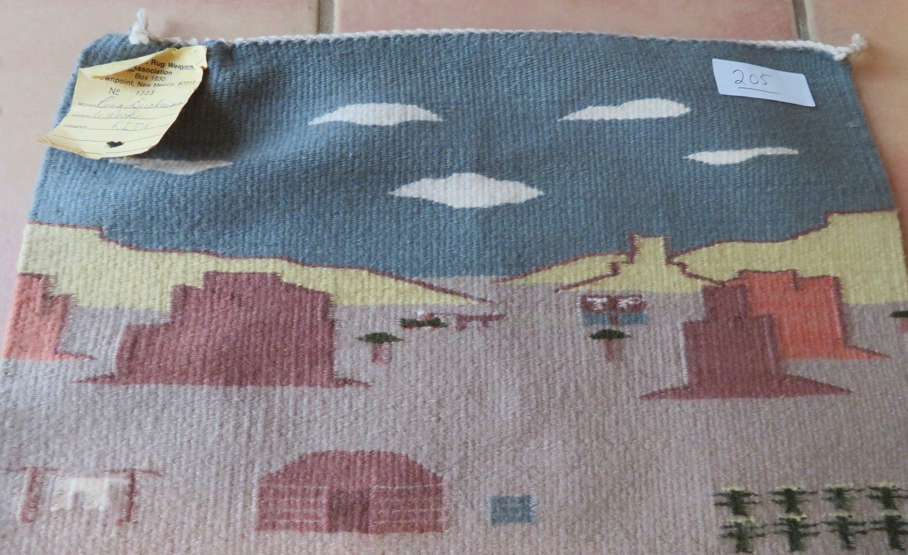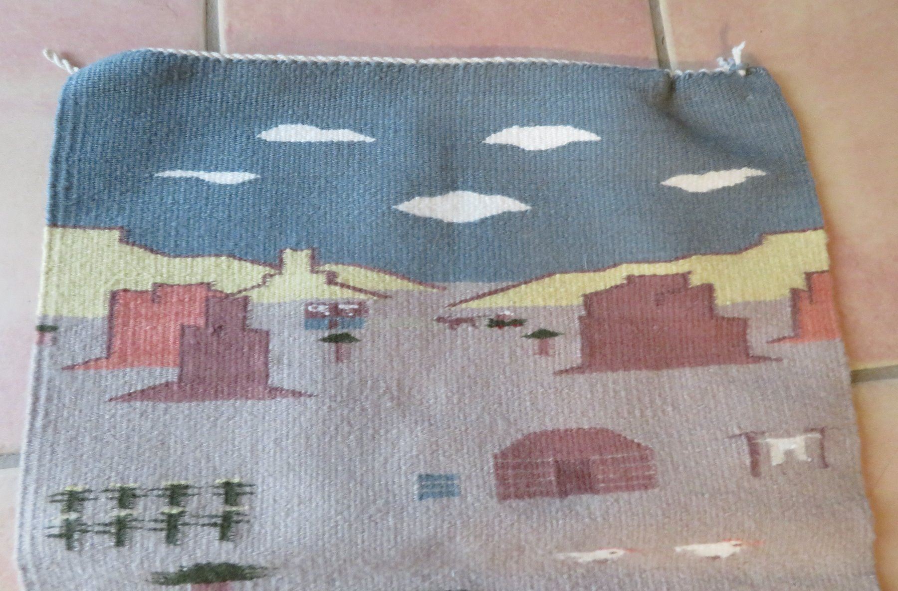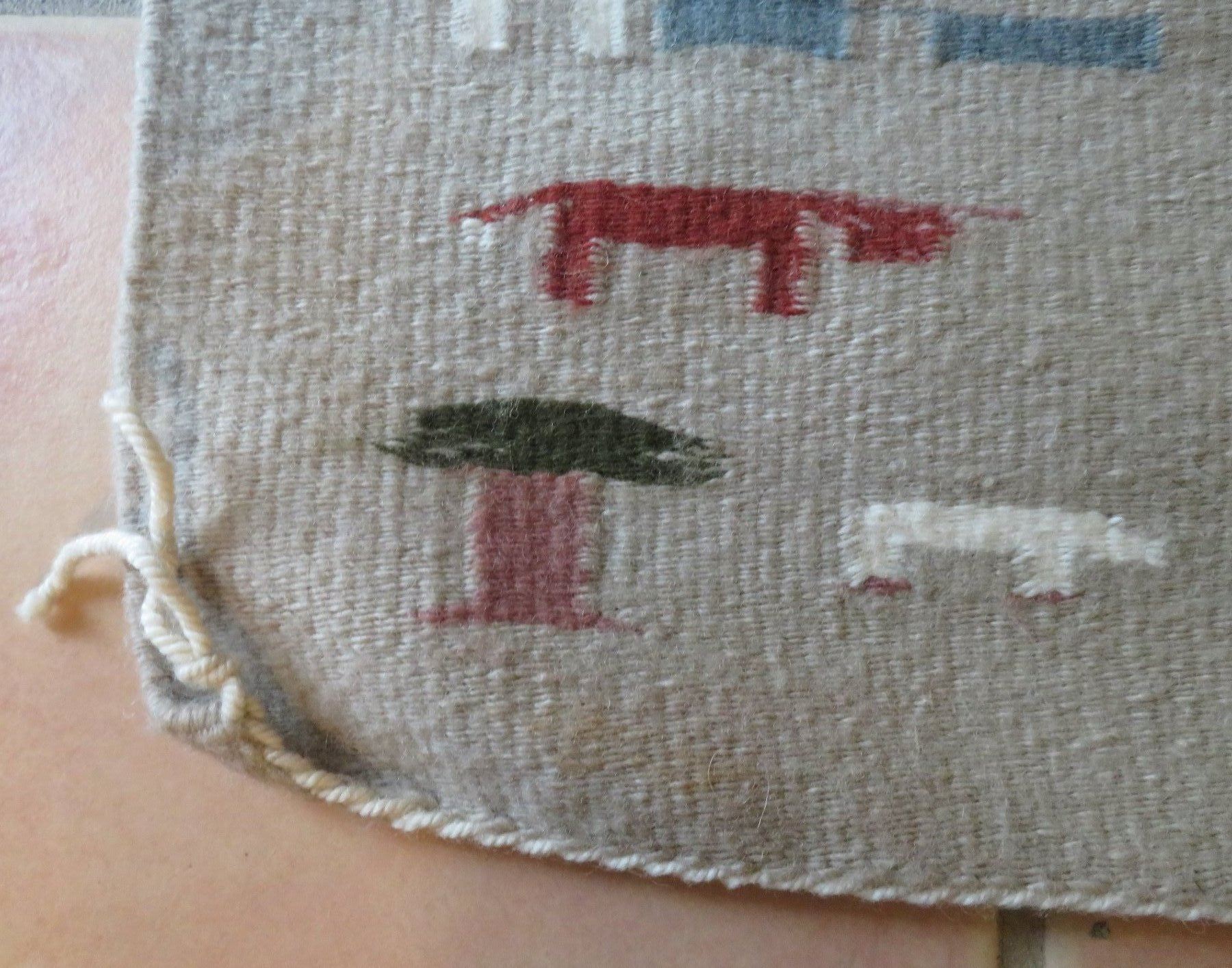 Navajo Pictoral Tapestry, c. 1980s. Made of wool and dye, the item measures 20" x 26 1/4". Navajo, New Mexico. Old tag data; Lena Buchanan, "WRock." Birds, trees, sheep, dogs, corn, fences, mountains, house, etc. depicted on this finely-weaved tapestry. Condition: Good, see images. Shipping: $20.00 w/insurance and signature, due to value.