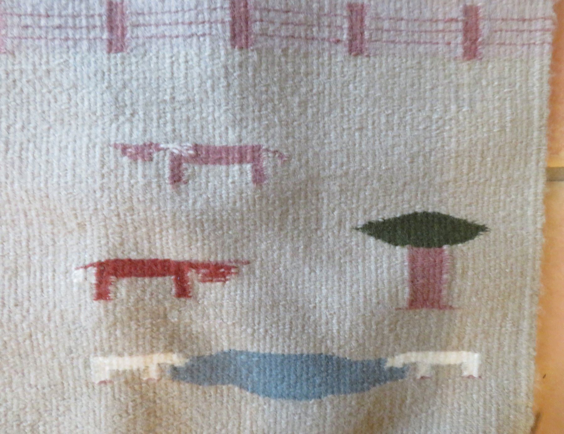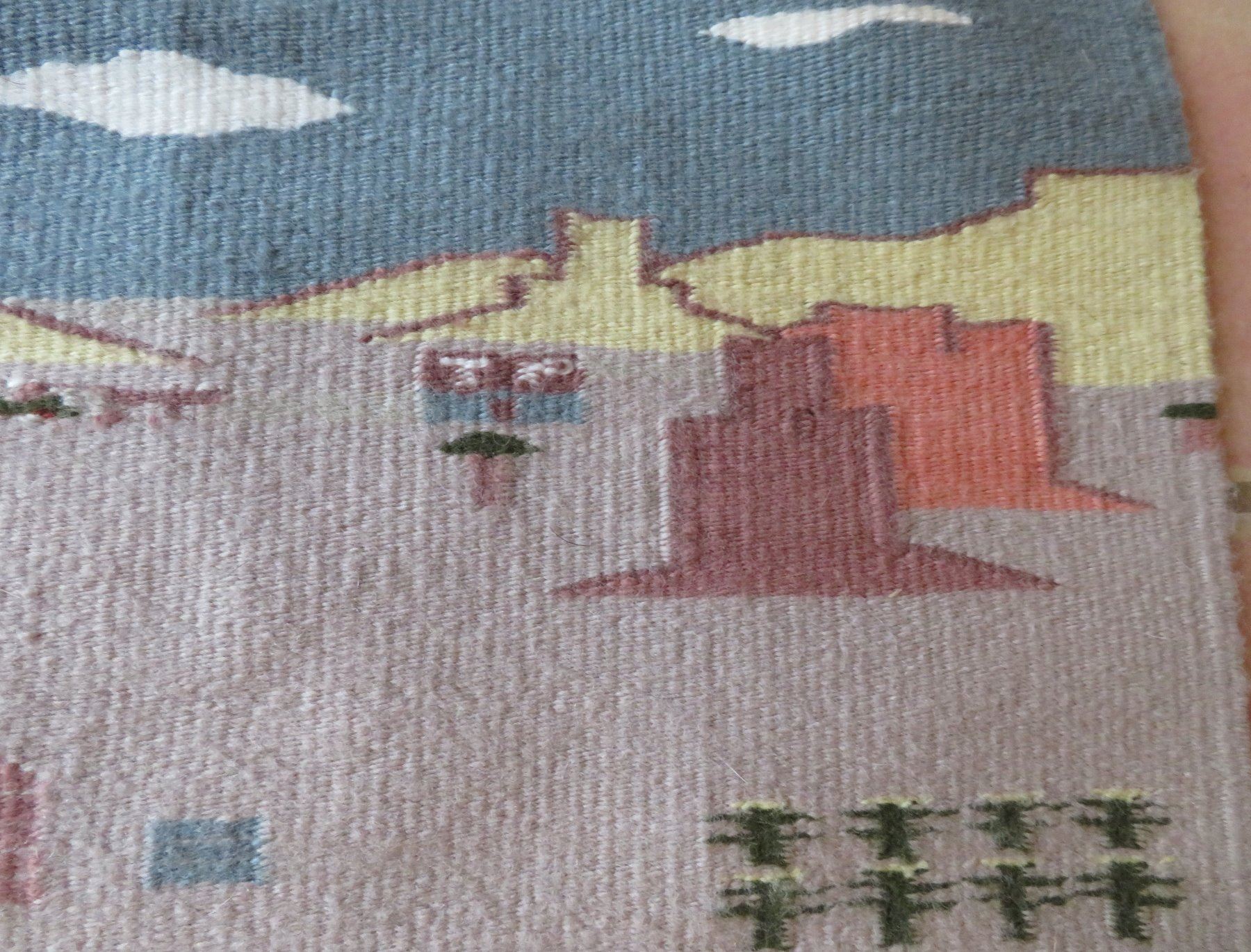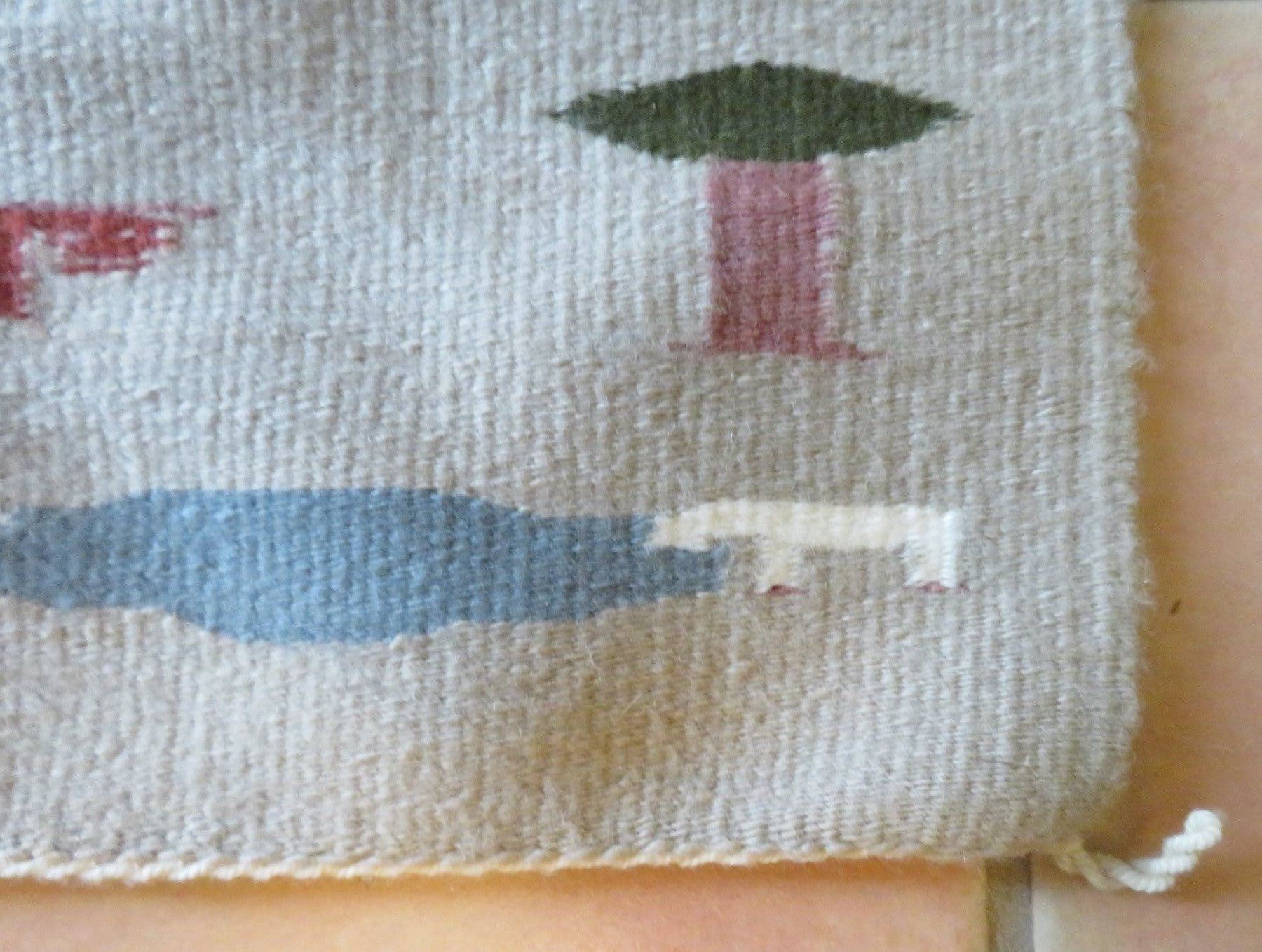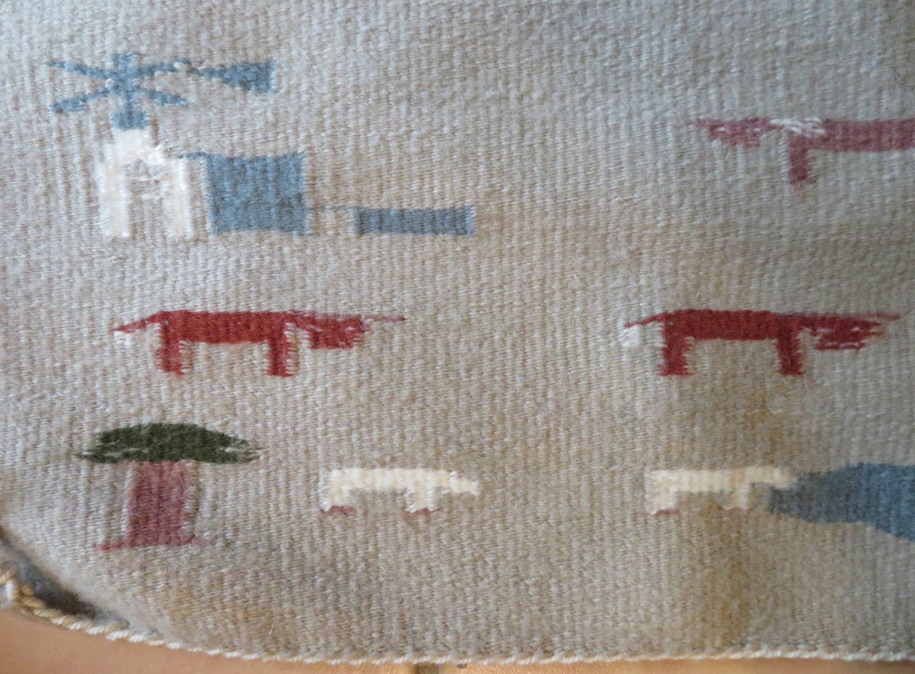 Navajo Pictoral Tapestry, c. 1980s. Made of wool and dye, the item measures 20" x 26 1/4". Navajo, New Mexico. Old tag data; Lena Buchanan, "WRock." Birds, trees, sheep, dogs, corn, fences, mountains, house, etc. depicted on this finely-weaved tapestry. Condition: Good, see images. Shipping: $20.00 w/insurance and signature, due to value.