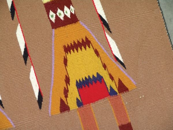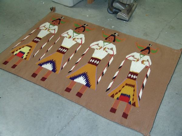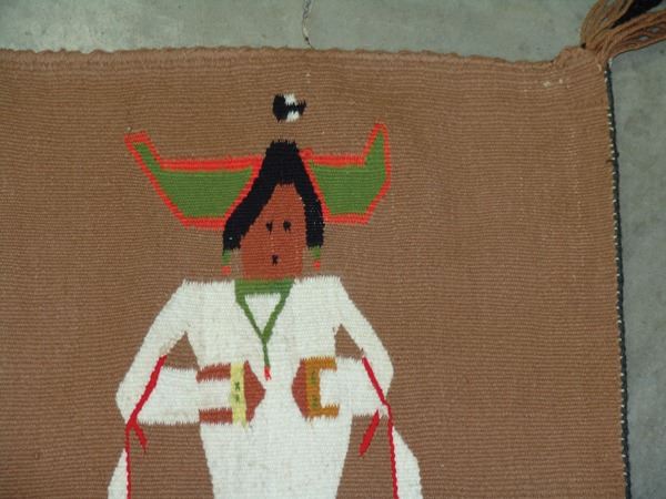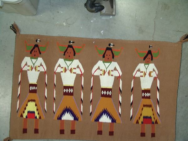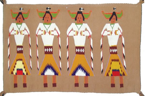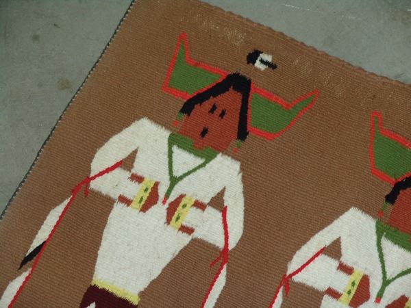 Ca.1970s-1980s 48" x 30" Rare, fine weave pictorial rug with four, colorful Kachina figures each in traditional skirts, and with their dance accoutrements at hand. Good condition, some light fuzz and fade.