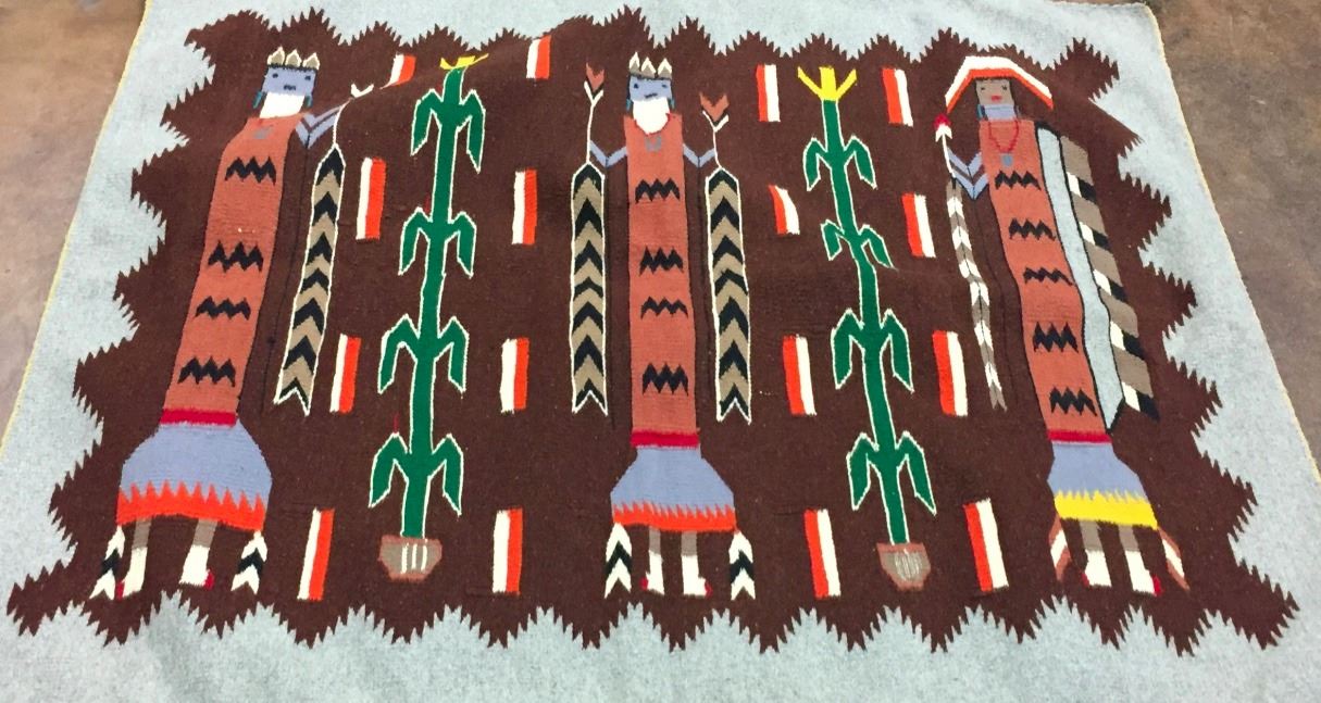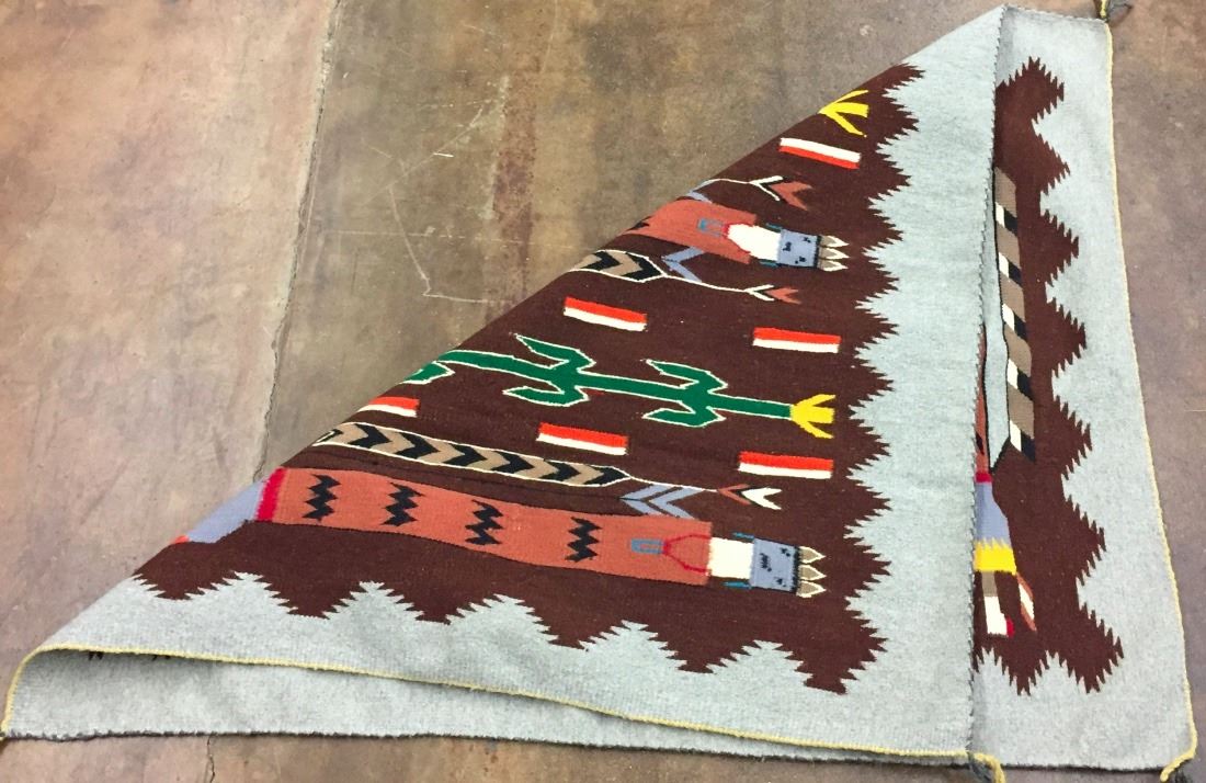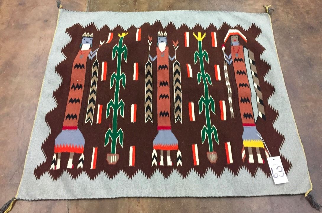 Maker: Unknown Navajo weaver. Approx. Age: Circa 1980s. Size: 39” x 44.5”. Condition: Good. Additional Info: A Navajo textile with a pictorial Yei design. Please look closely at the pictures - they are an important part of our description. Shipping: There will be a $5 handling / packaging fee for shipping this lot. The actual cost of postage will be added on top of that.