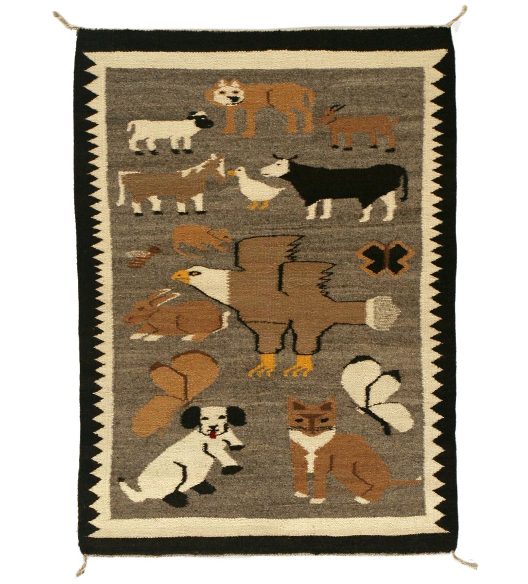 Navajo Pictorial Weaving. 3'4" x 2'6". Uncommon Navajo pictorial depicting a combination of fifteen animals and insects on grey field. Figures include: wolf, sheep, goat, horse, duck, cow, bee, mouse, three butterflies, rabbit, dog, cat and a prominent bald eagle. Circa 1950s.