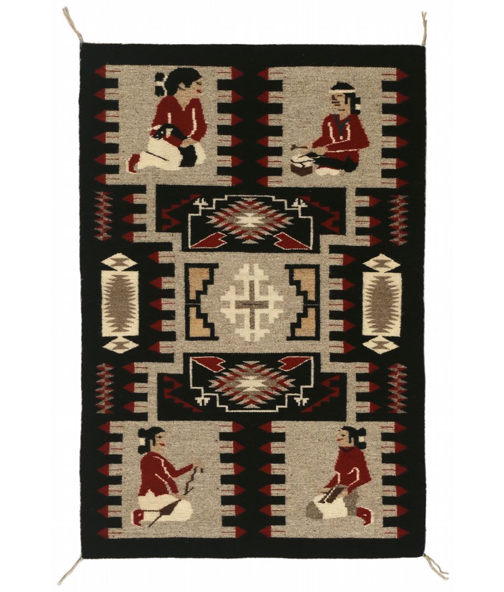 Navajo Pictorial Weaving. 3'6" x 2'4". Elaborate storm pattern with a seated figure in each corner. Woven by Jason Harvey. Late 20th century. Provenance: Indian River Gallery.