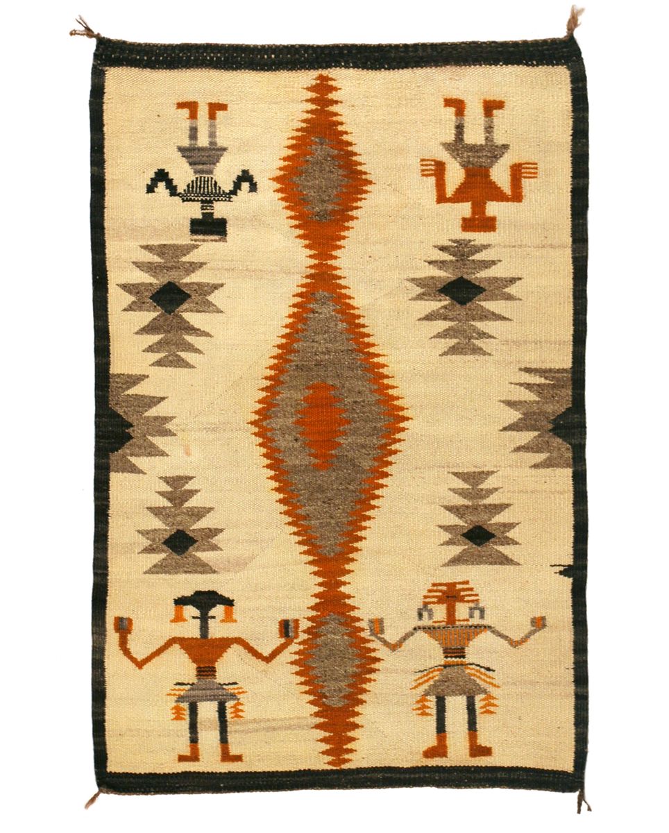 Navajo Pictorial Weaving. 4'2" x 2'10". A very nice old pictorial weaving with unusual Yei or human figures in each corner. Note the strange headdresses or heads on the figures. Circa 1920s-30s.