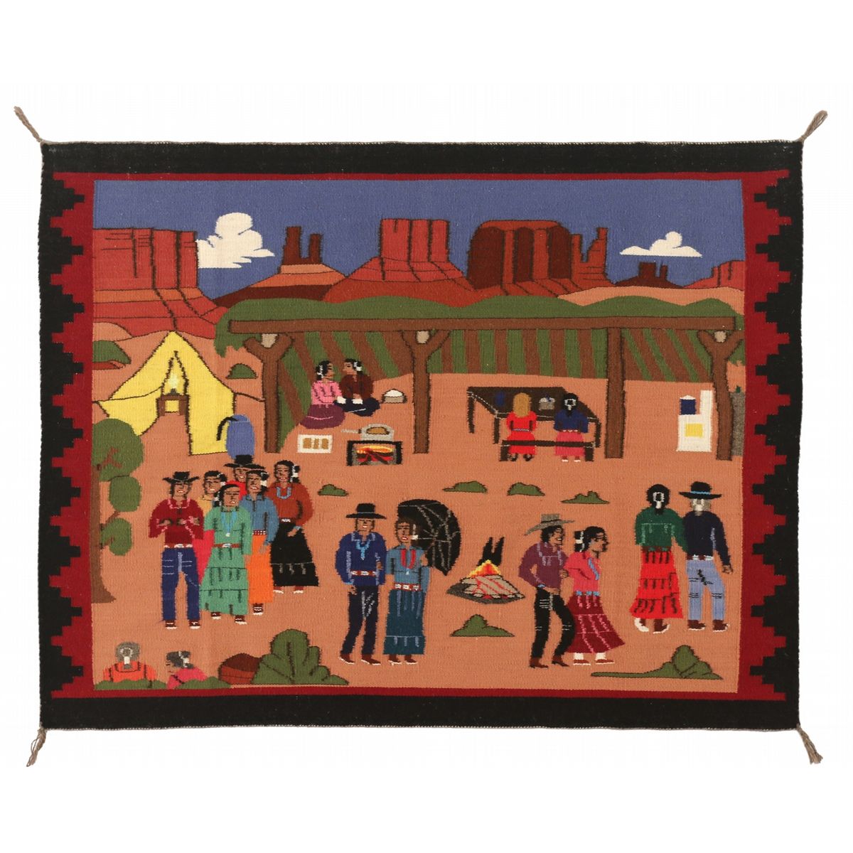 Navajo Pictorial Weaving. 4' x 3'1". Very detailed pictorial of a Navajo dance. Woven by Bernice Nez. Late 20th century. Provenance: Indian River Gallery.