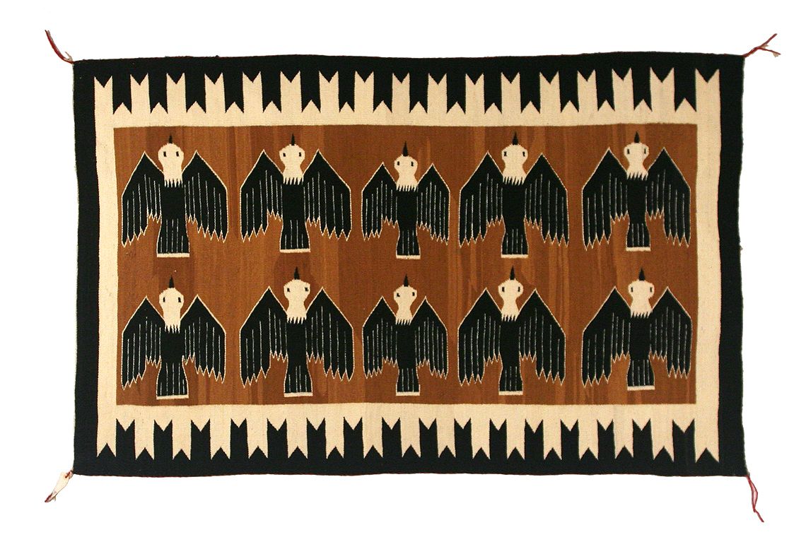 Navajo Pictorial Weaving. 6'5" x 5'1". Wonderful & rare with 10 Peyote water birds on a brown field, surrounded by a serrated border. Circa 1940s. (est. $4,000-6,000). CONDITION REPORTS: www.auctioninsantafe.com/docs/cr2012.pdf