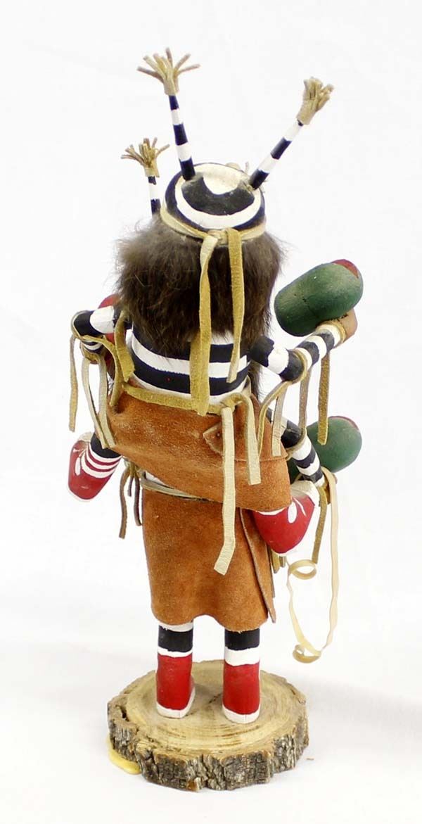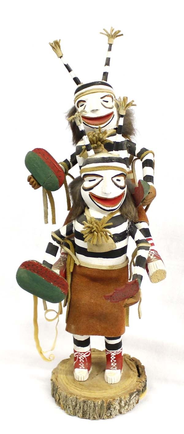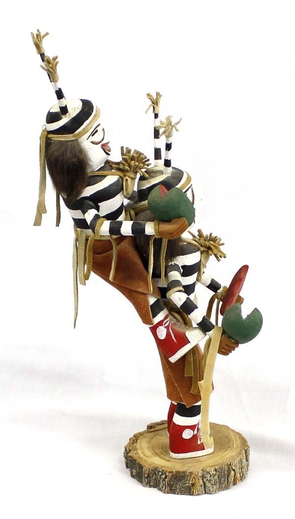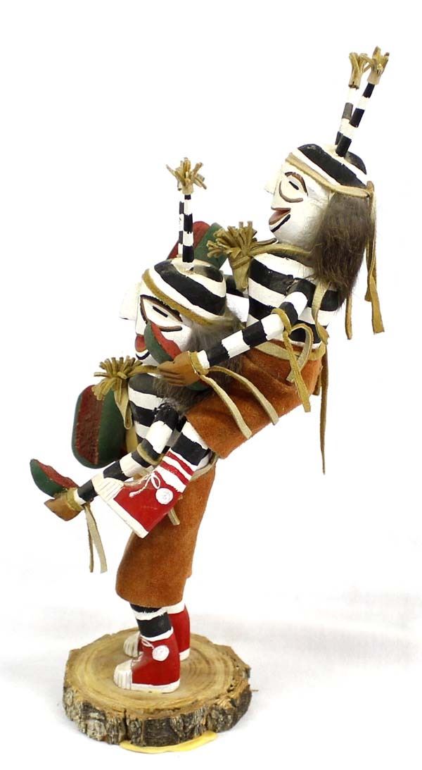 Native American Navajo Piggyback Koshare Clowns Kachina by Joe Vandever, signed on the bottom and measures 4'' x 14''H, embellished with leather and rabbit fur