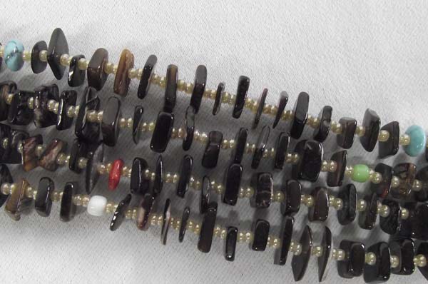 Native American Indian made by artist, Rita Begay. Three long strands of brown pin shell with accent beads of sterling silver, turquiose, red shell, measures end to end 34 inches. Beautiful piece of Native American jewlery. Buyers Pay Actual Shipping and Handling Charges(see terms and conditions for more information).