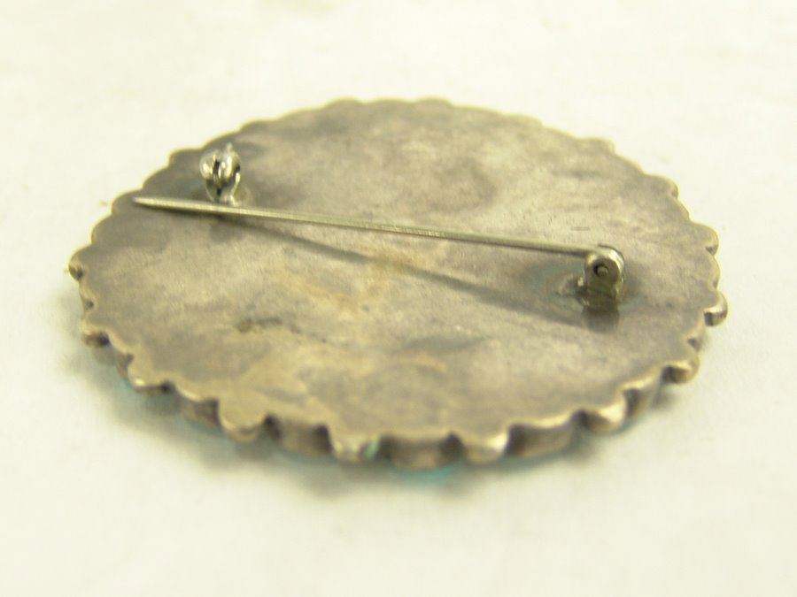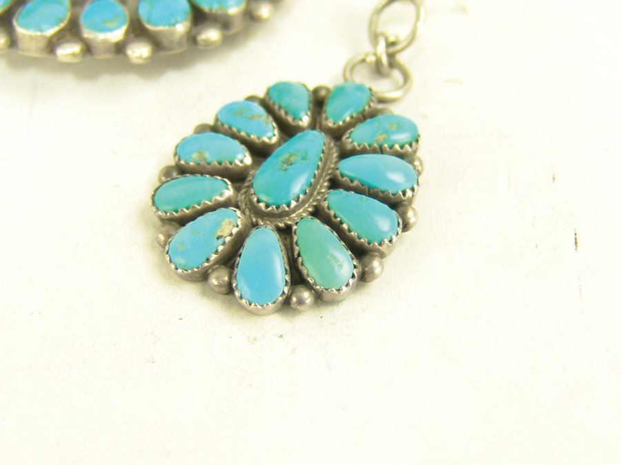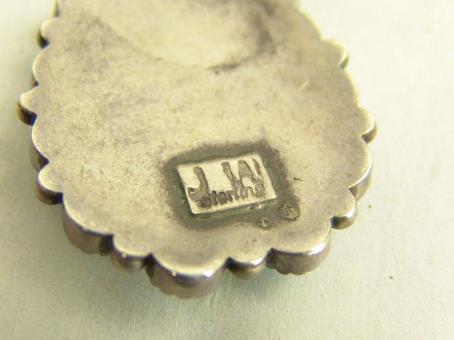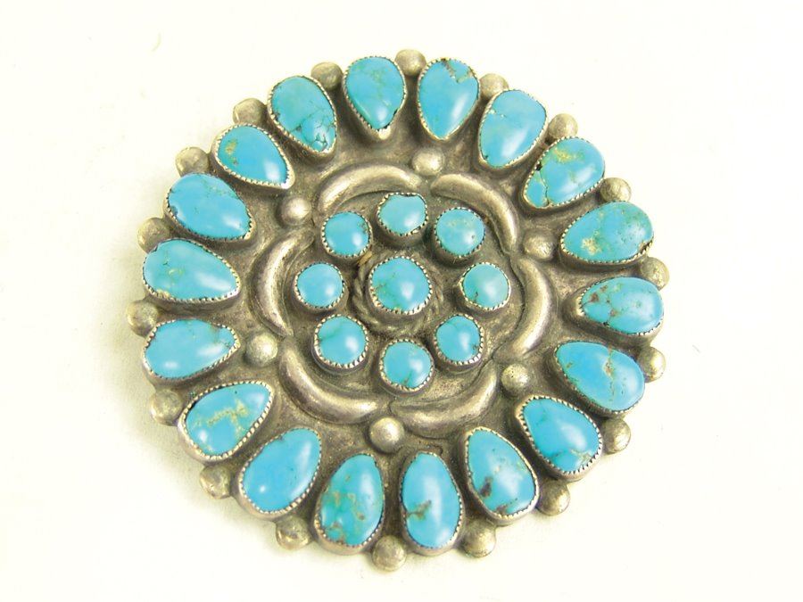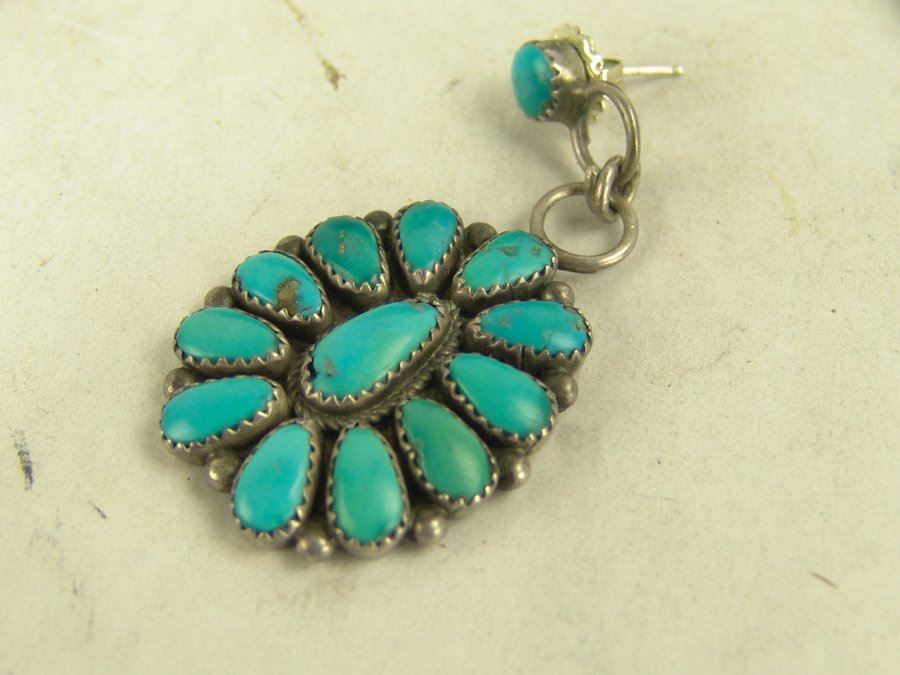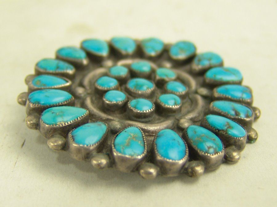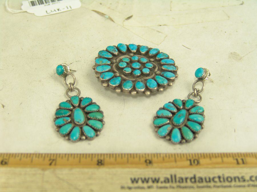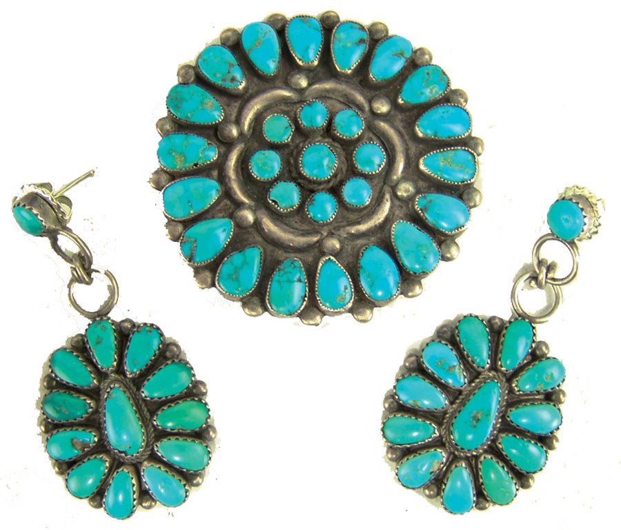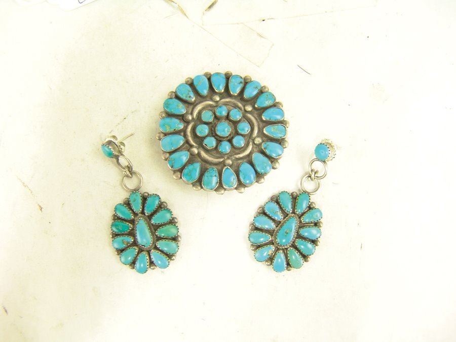 Pair of vintage turquoise and silver cluster design pieces a pair of earrings signed "JW" (early Juliana Williams) plus a round blouse pin with with crescent features. Very good/used condition.,,2"