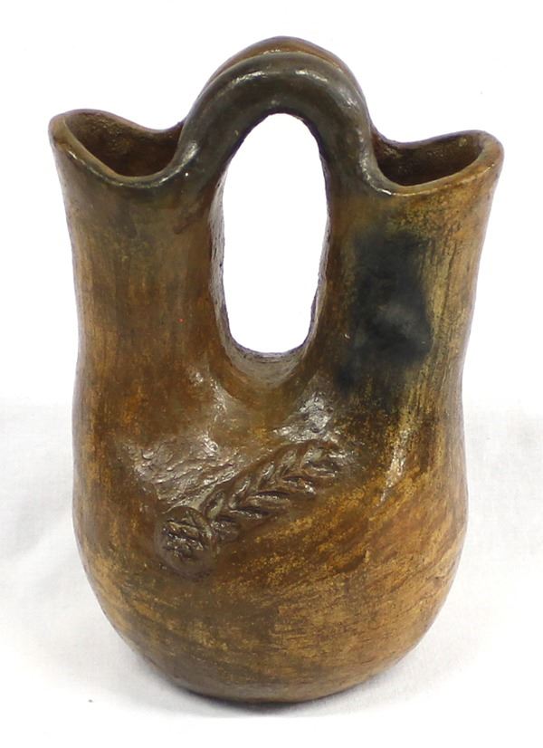 Native American Navajo Pine Pitch Pottery Wedding Vase, measures 5'' x 8'' x 4'' and has artist's initials LH on the bottom, pine cone and pine needle branch motif, beautiful wedding vase