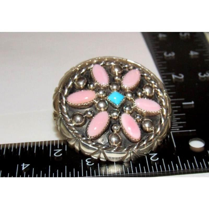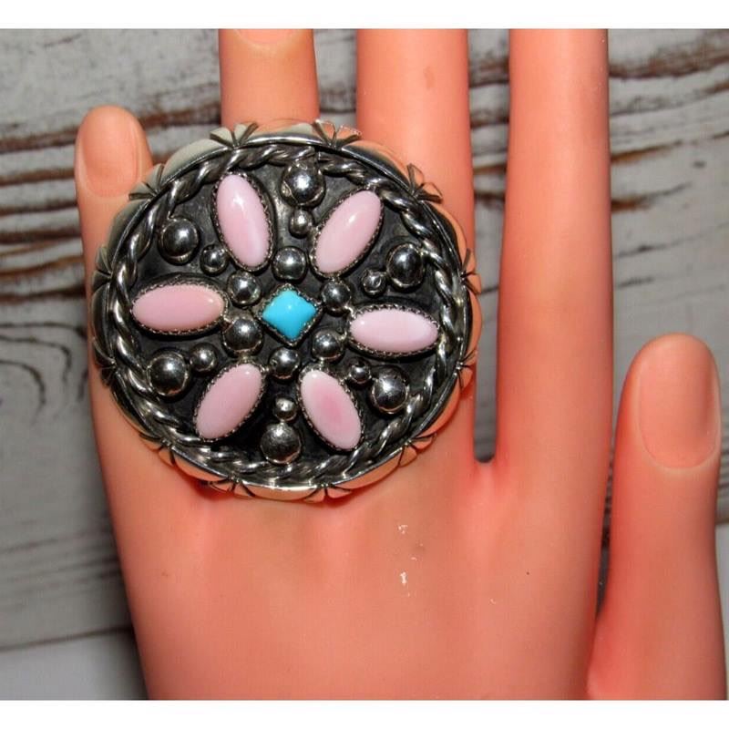Elevate your jewelry collection with a truly unique piece: the massive, one-of-a-kind Navajo Sterling Silver Pink Conch & Turquoise cluster ring handcrafted by the talented Navajo artist J Begay. With unparalleled artistry and meticulous attention to detail, this exceptional ring stands as a wearable masterpiece. Sized at 5. The ring boasts an impressive size of of 2 inches on the front in diameter, showcasing the captivating cluster design that Navajo jewelry is celebrated for. Signed, marked, and tested, this piece carries the legacy of authenticity. Experience the essence of Native American craftsmanship and make a statement with this extraordinary adornment. FREE SHIPPING ON ALL JEWELRY ORDERS WITHIN THE US!