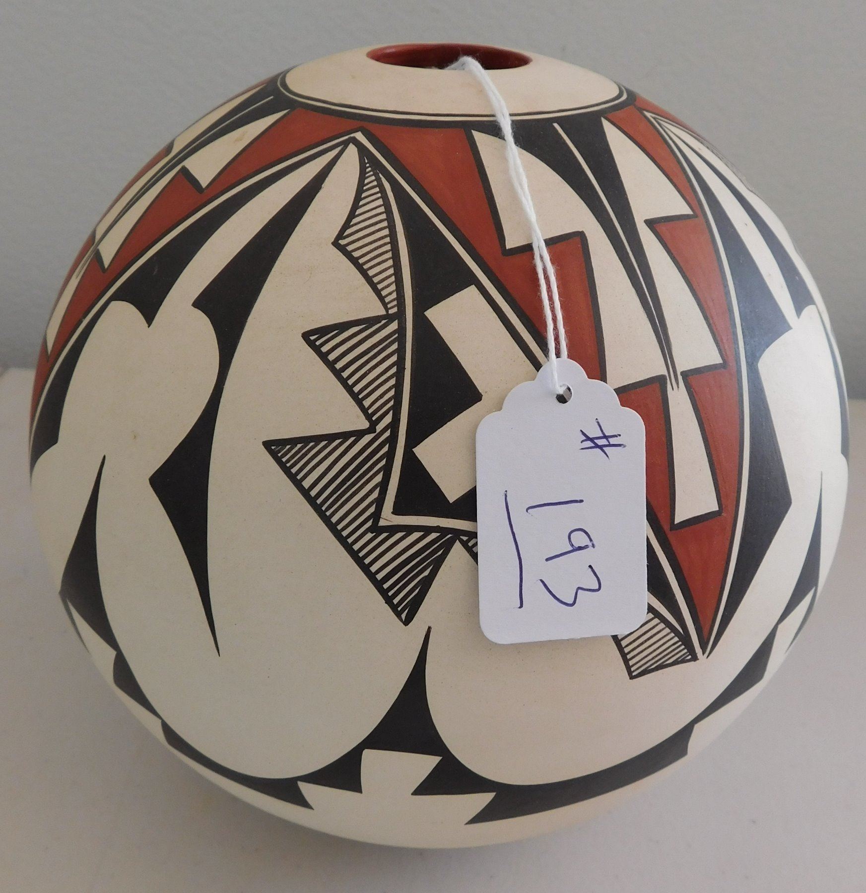 Navajo Polychrome Olla, 1988. Made of clay and paint, the item measures 7.5" x 7". Navajo, New Mexico. Signed Mary Saxon. Condition: Good, see images. Shipping: $40.00 w/insurance and signature, USA estimate only, double-boxed, due to value and size.