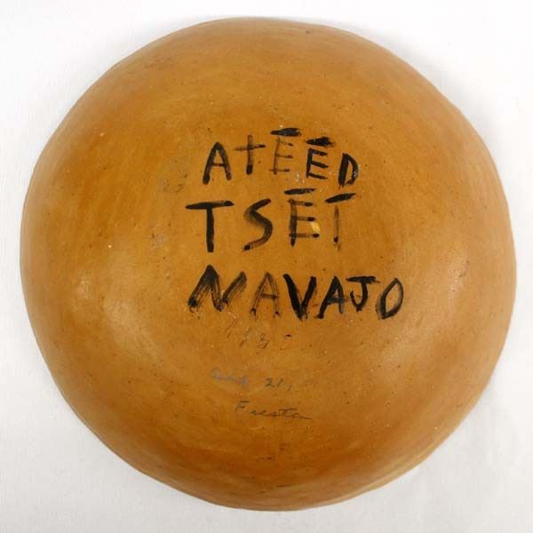Native American Navajo Pottery Bowl by Ateed Tset, measures 6.25'' x 1.75'', signed on the bottom, written in pencil on the bottom reads ''Aug. 21 Fiesta'', nice thick walled piece, FYI: I researched what Ateed meant in the Navajo Language which means 'Girl', perhaps this piece was made by a Navajo child.