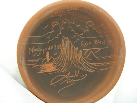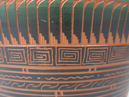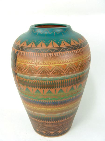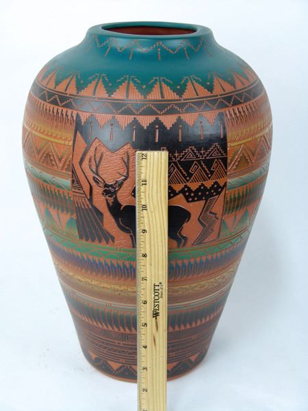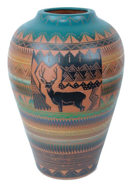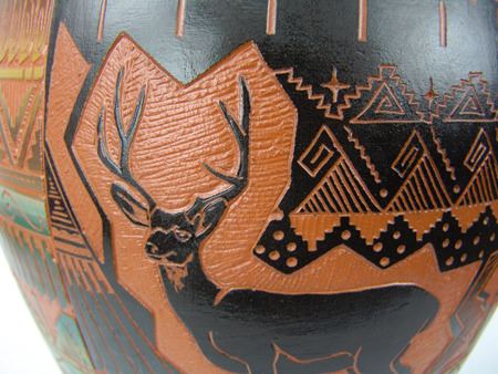 Late 1900s, Large and colorful greenware floor jar/vase with elaborate etchware designs, including a deer panel. Very good condition. 16" x 10"