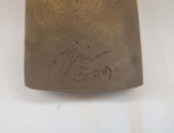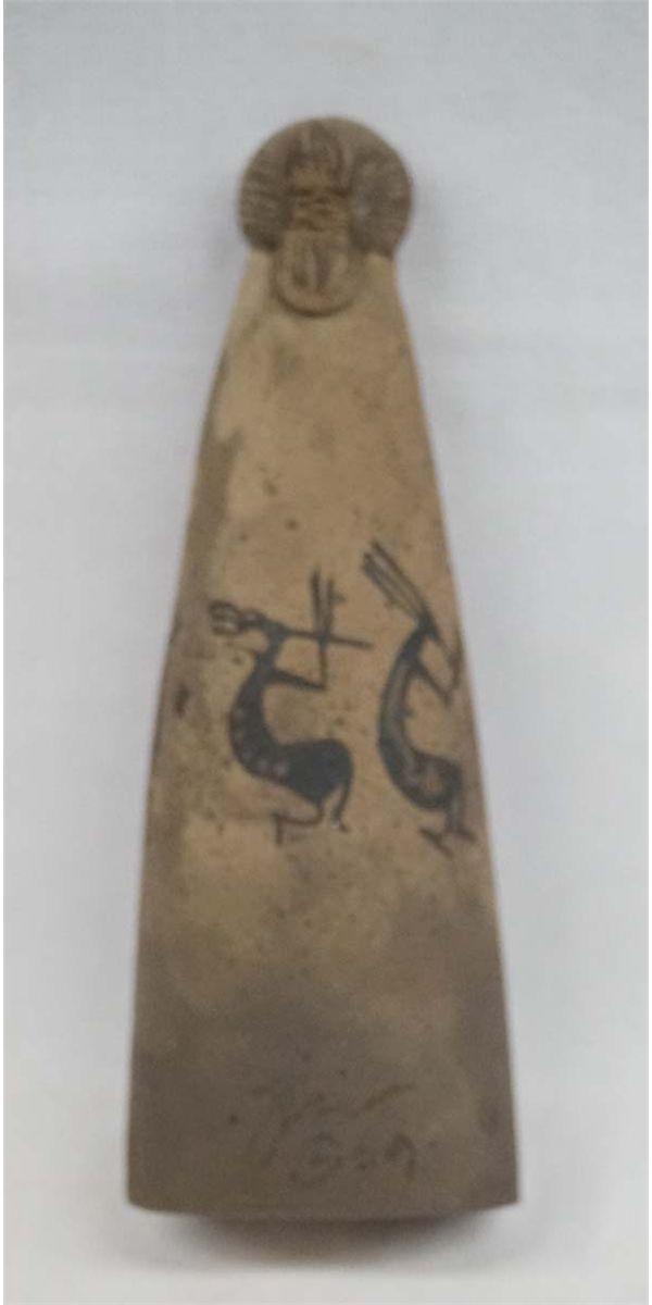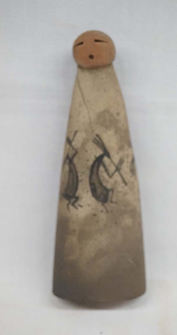 Navajo Pottery Maiden Sculpture, measures 5.75''H x 2''W X 1.5''Deep, her robe is adorned with Kokopelli Dancers, signed