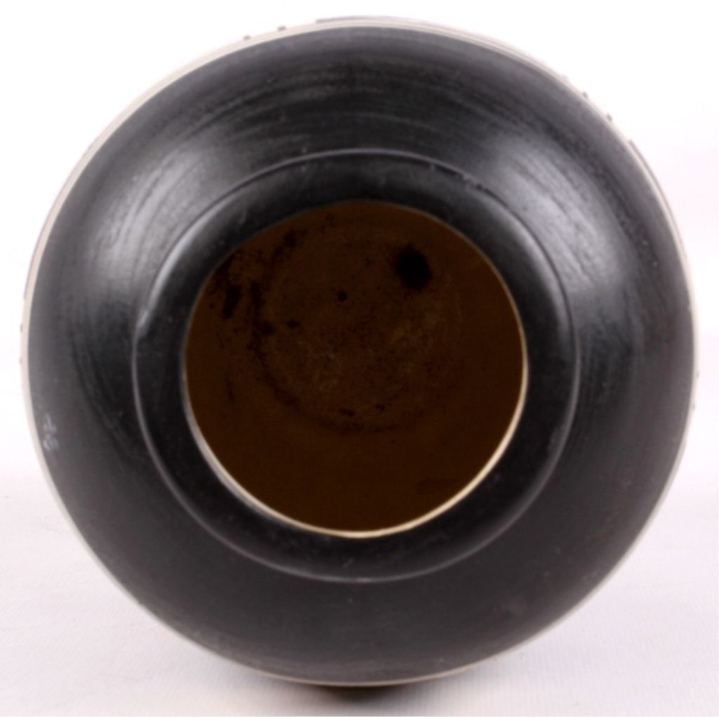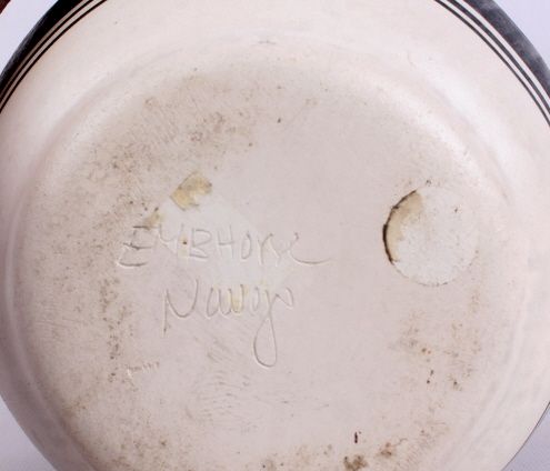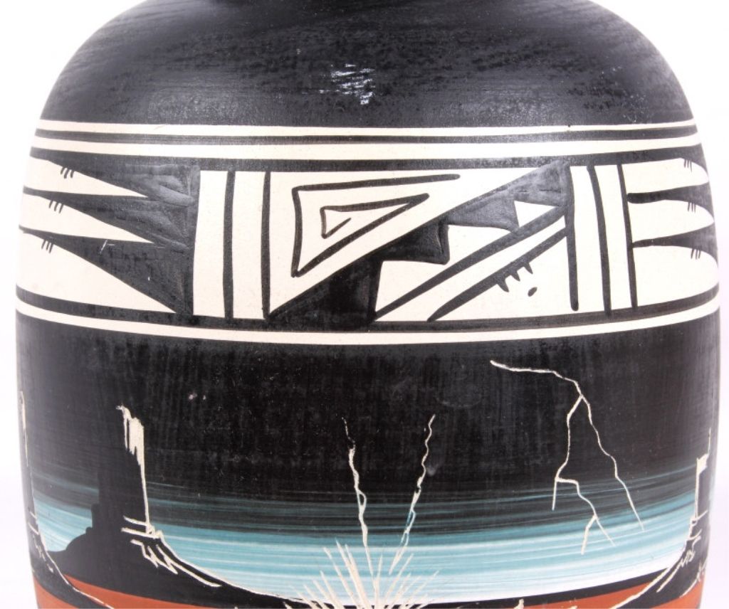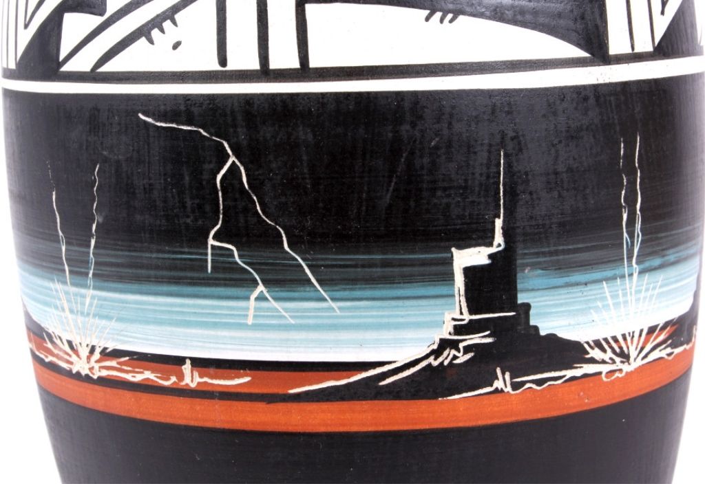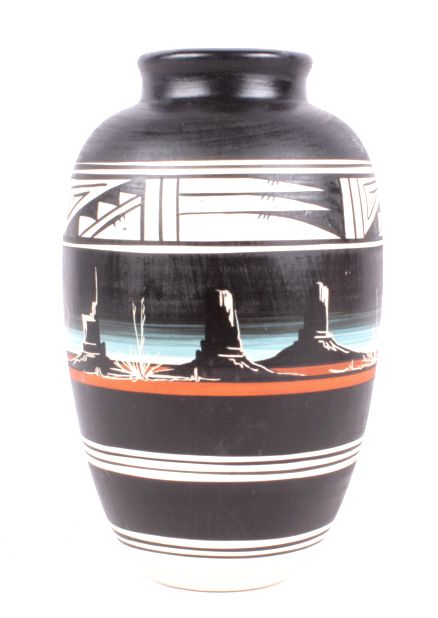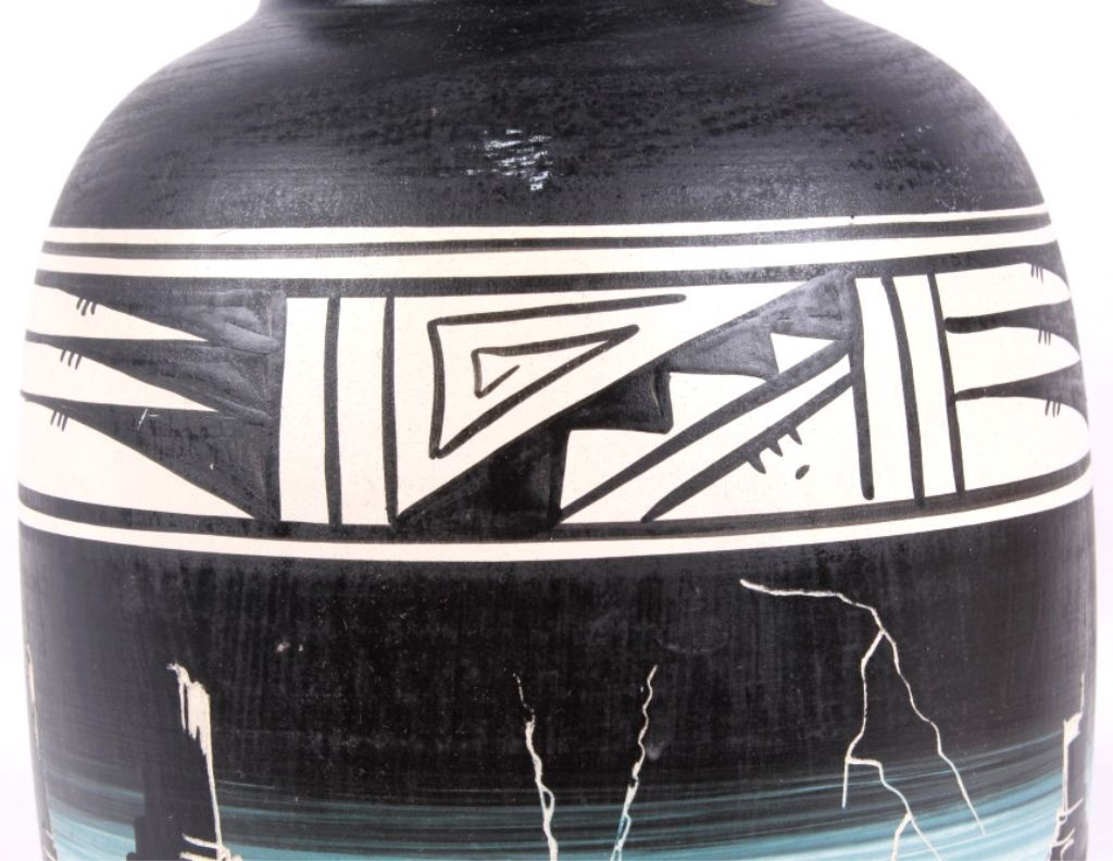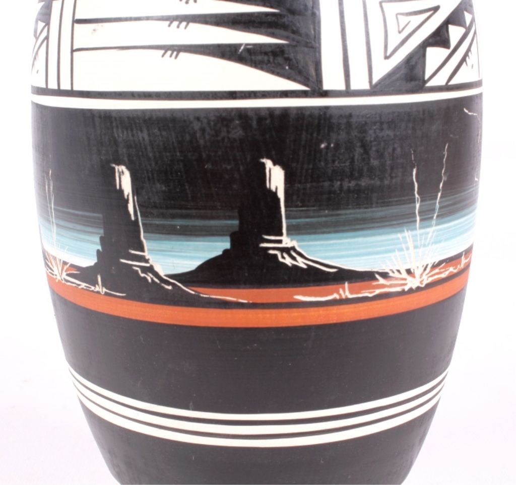 This is a genuine Navajo Native American hand made piece of pottery. This features hand painted designs and cliffs with a signature on the bottom. It measures 5.5" x 9.5".