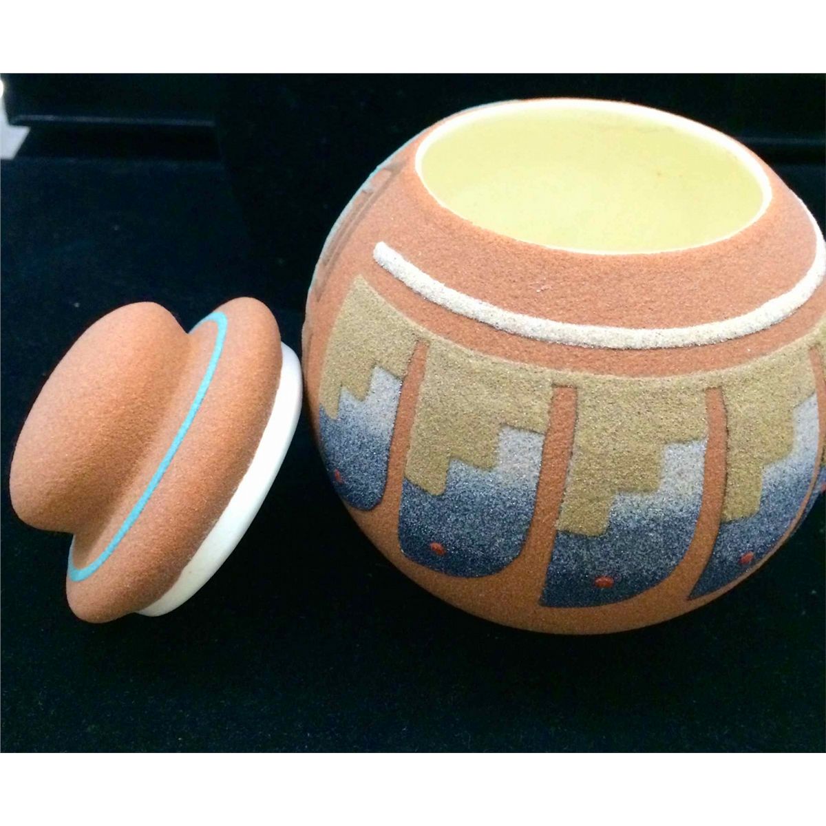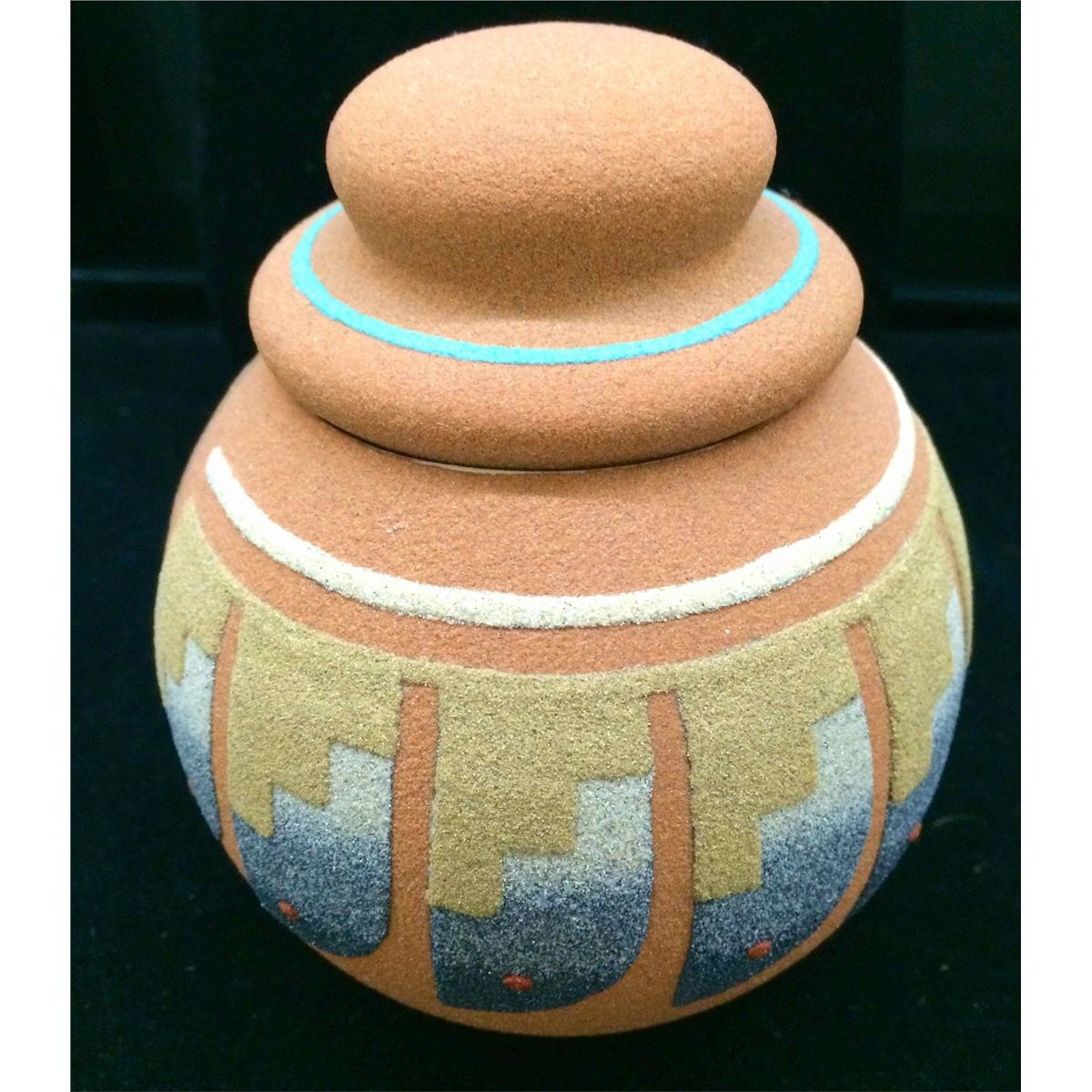 Nicely done ceramic pot with lid. Hand sand painted finish. Approximately 5 1/2" tall.