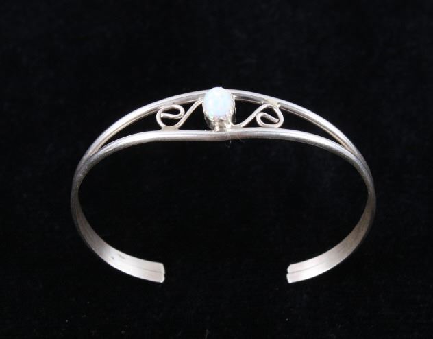 Included in this lot is a Navajo Native American sterling silver and precious opal bracelet. This bracelet features a lovely petite cabochon of precious opal. This opal gemstone showcases a wonderful play of color featuring a vast array of colors including, red, orange, green, blue, and purple. The gemstone is accented by stylized silver twists on either side. This dual band bracelet shows very good condition and features a .925 stamping on the interior of the bracelet. The interior of the cuff measures approximately 5 ½”.