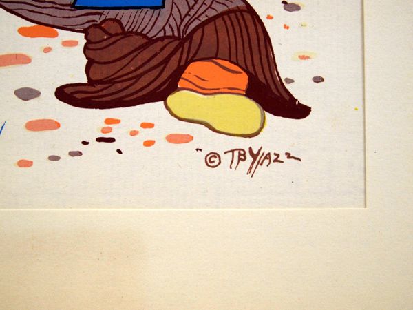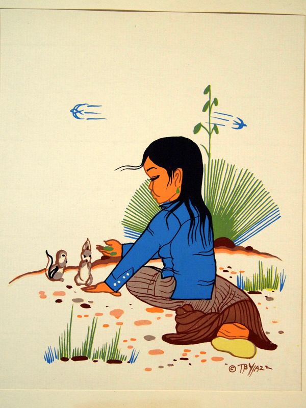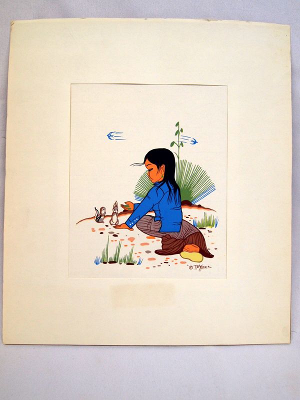 Navajo Print by Beatien Yazz, measures 6.5''H x 5''W, Indian Name: Beatien Yazz (Little No Shirt),A.K.A.: Jimmy Toddy, Born March 5, 1928 near White Ruins, AZ. Son of Desbah and Joe Toddy, Military: U.S. Marine Corps, Code Talker, World War II (South Pacific and China Theaters), Education: Santa Fe; Ft. Wingate; Mills, 1949 under Yasuo Kuniyoshi, Chicago Art Institute, Occupation: Navajo Police Department, Fort Defiance, Arizona; Carson Indian School art teacher, illustrator, and professional painter. Medium: oil, acrylic, casein, tempera, pencil, pen & ink, pastel, and prints, In recent years the artist's eyesight has deteriorated, and he has only peripheral vision. According to his long-time friend, Sallie Lippencott Wagner, he has glaucoma, and it has progressed too far to be treatable. He continues to paint, but only in a limited way.