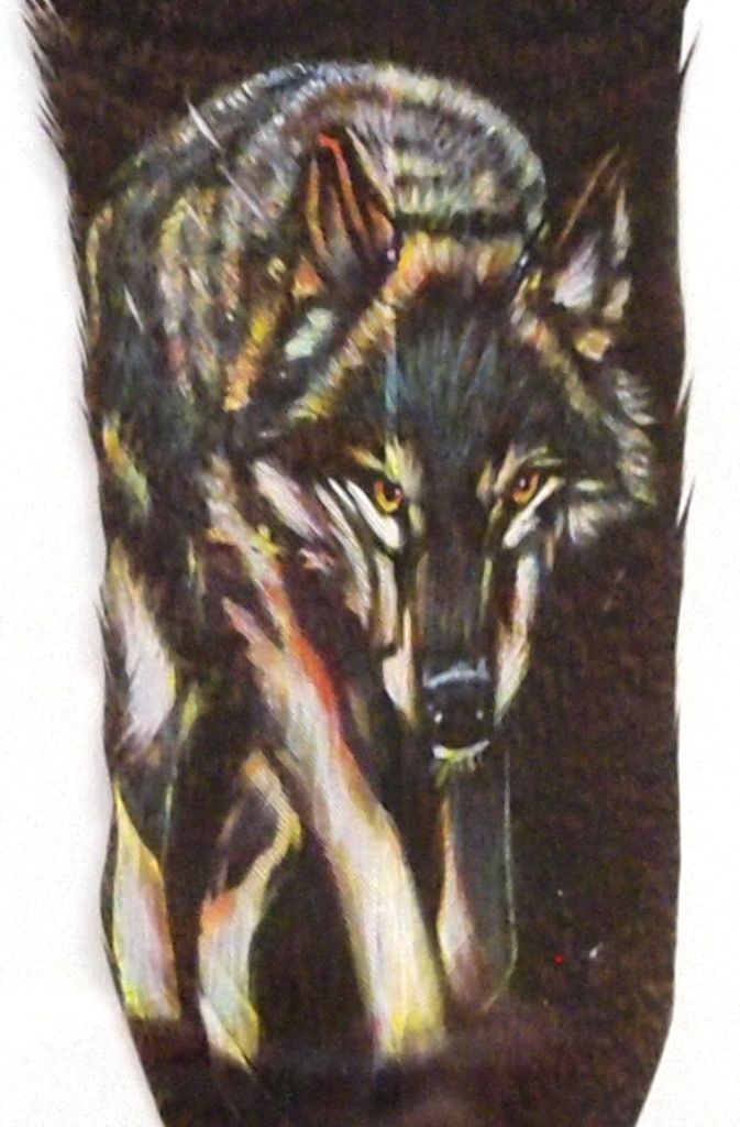 Painting is titled "Prowling Wolf". Frame measures 16-1/2" tall by 13-1/2" wide. Feather measures 9-1/4" tall by 3-1/4" wide.