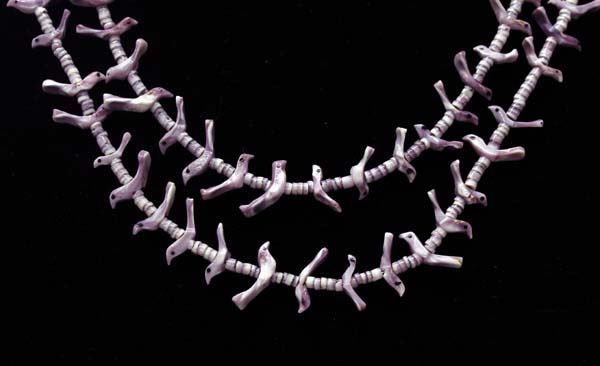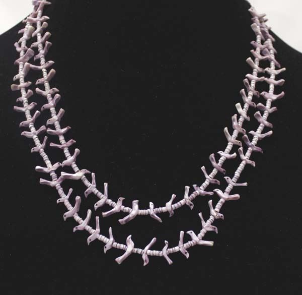 Native American Navajo Purple Shell Bird Fetish Necklace, sterling cones and beads, measures 20'' end to end and has 80+ carved birds