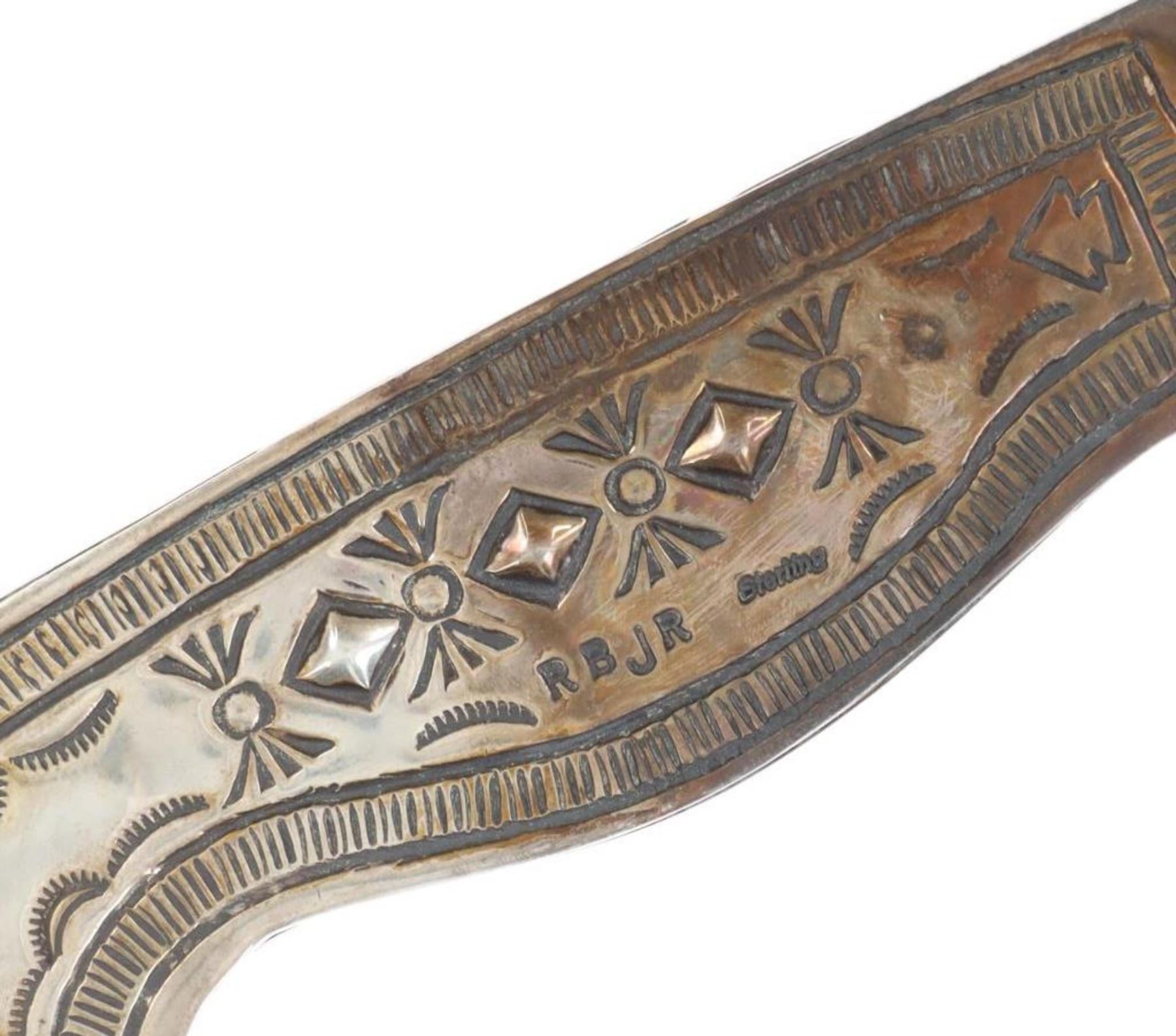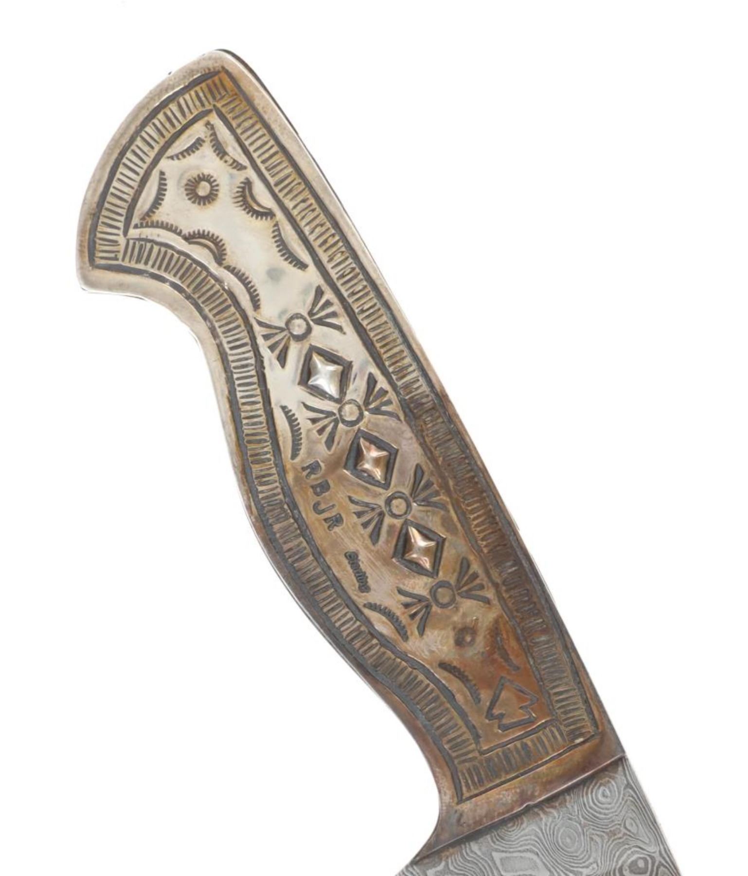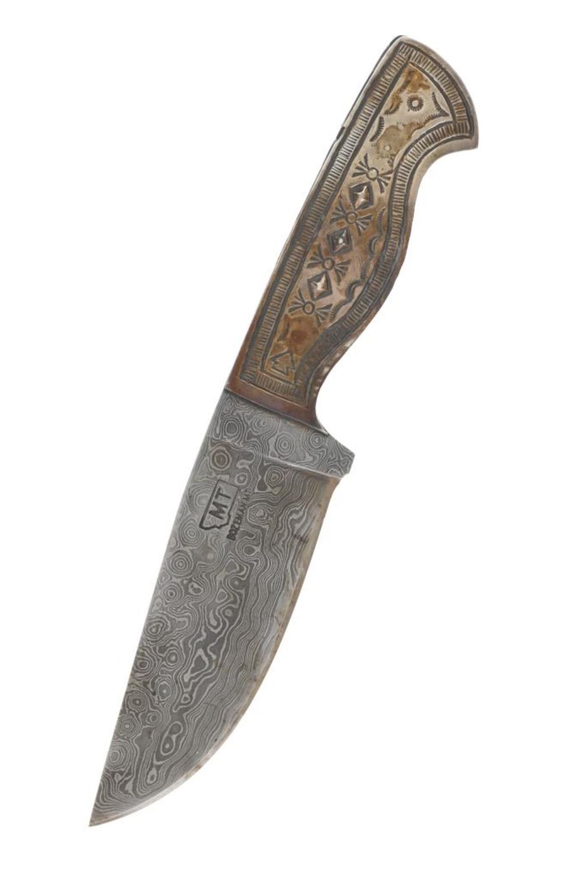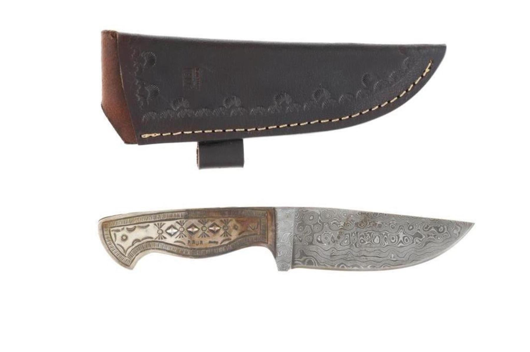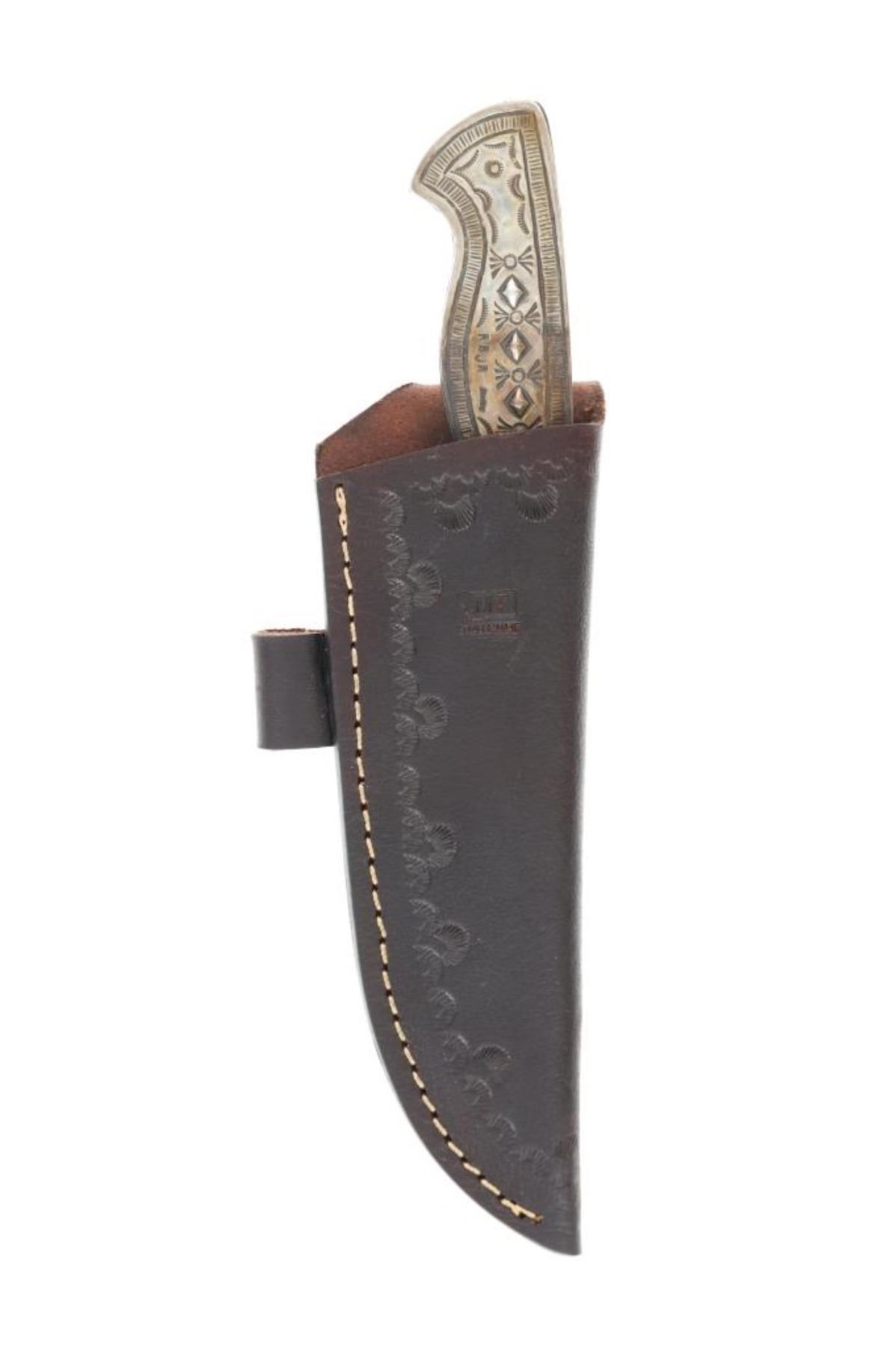 Featured in this lot is this outstanding silversmith work by master Navajo Native American Indian, Randy Begay Jr., set on an original Montana Territory Knives Damascus blade. The knife shows two scales of sterling silver with repoussé, highly figured stamping with Old Pawn stylings. The silver is set onto an original forged Damascus blade from Montana Territory Knives of Bozeman, Montana. The blade bears the “MT (surrounded by an outline of Montana) BOZEMAN MT” forged stamp on the left side of the blade. The silver is stamped on the left side of the handle with Randy Begay Jr.’s signature hallmark, “RBJR Sterling”. The blade is paired with an original, thick, genuine leather Montana Territory Knives Bozeman, MT sheath, which has been hand tooled/stamped and bears the hallmark. The piece is handmade and has small imperfections that comes with any handmade piece, along with some grip scale spacing. These knives are from a limited set and are the only true forged Damascus knives with exceptional Navajo silversmithing from Randy Begay Jr. on the market. The knife itself is 8.75” L with a blade area that is 4 1/8” L. The sheath and blade together are 10.75” L. The blade is of high quality, but the knife is more for display and does not have a warranty as it is art. There is some patina on the sterling silver. The collective weight of this piece is 10lb.
