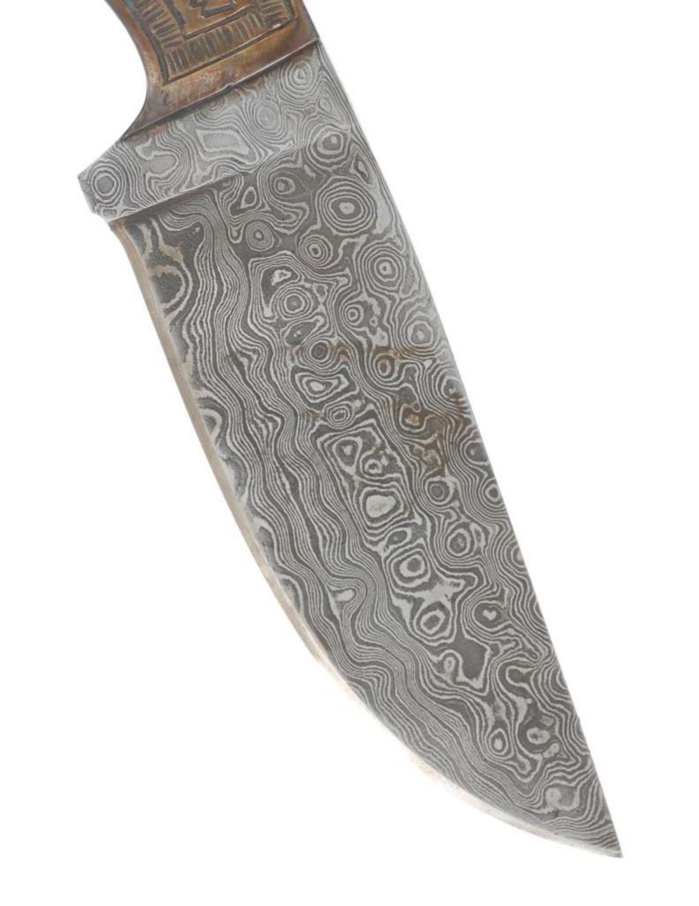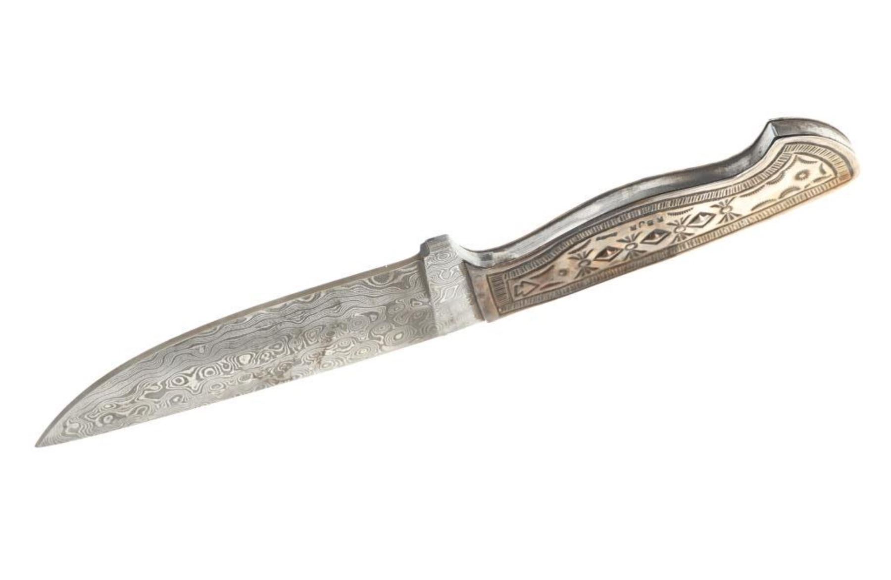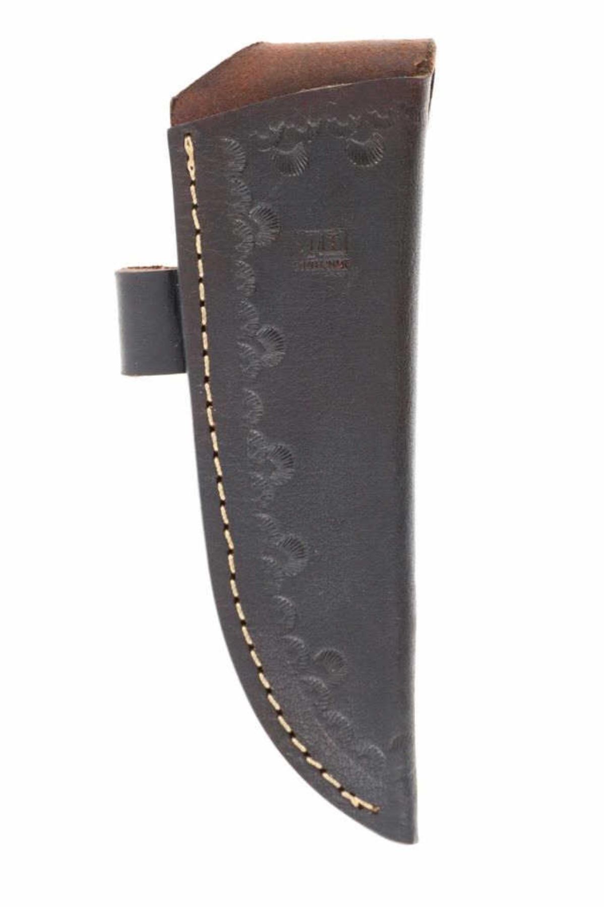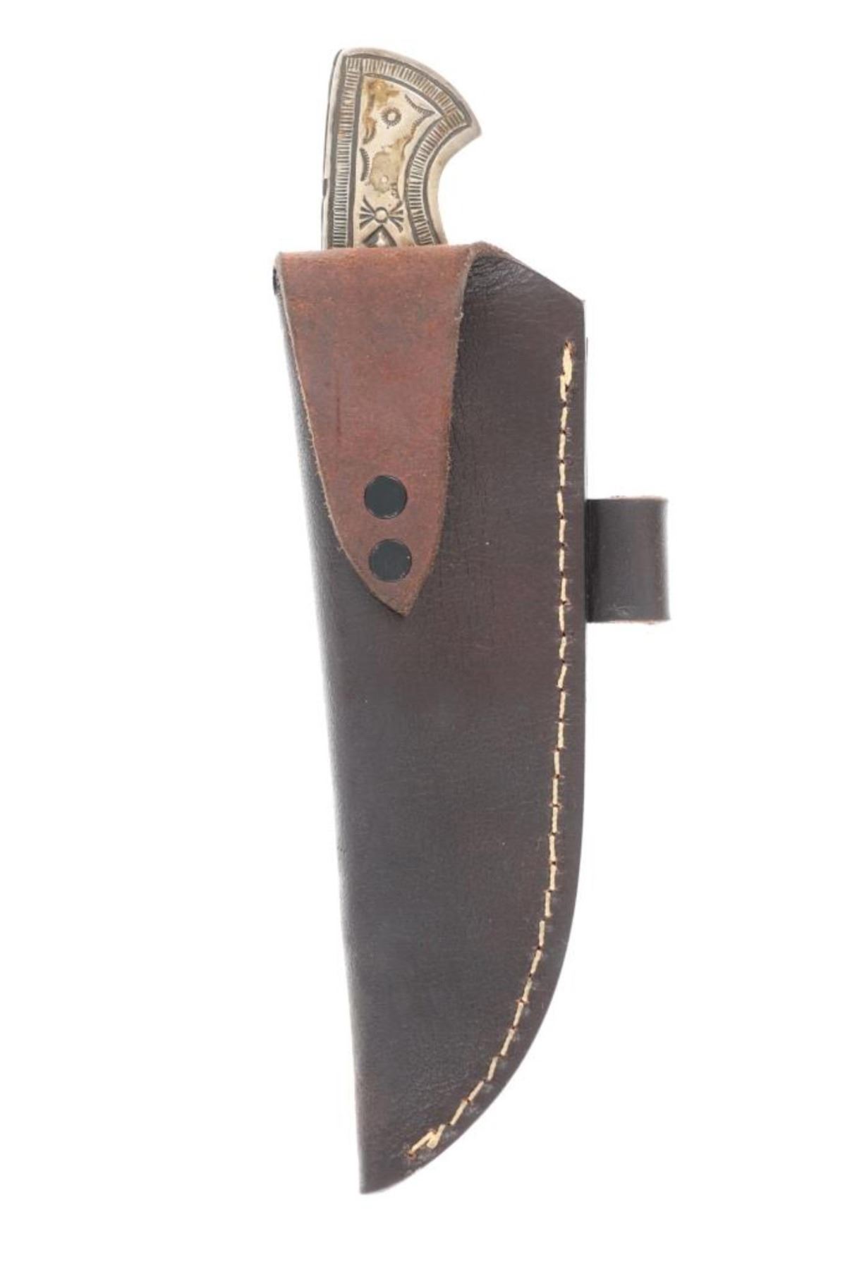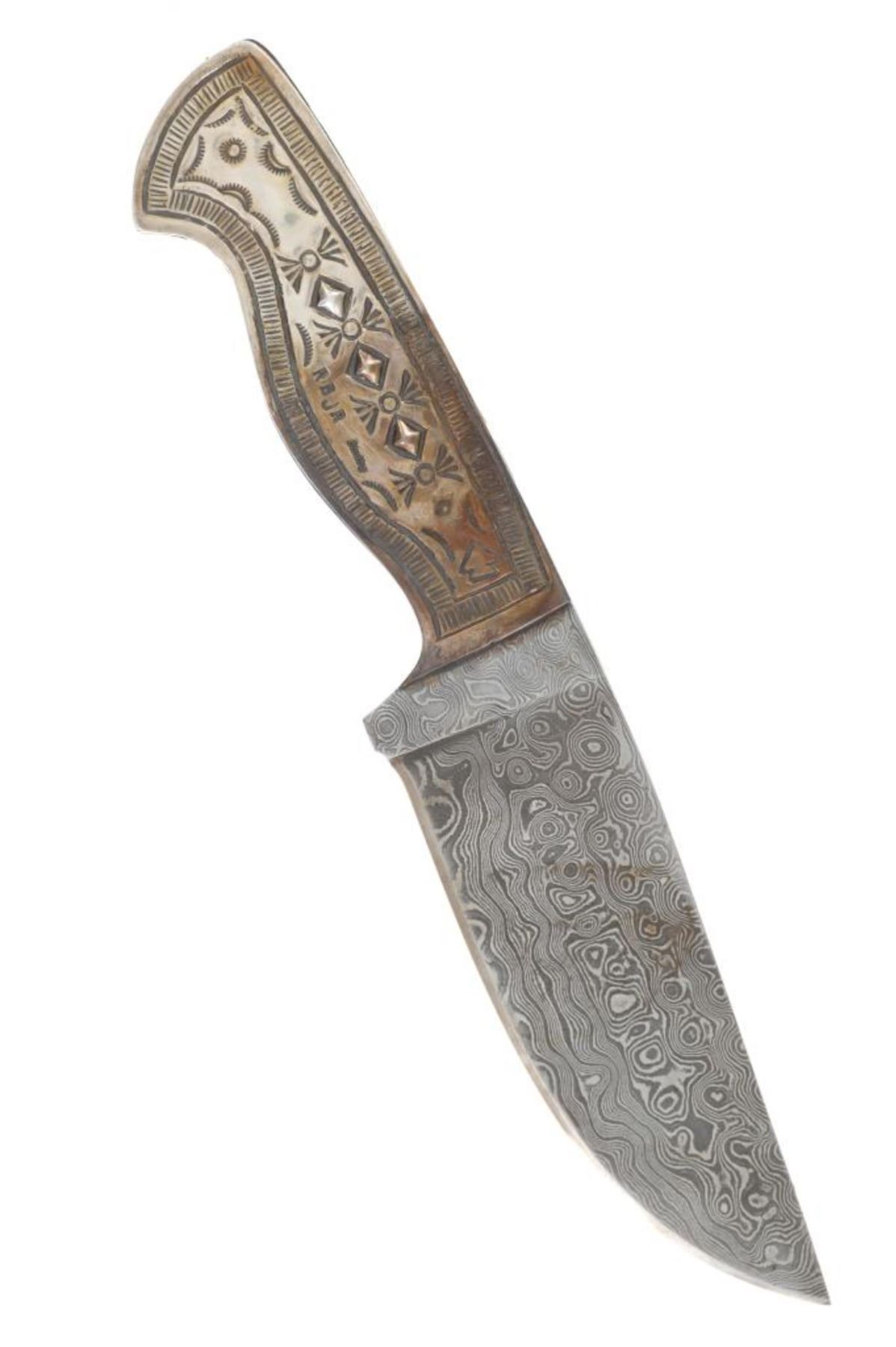 Featured in this lot is this outstanding silversmith work by master Navajo Native American Indian, Randy Begay Jr., set on an original Montana Territory Knives Damascus blade. The knife shows two scales of sterling silver with repoussé, highly figured stamping with Old Pawn stylings. The silver is set onto an original forged Damascus blade from Montana Territory Knives of Bozeman, Montana. The blade bears the “MT (surrounded by an outline of Montana) BOZEMAN MT” forged stamp on the left side of the blade. The silver is stamped on the left side of the handle with Randy Begay Jr.’s signature hallmark, “RBJR Sterling”. The blade is paired with an original, thick, genuine leather Montana Territory Knives Bozeman, MT sheath, which has been hand tooled/stamped and bears the hallmark. The piece is handmade and has small imperfections that comes with any handmade piece, along with some grip scale spacing. These knives are from a limited set and are the only true forged Damascus knives with exceptional Navajo silversmithing from Randy Begay Jr. on the market. The knife itself is 8.75” L with a blade area that is 4 1/8” L. The sheath and blade together are 10.75” L. The blade is of high quality, but the knife is more for display and does not have a warranty as it is art. There is some patina on the sterling silver. The collective weight of this piece is 10lb.
